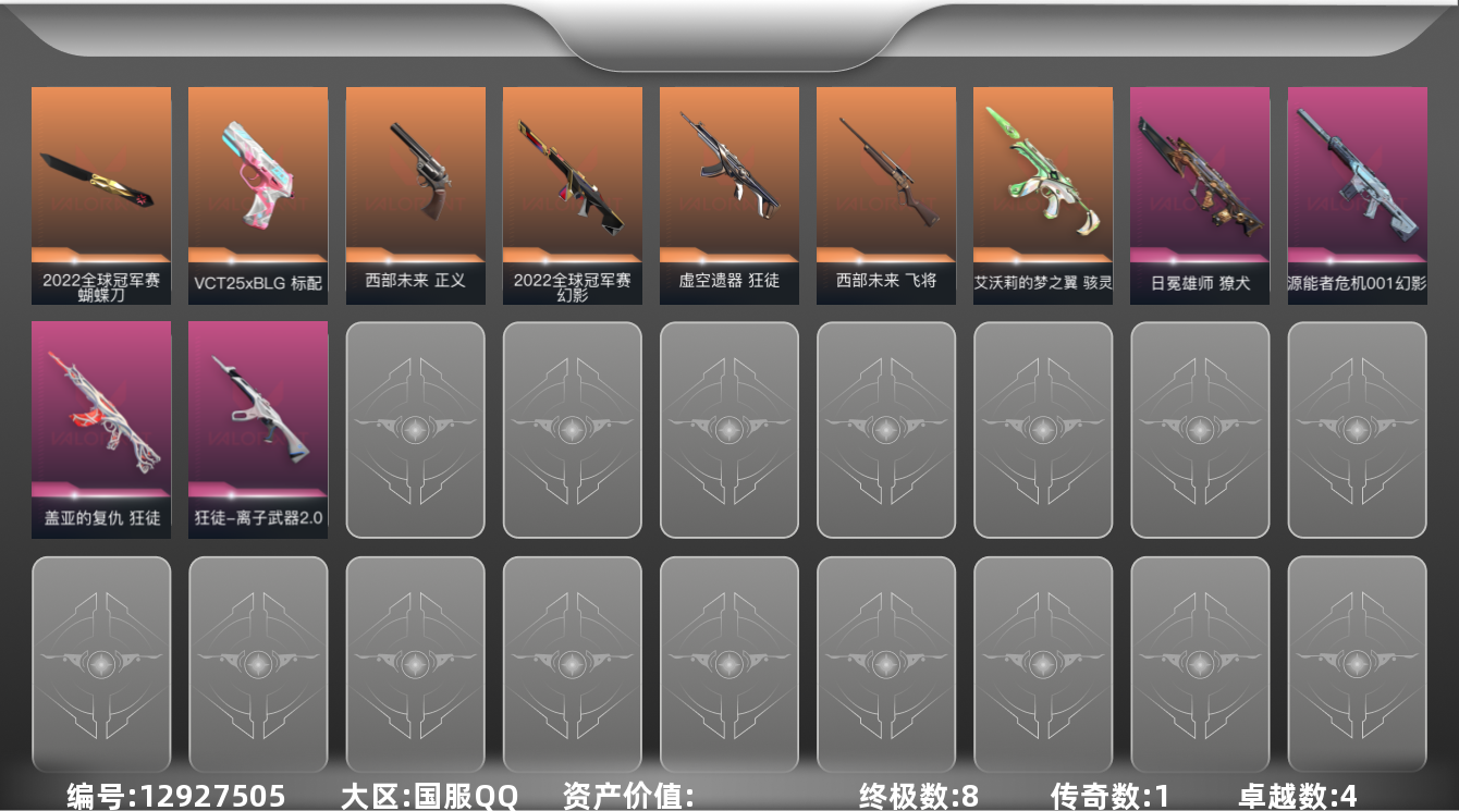 [12927505]【套装】:2022全球冠军赛套装 【英雄】:炼狱,暮蝶,钛狐,壹决,铁臂,捷风,不死鸟,贤者,猎枭,蝰蛇,零,芮娜,奇乐,尚勃勒,霓虹,斯凯,盖可,黑梦 【近战 武器】:近战武器-2022全球冠军赛 蝴蝶刀 【狂徒】:狂徒-虚空遗器,狂徒-盖亚的复仇,狂徒-离子武器//2.0 【幻影】:幻影-2022全球冠军赛,幻影-源能者危机001 【獠犬】:獠犬-日冕雄师 【飞将】:飞将-西部未来 【骇灵】:骇灵-艾沃莉的梦之翼 【VCT手枪】:标配-VCT25 x BLG 【正义】:正义-西部未来 【卡面】:南瓜盛典 卡面,无畏契约GO!第一卷:芮娜 卡面,无畏契约GO!第一卷:零 卡面,《双城之战》金克丝 卡面,夯实根基 卡面,代号红色 卡面,新兵报到 卡面,V契约 卡面,无畏契约 卡面 【喷漆】:霓光四射 喷漆,买装还是存钱 喷漆,关门放狗 喷漆,胜利属于无畏契约 喷漆,GLHF 喷漆,无畏契约 喷漆 【挂饰】:天外飞客 挂饰,红鳞松叶 挂饰,无畏契约 纪念币 挂饰