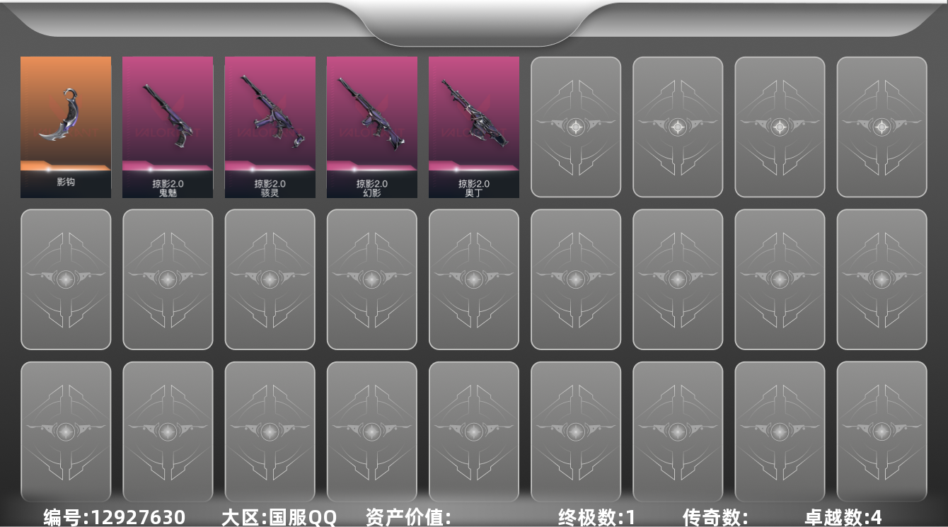 [12927630]【套装】:掠影//2.0套装 【英雄】:炼狱,暮蝶,壹决,捷风,雷兹,不死鸟,贤者,猎枭,零,芮娜,尚勃勒,霓虹,斯凯,黑梦 【近战 武器】:近战武器-影钩 【幻影】:幻影-掠影//2.0 【奥丁】:奥丁-掠影//2.0 【骇灵】:骇灵-掠影//2.0 【鬼魅】:鬼魅-掠影//2.0 【卡面】:树懒大作战 卡面,Clutch 卡面,无畏契约GO!第一卷:零 卡面,《双城之战》金克丝 卡面,别冒尖 卡面,代号红色 卡面,新兵报到 卡面,V契约 卡面,无畏契约 卡面 【喷漆】:霓光四射 喷漆,买装还是存钱 喷漆,关门放狗 喷漆,胜利属于无畏契约 喷漆,GLHF 喷漆,无畏契约 喷漆 【挂饰】:无畏契约GO!第一卷 零 挂饰,天外飞客 挂饰,《双城之战》魄罗 挂饰,无畏契约 纪念币 挂饰