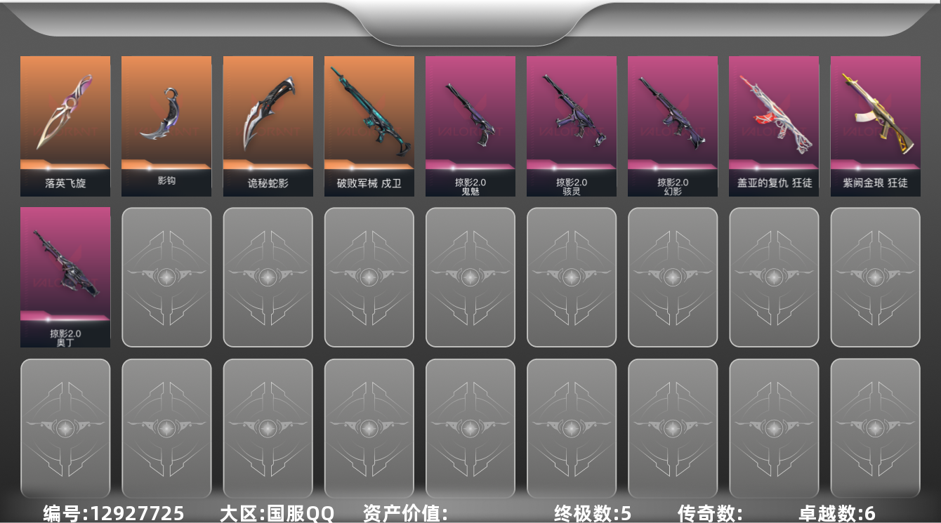 [12927725]【套装】:掠影//2.0套装 【英雄】:幻棱,炼狱,维斯,暮蝶,钛狐,壹决,铁臂,捷风,不死鸟,贤者,猎枭,芮娜,奇乐,尚勃勒,K/O,黑梦 【近战 武器】:近战武器-影钩,近战武器-落英飞旋,近战武器-诡秘蛇影 军刀 【狂徒】:狂徒-盖亚的复仇,狂徒-紫阙金琅,狂徒-诡秘蛇影 【幻影】:幻影-掠影//2.0,幻影-末日之翼 【戍卫】:戍卫-破败军械,戍卫-折光棱晶 【飞将】:飞将-末日之翼 【莽侠】:莽侠-诡秘蛇影 【奥丁】:奥丁-掠影//2.0,奥丁-末日之翼 【判官】:判官-诡秘蛇影 【骇灵】:骇灵-掠影//2.0 【蜂刺】:蜂刺-折光棱晶 【标配】:标配-折光棱晶 【鬼魅】:鬼魅-掠影//2.0,鬼魅-诡秘蛇影 【短炮】:短炮-末日之翼 【卡面】:无畏契约:暮蝶 卡面,树懒大作战 卡面,红鳞松叶 卡面,Clutch 卡面,源能反应 卡面,无畏契约GO!第一卷:芮娜 卡面,无畏契约GO!第一卷:零 卡面,无畏契约GO!第一卷:贤者 卡面,钢锁vs盖可 卡面,代号红色 卡面,新兵报到 卡面,V契约 卡面,无畏契约 卡面 【喷漆】:伤心心 喷漆,审判之爪 喷漆,双击点赞 喷漆,买装还是存钱 喷漆,酷熊冲浪 喷漆,无畏契约GO!第一卷:芮娜 喷漆,松叶 喷漆,又一个梦幻组合 喷漆,胜利属于无畏契约 喷漆,GLHF 喷漆,无畏契约 喷漆 【挂饰】:薰衣草之心 挂饰,天外飞客 挂饰,红鳞松叶 挂饰,《双城之战》魄罗 挂饰,无畏契约 纪念币 挂饰