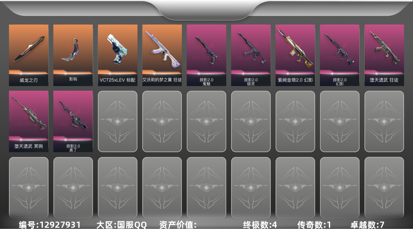 [12927931]【套装】:掠影//2.0套装 【英雄】:炼狱,捷风,幽影,不死鸟,贤者,猎枭,蝰蛇,芮娜,霓虹,斯凯 【近战 武器】:近战武器-影钩,近战武器-威龙之刃 【狂徒】:狂徒-艾沃莉的梦之翼,狂徒-堕天遗武 【幻影】:幻影-紫阙金琅//2.0,幻影-掠影//2.0 【冥驹】:冥驹-堕天遗武 【奥丁】:奥丁-掠影//2.0 【骇灵】:骇灵-掠影//2.0 【VCT手枪】:标配-VCT25 x LEV 【鬼魅】:鬼魅-掠影//2.0 【卡面】:Clutch 卡面,无畏契约GO!第一卷:芮娜 卡面,无畏契约GO!第一卷:零 卡面,《双城之战》金克丝 卡面,代号红色 卡面,新兵报到 卡面,V契约 卡面,无畏契约 卡面 【喷漆】:买装还是存钱 喷漆,胜利属于无畏契约 喷漆,GLHF 喷漆,无畏契约 喷漆 【挂饰】:鱼骨头 挂饰,天外飞客 挂饰,红鳞松叶 挂饰,《双城之战》魄罗 挂饰,无畏契约 纪念币 挂饰