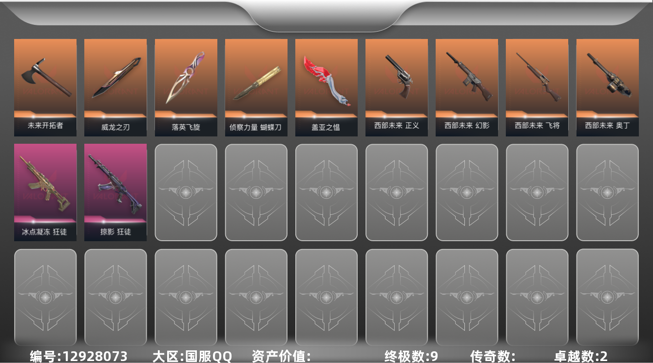 [12928073]【套装】:西部未来套装 【英雄】:幻棱,炼狱,维斯,暮蝶,钛狐,壹决,铁臂,捷风,雷兹,幽影,不死鸟,贤者,猎枭,零,芮娜,奇乐,尚勃勒,霓虹,斯凯,夜露,星礈,K/O,海神,盖可,黑梦 【近战 武器】:近战武器-侦察力量 蝴蝶刀,近战武器-落英飞旋,近战武器-威龙之刃,近战武器-未来开拓者,近战武器-盖亚之愠 【狂徒】:狂徒-冰点凝冻,狂徒-掠影,狂徒-彩虹魔力小白马 【幻影】:幻影-西部未来,幻影-红鳞松叶,幻影-西部未来 【飞将】:飞将-西部未来 【奥丁】:奥丁-西部未来 【雄鹿】:雄鹿-漫天彩霞 【骇灵】:骇灵-晶态集成 【正义】:正义-西部未来,正义-超限闪存 【卡面】:《双城之战》拥抱 卡面,欢迎来到底城 卡面,南瓜盛典 卡面,修车达人 卡面,正义的化身 卡面,时间到 卡面,最高舞台 卡面,声感陷阱设计图 卡面,梦幻奶茶 卡面,源能反应 卡面,零点嗅探设计图 卡面,沙雕爆能器 卡面,无畏契约GO!第一卷:芮娜 卡面,清除名单 卡面,无畏契约GO!第一卷:零 卡面,龍记 卡面,完美调谐 卡面 ,暗枪 卡面,夯实根基 卡面,"Luie" 卡面,热烈欢迎 卡面,铁臂设计图 卡面,代号红色 卡面,新兵报到 卡面,V契约 卡面,无畏契约 卡面 【喷漆】:嘭! 喷漆,都算到了 喷漆,控场勿近 喷漆,小丑猫 喷漆,熊抱 喷漆,超级粉丝 喷漆,捷风差距 喷漆,惊声尖叫 喷漆,拼一枪 喷漆,我的刀呢? 喷漆,新潮流 喷漆,双击点赞 喷漆,买装还是存钱 喷漆,醒狮贺春 喷漆,旅行小熊 喷漆,蕊形灯 喷漆,老铁困了 喷漆,口袋贤者 喷漆,胜利属于无畏契约 喷漆,GLHF 喷漆,无畏契约 喷漆 【挂饰】:《双城之战》小蛋糕 挂饰,第九季//第三幕 纪念币 挂饰,工具腰带 挂饰,熔岩灯 挂饰,第九季//第二幕 纪念币 挂饰,糖葫芦 挂饰,袖珍捷风 挂饰,迷你浓缩 挂饰,Z世代特饮 挂饰,第九季//第一幕 纪念币 挂饰,荧光棒 挂饰,第八季//第三幕 纪念币 挂饰,传世莲华 挂饰,第八季//第二幕 纪念币 挂饰 ,天外飞客 挂饰,好运福爪 挂饰,瞄这里 挂饰,第八季//第一幕 纪念币 挂饰,第七季//第三幕 纪念币 挂饰,幸运中国结 挂饰,无畏契约 纪念币 挂饰