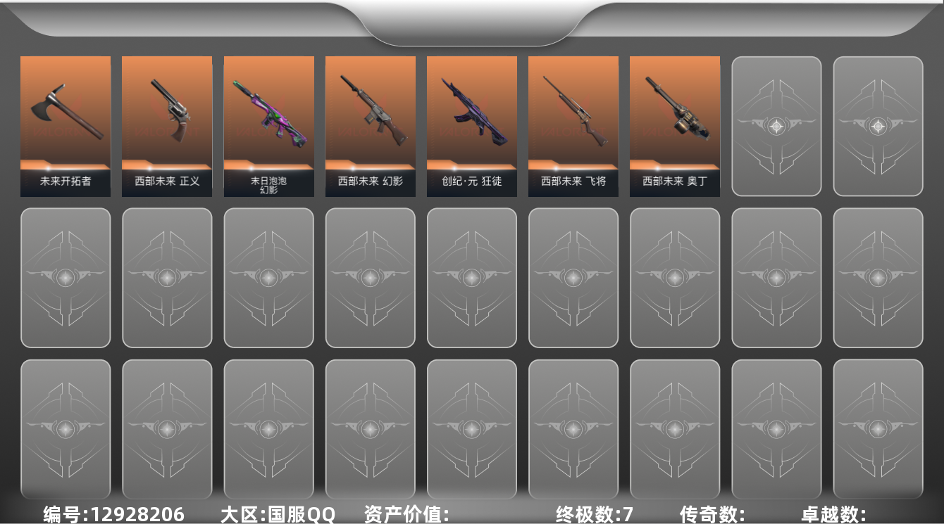 [12928206]【套装】:西部未来套装 【英雄】:幻棱,炼狱,维斯,暮蝶,钛狐,壹决,铁臂,捷风,幽影,不死鸟,贤者,猎枭,零,芮娜,奇乐,尚勃勒,霓虹,斯凯,夜露,盖可,黑梦,钢锁 【近战 武器】:近战武器-未来开拓者 【狂徒】:狂徒-创·纪元 【幻影】:幻影-西部未来,幻影-末日泡泡,幻影-西部未来 【飞将】:飞将-西部未来 【奥丁】:奥丁-西部未来 【正义】:正义-西部未来 【鬼魅】:鬼魅-星云暗涌 【卡面】:精灵大战 卡面,南瓜盛典 卡面,修车达人 卡面,正义的化身 卡面,无畏契约GO!第一卷:芮娜 卡面,无畏契约GO!第一卷:零 卡面,代号红色 卡面,新兵报到 卡面,V契约 卡面,无畏契约 卡面 【喷漆】:控场勿近 喷漆,熊抱 喷漆,双人比心 喷漆,买装还是存钱 喷漆,暴走萝莉 喷漆,胜利属于无畏契约 喷漆,GLHF 喷漆,无畏契约 喷漆 【挂饰】:伞绳 挂饰,第九季//第三幕 纪念币 挂饰,熔岩灯 挂饰,第九季//第二幕 纪念币 挂饰,天外飞客 挂饰,无畏契约 纪念币 挂饰