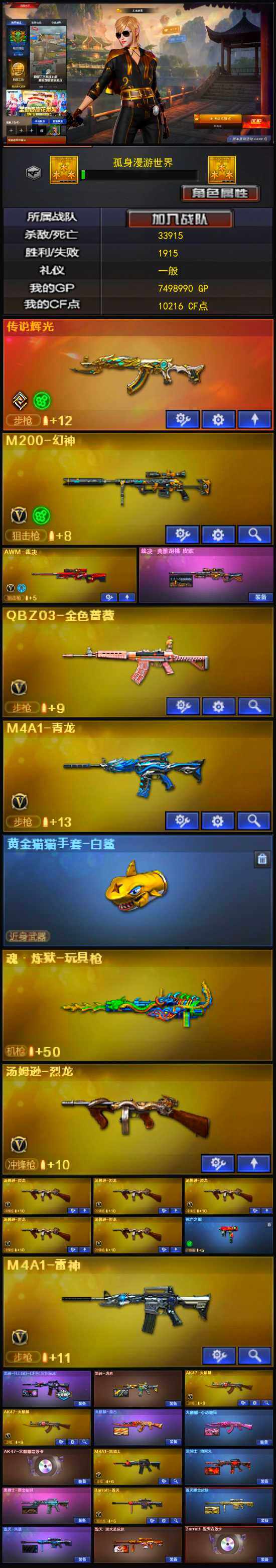 【热门武器】:传说辉光,QBZ03-金色蔷薇,M4A1-青龙,M200-幻神,死亡之眼,M4A1-黑骑士,汤姆逊-烈龙*6,沙鹰-修罗*2,黄金猫猫手套-白鲨