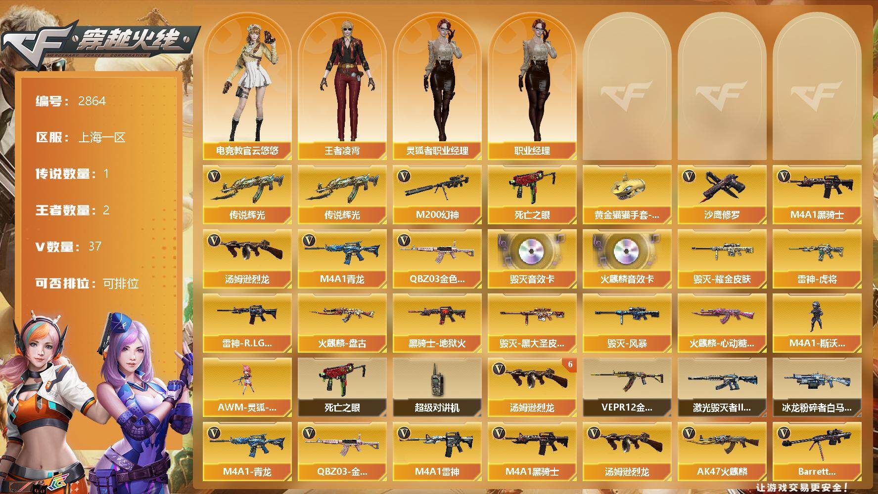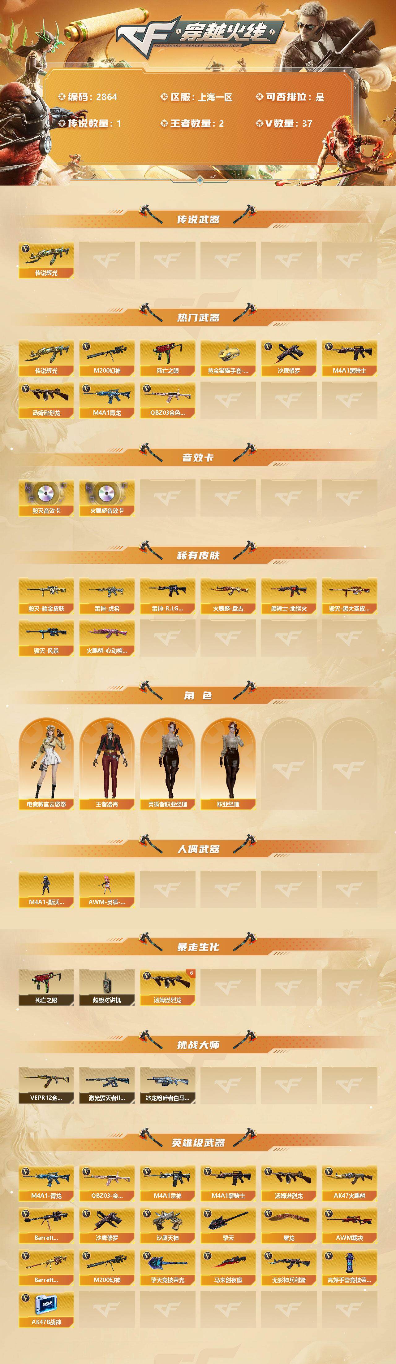[12928079]上海一区-37V-2王者-0炫金 【传说武器】:传说辉光 【热门武器】:传说辉光,QBZ03-金色蔷薇,M4A1-青龙,M200-幻神,死亡之眼,M4A1-黑骑士,汤姆逊-烈龙*6,沙鹰-修罗*2,黄金猫猫手套-白鲨 【音效卡】:AK47-火麒麟音效卡,Barrett-毁灭音效卡 【稀有皮肤】:雷神-虎将,雷神-R.LGD-CFPLS18冠军,火麒麟-盘古,火麒麟-心动糖果,黑骑士-地狱火,毁灭耀金皮肤,毁灭-黑大圣皮肤,毁灭-风暴 【角色】:电竞教官-云悠悠,王者凌霄,灵狐者-职业经理*2 【人偶武器】:M4A1-斯沃特,AWM-灵狐-15周年嘉年华 【暴走生化】:死亡之眼,超级对讲机 【挑战大师】:VEPR-12-金魔,激光毁灭者III-白马银枪,冰龙粉碎者-白马银枪 【英雄级武器】:AK47-火麒麟*2,M4A1-雷神,M4A1-黑骑士,M4A1-青龙,无影-神兵利器,QBZ03-金色蔷薇,AK47-B-战神,Barrett-毁灭,AWM-裁决,M200-幻神,Barrett-朱雀,汤姆逊-烈龙*6,沙鹰-修罗*2,沙鹰-天神*2,屠龙*2,马来剑-夜魔,擎天,擎天-竞技荣光,高爆手雷-竞技荣光 【特殊枪械】:1黑骑士,6烈龙