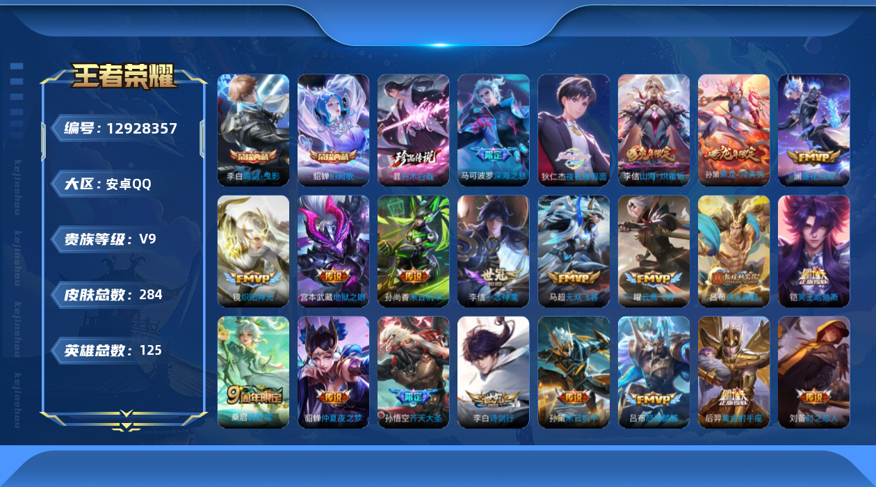[12928357]安卓Q-V9-最强王者段位-125英雄-284皮肤-2典藏-0珍品无双-0无双-1珍品传说-30传说-88史诗