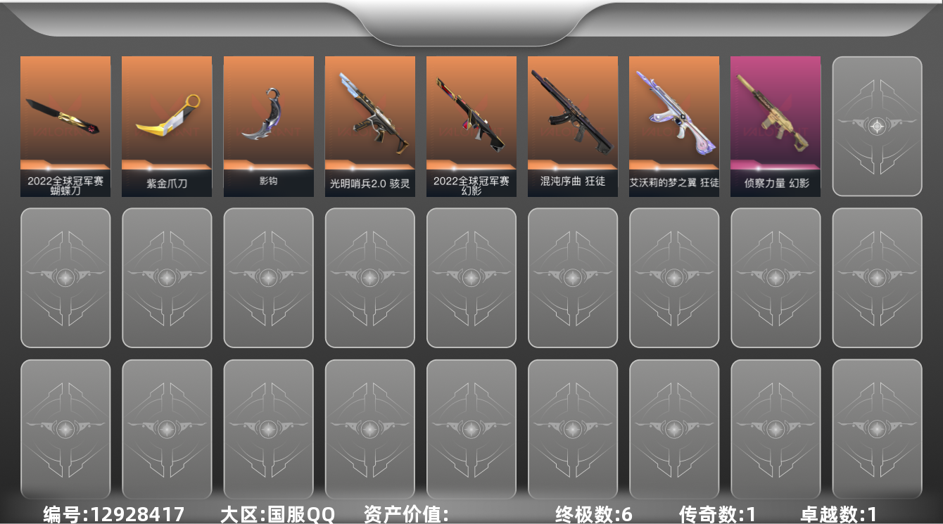 [12928417]【套装】:2022全球冠军赛套装 【英雄】:幻棱,炼狱,暮蝶,捷风,雷兹,不死鸟,贤者,猎枭,芮娜 【近战 武器】:近战武器-2022全球冠军赛 蝴蝶刀,近战武器-影钩,近战武器-紫金爪刀 【狂徒】:狂徒-艾沃莉的梦之翼,狂徒-混沌序曲 【幻影】:幻影-2022全球冠军赛,幻影-侦察力量 【骇灵】:骇灵-光明哨兵//2.0 【卡面】:Clutch 卡面,《双城之战》金克丝 卡面,别冒尖 卡面,代号红色 卡面,新兵报到 卡面,V契约 卡面,无畏契约 卡面 【喷漆】:双击点赞 喷漆,胜利属于无畏契约 喷漆,GLHF 喷漆,无畏契约 喷漆 【挂饰】:无畏契约 纪念币 挂饰
