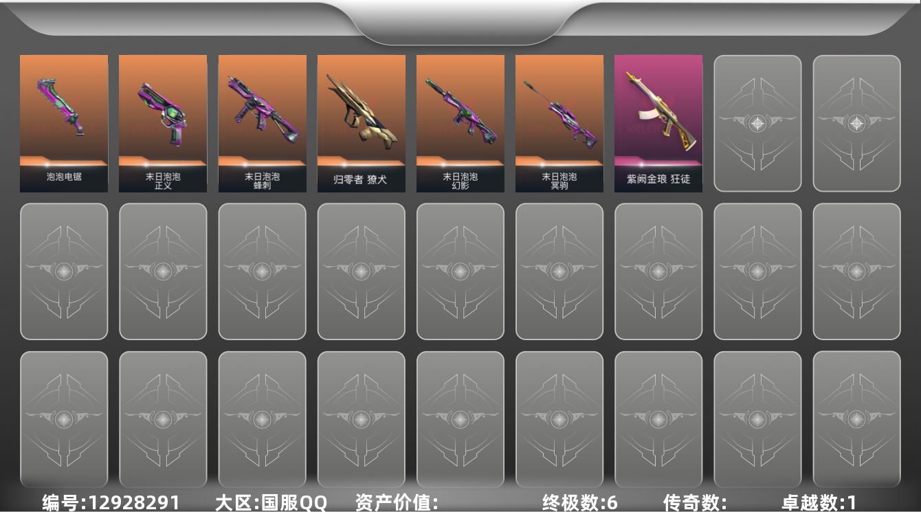 [12928291]【套装】:末日泡泡套装 【英雄】:炼狱,维斯,暮蝶,壹决,捷风,不死鸟,贤者,猎枭,芮娜,尚勃勒,霓虹 【近战 武器】:近战武器-泡泡电锯 【狂徒】:狂徒-紫阙金琅 【幻影】:幻影-末日泡泡 【獠犬】:獠犬-归零者 【冥驹】:冥驹-末日泡泡 【蜂刺】:蜂刺-末日泡泡 【正义】:正义-末日泡泡 【卡面】:树懒大作战 卡面,无畏契约GO!第一卷:芮娜 卡面,无畏契约GO!第一卷:零 卡面,代号红色 卡面,新兵报到 卡面,V契约 卡面,无畏契约 卡面 【喷漆】:买装还是存钱 喷漆,关门放狗 喷漆,无畏契约GO!第一卷:捷风 喷漆,胜利属于无畏契约 喷漆,GLHF 喷漆,无畏契约 喷漆 【挂饰】:无畏契约 纪念币 挂饰