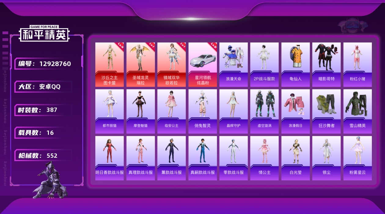 [12928760]素材身法号/沙丘之主-图卡盟(四级)/星河领航(炫晶粉)(六级)/无敌战神框1/满绝世印记13/M416-女娲灵识(九级)/SCAR-L-金蛇镇世(九级)/AKM-幽焰骑士(九级) 安卓 手Q-无敌战神框-3神装-41粉装-31特效枪-16载具-27粉色飞行器-25w热力值-32王牌印记-387套装-552枪皮【红色载具】:星河领航(炫晶粉)(六级)【红色神装等级】:圣域龙灵-瑞拉(一级),镜域双华-欧若拉(一级),沙丘之主-图卡盟(四级)【热门品类】:粉装-梦幻火箭,粉装-繁龙极客,绝对防御上衣,套装-浪漫天命,套装-都市猎人,套装-派对舞王,套装-深海小丑鱼,套装-小丑鱼,套装-奇异狩猎者,角色-军刀雅典娜,套装-胖达圆圆,角色-2P战斗服款,套装-SS1特训,旭日初心兜帽大衣,套装-龟仙人,套装-暗影哥特,套装-浪漫波比,套装-粉红小猪,套装-萌熊伴侣,小恶魔头饰,熔岩游骑兵面罩,熔岩游骑兵连帽夹克【粉色载具】:宾利欧陆GT敞篷(火焰橘),宾利添越(浅瞪羚棕),迈凯伦570S(天际蓝),星河领航(炫晶粉),虚妄之影(炫耀紫),合金龙骨(红),羁绊之心,杜卡迪 Panigale V4(杜卡迪红),幽焰风驰摩托车,鬼马风驰,僚机-萌兔起飞,星梦玉骢,护世瑞兽,晶梦灵驹,冰绡玉鳞,辉羽雀灵自行车【粉色套装】:粉装-粉色回忆,粉装-甜心巧克力,粉装-宝贝奶油派,粉装-天使彩虹糖,粉装-蝶舞迷情,粉装-梦幻火箭,粉装-香水柠檬,粉装-烈焰拳霸,粉装-蜜桃特工,角色-洛天依,角色-零号机款机体服,角色-初号机款机体服,角色-2号机款机体服,粉装-紫电风暴,粉装-筑梦精灵,角色-复仇流浪者,粉装-垂柳戏鸭,粉装-冰川幽秘,角色-歌者泠鸢,粉装-暗夜鎏金,粉装-第五大道,粉装-仲夏莫吉托,粉装-天星战神,粉装-莲影清波,粉装-镜光幻境,角色-圣堂之誓,粉装-繁龙极客,角色-烟云彩露,角色-小蓝,角色-鸢尾晶梦,角色-星梦奇缘,角色-狂花道·不知火舞,角色-千金淑猫,角色-樱桃泡泡,粉装-星穹咏叹调,粉装-幻彩电音,角色-狂魅哈莉,角色-狂魇小丑,角色-羊梦糖心,角色-异瞳寒姬【粉色枪皮等级】:AKM-甜心宝贝(三级),AKM-星际浪客(一级),AKM-幽焰骑士(九级),M16A4-垂柳戏鸭(七级),SCAR-L-甜梦小狐(一级),SCAR-L-金蛇镇世(九级),M416-心