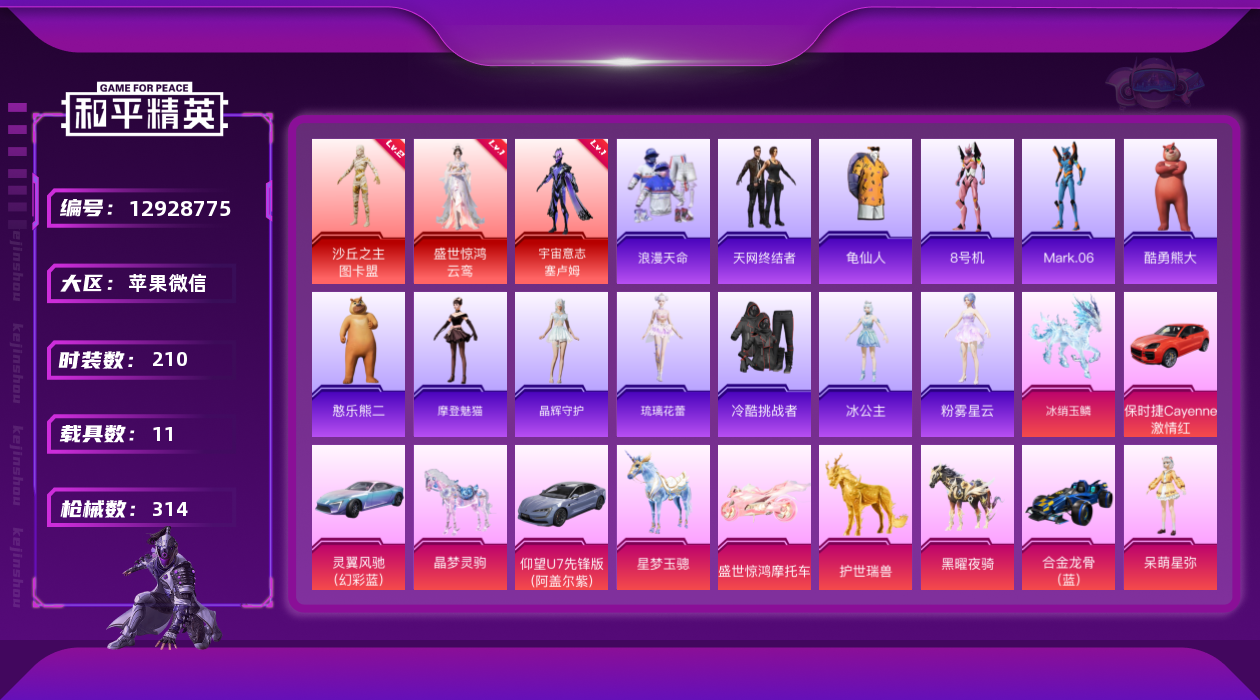 [12928775]素材身法号/无敌战神框1/绝世印记1/地铁满天赋/M416-女娲灵识(九级) 苹果 微信-无敌战神框-3神装-26粉装-17特效枪-11载具-19粉色飞行器-12.2w热力值-16王牌印记-210套装-314枪皮【红色神装等级】:盛世惊鸿-云鸾(一级),宇宙意志-塞卢姆(一级),沙丘之主-图卡盟(二级)【热门品类】:粉装-梦幻火箭,粉装-音爆索尼克,套装-浪漫天命,套装-都市猎人,套装-天网终结者,角色-忠义严颜,套装-龟仙人,角色-8号机,角色-Mark.06【粉色载具】:仰望U7(阿盖尔紫),保时捷Cayenne(激情红),灵翼风驰(幻彩蓝),合金龙骨(蓝),盛世惊鸿摩托车,僚机-圣域龙宝,星梦玉骢,护世瑞兽,晶梦灵驹,黑曜夜骑,冰绡玉鳞【粉色套装】:粉装-极限特训,粉装-甜心巧克力,粉装-宝贝奶油派,粉装-天使彩虹糖,粉装-梦幻火箭,粉装-放客神游,粉装-绚金战神,粉装-甜梦小狐,粉装-冰川红玫,粉装-音爆索尼克,角色-白勺歌姬,角色-呆萌星弥,角色-圣堂之誓,角色-烟云彩露,角色-电磁星,角色-星梦奇缘,角色-初号机 觉醒Ver.,角色-月影灵韵,角色-玄冥寒域,角色-樱桃泡泡,角色-翎光蝶翼,角色-智耀战神,角色-仙女座 瞬,角色-幻海仙踪,角色-宁雨蝶,角色-绯穹魔姬【粉色枪皮等级】:SCAR-L-金蛇镇世(三级),M416-至情至圣(五级),M416-女娲灵识(九级),GROZA-镜光银凌(五级),AUG-星梦奇缘(三级),AUG-暖羊咩咩(五级),UMP45-宇宙意志(三级),P90-冷漠罗丽(六级),Kar98K-创世·救赎(三级),Kar98K-巳巳如意(五级),M24-镜域双华(二级),Mk14-盛世惊鸿(三级),AMR-智耀战神(五级),DP-28-豹影疾电(五级),MG3-辉羽雀灵(三级),烟雾弹-丁香清露(五级),破片手榴弹-热量炸弹(七级)【粉色飞行器】:酣梦熊熊飞行器,齐天大圣飞行器,星夜魔法师飞行翼,沙丘之主天马,镜域双华-灵镜之阶,龙翔九天飞行器,幽焰列车飞行器,凤舞九天飞行器,万象金身飞行器,幻梦之森飞行器,彩虹独角兽飞行器,圣域金龙飞行器,雀灵庇佑飞行器,终晖之翼飞行器,灵猫魔法师飞行器,飞天猪飞行器,灵珠游龙飞行器