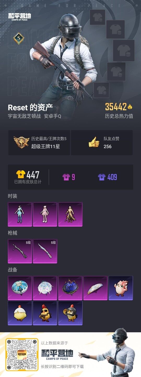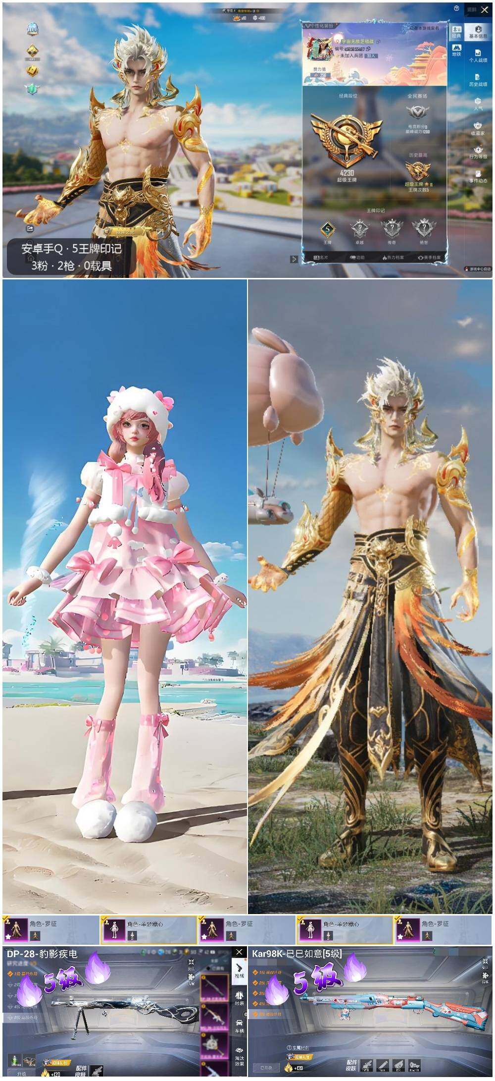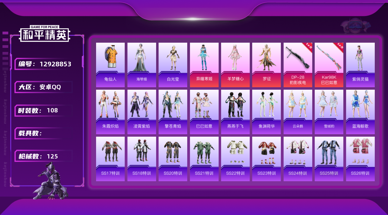 - [12214910]11粉装 4特效枪 2载具 7印记 可二次 可修改实名 身法装备:初号机 觉醒Ver.(新紫螳螂),8号机(新粉螳螂),Mark.06(新蓝螳螂) 优质装备:阿斯顿·马丁DBX(橙),M416心之恋语,梦幻火箭(新101)(新火箭少女101粉色套装),数码大师,宝贝奶油派,向日葵(套装-向日葵先生),冰霜白皇,UMP45恐龙拽拽,M24莲影清波,七级M24-莲影清波,七级M416-心之恋语,千金淑猫,Kar98K-巳巳如意 热门装扮:第五大道,闲梦青缨,美雪,美琪,小蓝,初号机 觉醒Ver.(新紫螳螂),神秘黑猫,软萌银虎,潮萌小黄鸭,万圣娃娃,梦魇先生,爱崽白熊,浪漫波比 载具:俏皮小熊猫 五级特效枪:五级Kar98K-巳巳如意 二级特效枪:二级UMP45-恐龙拽拽 紫色装扮:田园牧歌,轻风白浪,和煦暖阳,SS22特训,白啸长虹,SS23特训,娇憨猪猪,暖心橘喵,萌趣咩咩,暖心熊熊,SS21特训,SS31特训套装,SS2特训,SS3特训,SS4特训,SS5特训,人气偶像,六六大吉,军械专家,冰原使者,,冰川特警,决胜时刻,凛冬战士,刚毅裁决者,北国孤狼,午夜朋克,SS33特训套装,青涩时光,SS20特训,SS15特训,SS16特训,闪金天王,银白舞王,SS13特训,星梦畅游,治愈之星,科技之星,SS14特训,军刀雅典娜,豚鼠丹丹,吉莉礼服,雪兔飞飞,天籁歌者,向日葵先生,阳光火鸡,野性战魂,金鼠迎春,长空猛禽,雪山征服者,雪山精英,霓虹街区,风暴特警,苍穹猎鹰,荣耀,街头潮人,跃动心情,飞行日记,魅力单车,麻辣教官,黄色名流,黄色格斗者,黎明保卫者,龙的传人,龟仙人,冰河战士,龙魂突击队,蝶变,香桃花海,熔岩游骑兵连帽夹克,和平特警,沙漠毒蛇,极地朋克,柠萌假日,派对绅士,海滨突袭者,深蓝色名流,滨海假日,圣诞大吉,坚韧舞者,夜莺强袭者,完美偶像,帅气教官,幻世战舞者,怒火燎原,战地菁英,探宝勇士,攀登者,滨海厨神,绮丽涂鸦,甜蜜菠萝,疯狂小兔子,破蛋小黄鸡,神秘领域,游猎者,福星高照,空岛之星,竞技勇士朋克,王牌教练,牛气冲天,灼焰舞者,热血青春,燃烧卡路里,牛气满满,猛禽,特工青苹果,特战英豪,特战装甲,狂战萌兔,镭射皇者,雏菊兔兔,萝兰蝴蝶,SS29特训,达芬奇,多纳泰罗,星途旅人,白光莹,纯真浪花,热情海星,曼妙人鱼,SS28特训,8号机(新粉螳螂),