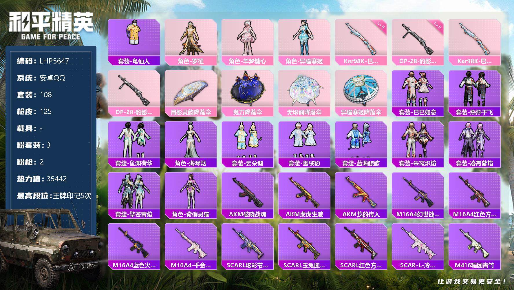 [12928853]地铁满天赋 安卓 手Q-3粉装-2特效枪-3.5w热力值-5王牌印记-108套装-125枪皮【热门品类】:套装-龟仙人【粉色套装】:角色-罗征,角色-羊梦糖心,角色-异瞳寒姬【粉色枪皮等级】:Kar98K-巳巳如意(五级),DP-28-豹影疾电(五级)
