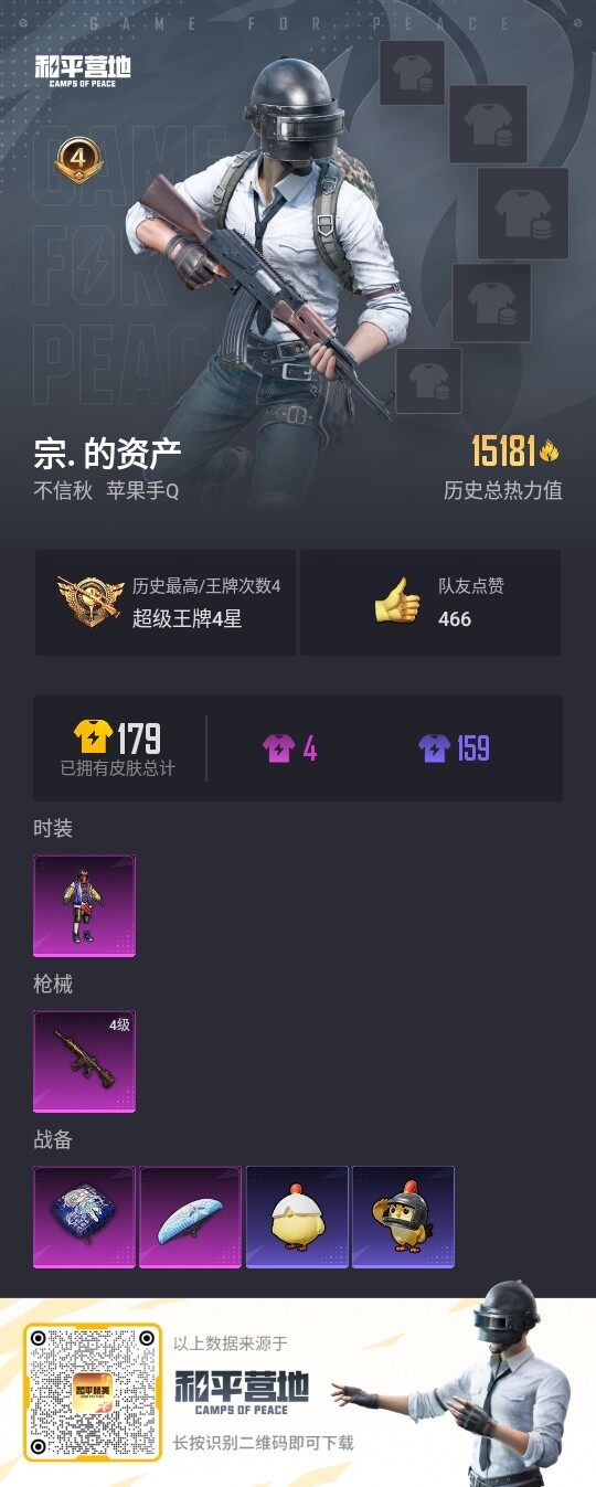 - PX_2106303-安卓QQ 历史总热力值:45355 粉装数量:4 特效枪数量:3 载具数量:2 王牌印记:4 历史最高段位:卓越王牌7星 套装数量:110 时装数量:460 枪械数量:131 战备数量:93 装备数量:137 载具:萌喵橘座,玛莎拉蒂Ghibli(粉) 时装:套装-极致幻想,套装-梦幻火箭,套装-深海曼妙,套装-金属狂野,套装-SS11特训,套装-SS12特训,套装-SS15