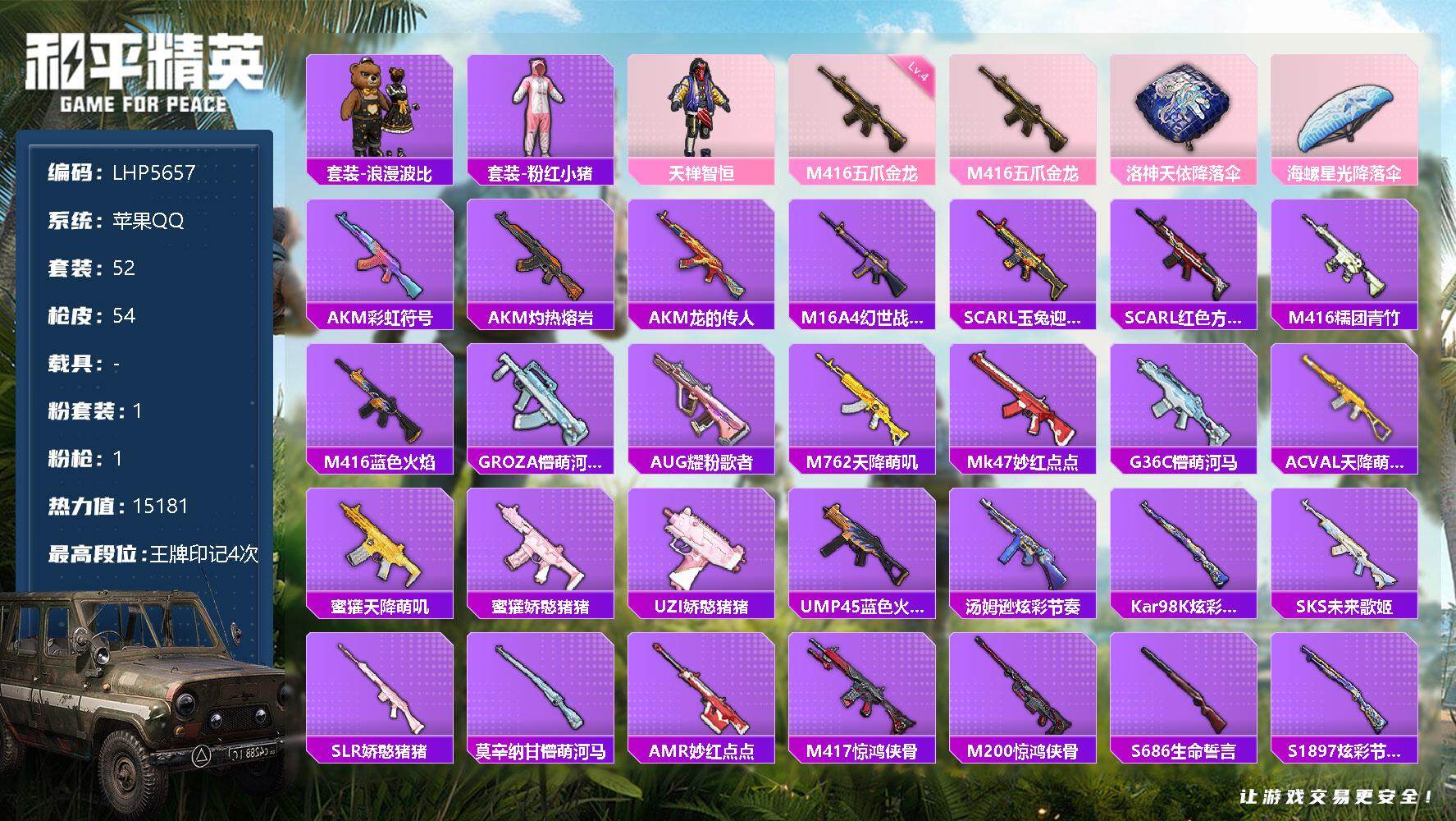 [12928835]苹果 手Q-1粉装-1特效枪-1.5w热力值-4王牌印记-52套装-54枪皮【热门品类】:套装-浪漫波比,套装-粉红小猪【粉色套装】:粉装-天禅智恒【粉色枪皮等级】:M416-五爪金龙(四级)
