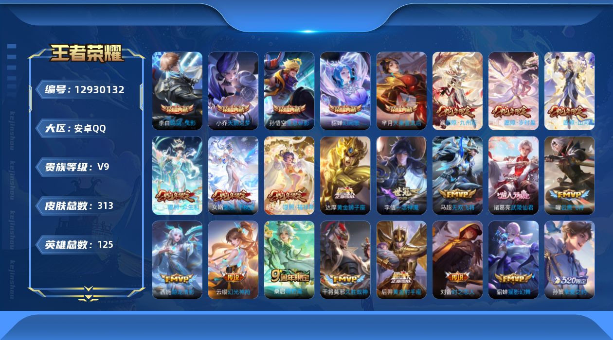 [12930132]安卓Q-V9-至尊星耀II段位-125英雄-313皮肤-5典藏-0珍品无双-0无双-0珍品传说-23传说-99史诗