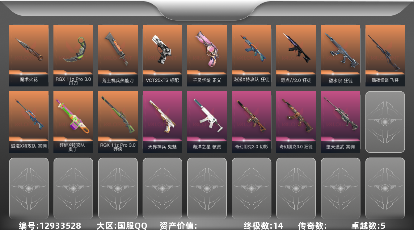 [12933528]【套装】:滋滋X特攻队套装 【英雄】:炼狱,暮蝶,壹决,铁臂,捷风,幽影,不死鸟,贤者,猎枭,蝰蛇,零,芮娜,尚勃勒,霓虹,夜露,K/O,盖可,黑梦,钢锁 【近战 武器】:近战武器-魔术火花,近战武器-嘟昂嘟昂超弹力水球拳套,近战武器-RGX 11z Pro//3.0 爪刀,近战武器-荒土机兵 热能刀,近战武器-魔术火花 【狂徒】:狂徒-奇点//2.0,狂徒-塑水宗,狂徒-滋滋X特攻队,狂徒-奇幻朋克//3.0,狂徒-荒土机兵 【幻影】:幻影-奇幻朋克//3.0,幻影-纳米打击 【戍卫】:戍卫-逆冲蛮牛 【獠犬】:獠犬-逆冲蛮牛 【冥驹】:冥驹-滋滋X特攻队,冥驹-堕天遗武,冥驹-荒土机兵 【飞将】:飞将-黯夜怪谈 【莽侠】:莽侠-RGX 11z Pro//3.0 【奥丁】:奥丁-砰砰X特攻队,奥丁-纳米打击 【判官】:判官-纳米打击x 【雄鹿】:雄鹿-逆冲蛮牛 【骇灵】:骇灵-海洋之星,骇灵-荒土机兵 【标配】:标配-荒土机兵 【VCT手枪】:标配-VCT25 x TS 【正义】:正义-千灵华绽,正义-纳米打击 【鬼魅】:鬼魅-天界神兵 【狂怒】:狂怒-逆冲蛮牛 【卡面】:终章:激斗汉堡 卡面,进入射程 卡面,分崩离析 卡面,纳米打击 卡面,抑制技术 卡面,激斗汉堡 卡面,瓦娃脸雪糕 P2 卡面,从黄昏到黎明 卡面,荒土机兵 卡面,银弹猎手 卡面,逆冲蛮牛 卡面,《双城之战》拥抱 卡面,精灵大战 卡面,欢迎来到底城 卡面,南瓜盛典 卡面,修车达人 卡面,正义的化身 卡面,梦幻奶茶 卡面,无畏契约GO!第一卷:芮娜 卡面,无畏契约GO!第一卷:零 卡面,代号红色 卡面,新兵报到 卡面,V契约 卡面,无畏契约 卡面 【喷漆】:小小心意 喷漆,战“素”兔 喷漆,宇宙的指引 喷漆,请求重启 喷漆,逆冲蛮牛 喷漆,纳米打击 喷漆,鼻尖上的蝴蝶 喷漆,简笔画黯兽 喷漆,独守蝰腹 喷漆,他们将落荒而逃 喷漆,通缉:战术企鹅 喷漆,荒土机兵 喷漆,别挡我吃球! 喷漆,嗨宝南瓜灯 喷漆,嘭! 喷漆,都算到了 喷漆,控场勿近 喷漆,熊抱 喷漆,买装还是存钱 喷漆,无畏契约GO!第一卷:零 喷漆,胜利属于无畏契约 喷漆,GLHF 喷漆,无畏契约 喷漆 【挂饰】:终章:猫猫木乃伊 挂饰,荒土机兵 挂饰,悠闲鸡块 挂饰,猫猫木乃伊 挂饰,水壶 挂饰,纳米打击 挂饰,逆冲蛮牛 挂饰,可爱糖