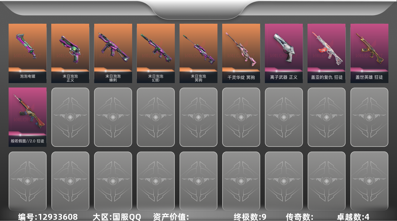 [12933608]【套装】:2025全球冠军赛套装,末日泡泡套装 【英雄】:炼狱,暮蝶,壹决,铁臂,捷风,幽影,不死鸟,贤者,猎枭,芮娜,尚勃勒,霓虹,斯凯,夜露,K/O,盖可,钢锁 【近战 武器】:近战武器-2025全球冠军赛 蝴蝶刀,近战武器-泡泡电锯 【狂徒】:狂徒-2025全球冠军赛,狂徒-般若假面//2.0,狂徒-盖世英雄,狂徒-盖亚的复仇,狂徒-冬季仙境,狂徒-诡秘蛇影 【幻影】:幻影-末日泡泡 【戍卫】:戍卫-折光棱晶 【冥驹】:冥驹-千灵华绽,冥驹-末日泡泡 【飞将】:飞将-末日之翼 【莽侠】:莽侠-诡秘蛇影 【奥丁】:奥丁-末日之翼 【判官】:判官-诡秘蛇影 【蜂刺】:蜂刺-末日泡泡,蜂刺-折光棱晶 【标配】:标配-折光棱晶 【正义】:正义-末日泡泡,正义-离子武器 【短炮】:短炮-末日之翼 【卡面】:树懒大作战 卡面,Clutch 卡面,无畏契约GO!第一卷:芮娜 卡面,无畏契约GO!第一卷:零 卡面,无垠星环 卡面,《双城之战》金克丝 卡面,代号红色 卡面,新兵报到 卡面,V契约 卡面,无畏契约 卡面 【喷漆】:买装还是存钱 喷漆,关门放狗 喷漆,放下武器 喷漆,胜利属于无畏契约 喷漆,GLHF 喷漆,无畏契约 喷漆 【挂饰】:鱼骨头 挂饰,动力机箱 挂饰,天外飞客 挂饰,《双城之战》魄罗 挂饰,无畏契约 纪念币 挂饰