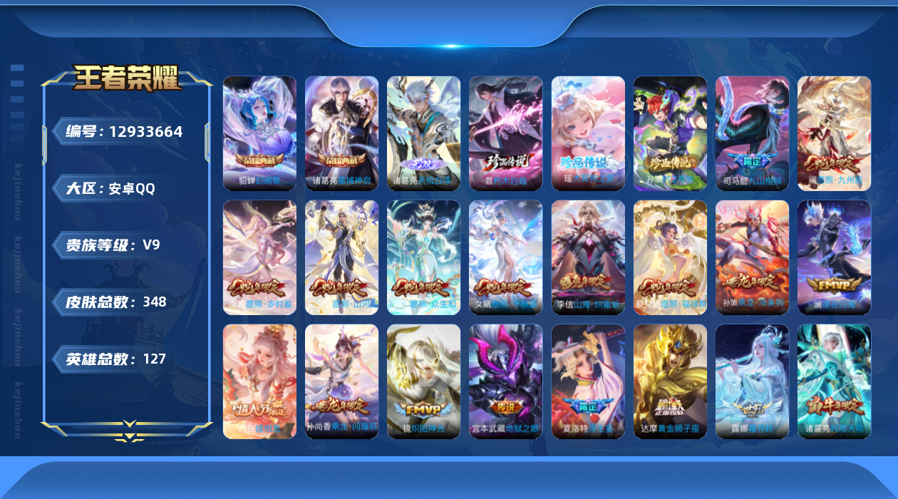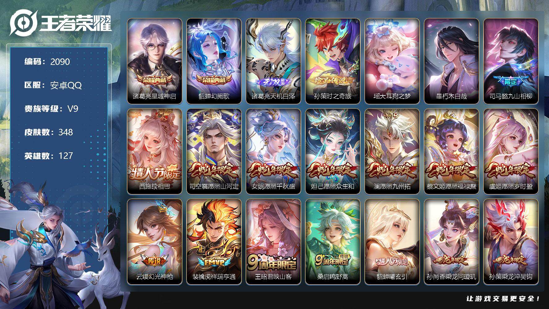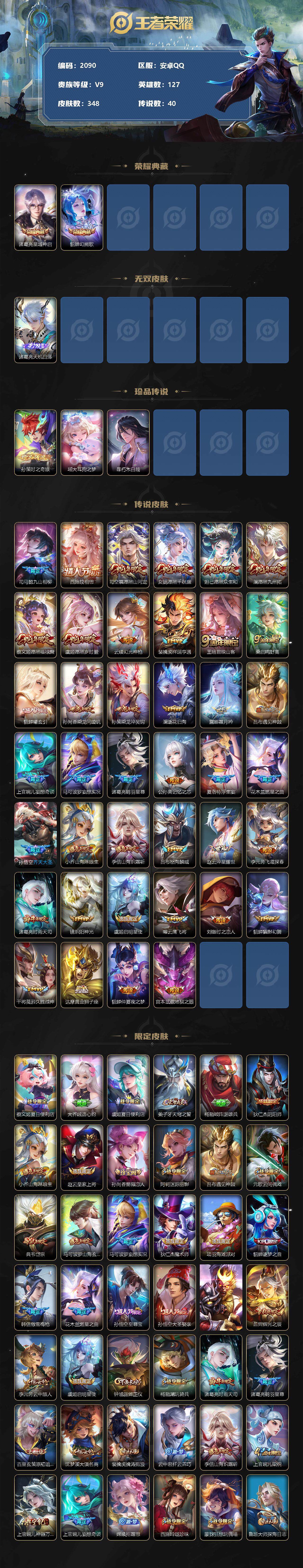 [12933664]安卓Q-V9-最强王者段位-127英雄-348皮肤-2典藏-0珍品无双-1无双-3珍品传说-40传说-87史诗