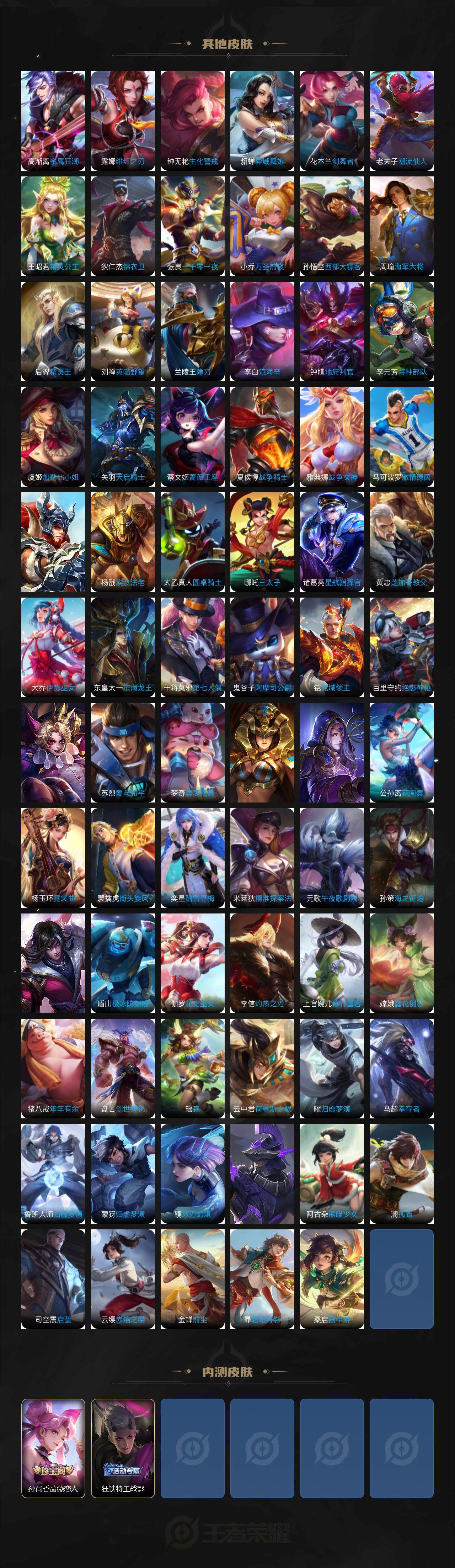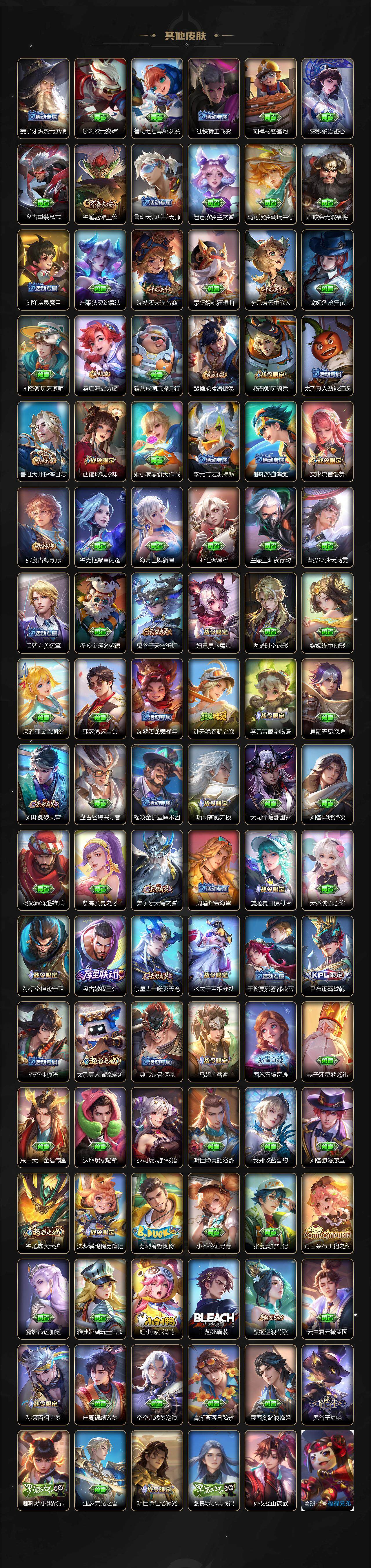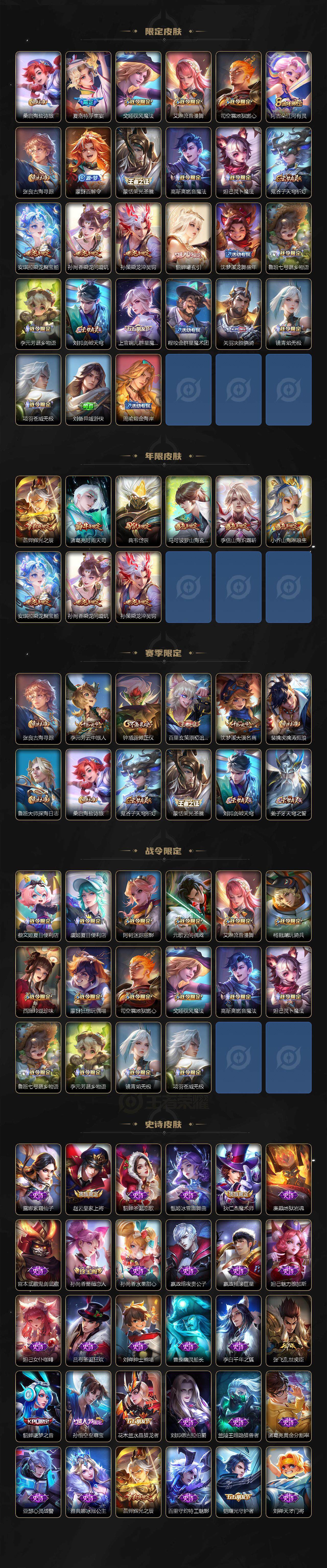 【限定皮肤】:蔡文姬夏日便利店,大乔绒语心约,虞姬夏日便利店,姜子牙天穹之誓,杨戬破阵退雄兵,狄仁杰阴阳师,小乔山海琳琅生,赵云皇家上将,孙尚香蔷薇恋人,阿轲迷踪丽影,吕布遇见神鼓,元歌云间偶戏,典韦岱宗,马可波罗山海玄木吟,马可波罗妄想实况,狄仁杰魔术师,项羽海滩派对,貂蝉逐梦之音,韩信傲雪梅枪,花木兰燃星之曲,孙悟空至尊宝,孙悟空大圣娶亲,孙悟空齐天大圣,后羿辉光之辰,李元芳云中旅人,虞姬启明星使,钟馗驱傩正仪,杨戬潮玩骑兵,诸葛亮时雨天司,诸葛亮鹤羽星尊,百里玄策原初追逐者,沈梦溪大漠名商,裴擒虎擒涛扼浪,云中君纤云弄巧,李信山海炽霜斩,上官婉儿梁祝,上官婉儿神器万象笔,上官婉儿妄想奇谈,嫦娥拒霜思,西施玲珑珍味,蒙犽狂想玩偶喵,鲁班大师探海日志,桑启海盐诗旅,夏洛特浮生妄,戈娅驭风魔法,艾琳流音漫舞,司空震地狱燃心,阿古朵江河有灵,张良古海寻踪,蒙犽百解令,蒙恬荣光圣徽,高渐离燃音魔法,妲己灵卜魔法,鬼谷子天穹祈灯,安琪拉乘龙聚宝船,孙尚香乘龙问璇玑,孙策乘龙淬吴钩,貂蝉曦玄引,沈梦溪龙舞盛年,鲁班七号蔬乡物语,李元芳蔬乡物语,刘邦剑破天穹,上官婉儿群星魔术团,程咬金群星魔术团,关羽决胜骁骑,镜青焰无极,项羽苍威无极,刘备异域游侠,周瑜熔金海岸