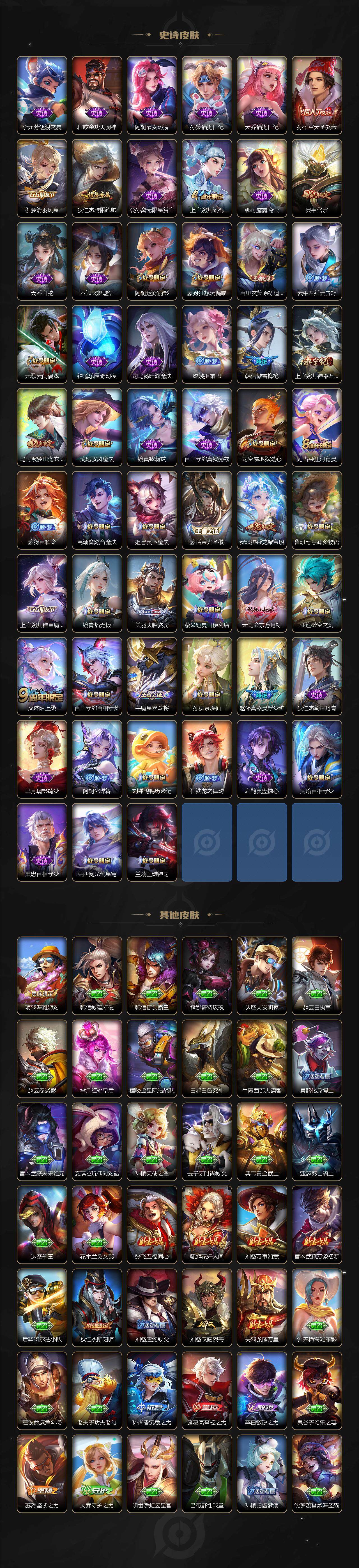 [12933664]安卓Q-V9-最强王者段位-127英雄-348皮肤-2典藏-0珍品无双-1无双-3珍品传说-40传说-87史诗 【英雄全皮】:司马懿全皮,孙权全皮,司空震全皮,戈娅全皮,空空儿全皮 【荣耀典藏】:诸葛亮星域神启,貂蝉幻阙歌 【无双皮肤】:诸葛亮天机白泽 【珍品传说】:孙策时之奇旅,瑶大耳狗之梦,暃朽木白哉 【传说皮肤】:司马懿九山相柳,西施续相思,司空震愿照山河定,女娲愿照千秋盛,妲己愿照众生和,澜愿照九州拓,蔡文姬愿照福禄聚,虞姬愿照岁时盈,云缨幻光神枪,裴擒虎祥瑞亨通,王昭君映山客,桑启鸣野蒿,貂蝉曦玄引,孙尚香乘龙问璇玑,孙策乘龙淬吴钩,澜逐花归海,露娜霜月吟,吕布遇见神鼓,上官婉儿妄想奇谈,马可波罗妄想实况,诸葛亮鹤羽星尊,公孙离记忆之芯,夏洛特浮生妄,花木兰燃星之曲,孙悟空齐天大圣,小乔山海琳琅生,李信山海炽霜斩,吕布怒海麟威,赵云淬星耀世,李元芳飞鸢探春,诸葛亮时雨天司,镜炽阳神光,虞姬启明星使,曜云鹰飞将,刘备时之恋人,貂蝉猫影幻舞,干将莫邪久胜战神,达摩黄金狮子座,貂蝉仲夏夜之梦,宫本武藏地狱之眼 【限定皮肤】:蔡文姬夏日便利店,大乔绒语心约,虞姬夏日便利店,姜子牙天穹之誓,杨戬破阵退雄兵,狄仁杰阴阳师,小乔山海琳琅生,赵云皇家上将,孙尚香蔷薇恋人,阿轲迷踪丽影,吕布遇见神鼓,元歌云间偶戏,典韦岱宗,马可波罗山海玄木吟,马可波罗妄想实况,狄仁杰魔术师,项羽海滩派对,貂蝉逐梦之音,韩信傲雪梅枪,花木兰燃星之曲,孙悟空至尊宝,孙悟空大圣娶亲,孙悟空齐天大圣,后羿辉光之辰,李元芳云中旅人,虞姬启明星使,钟馗驱傩正仪,杨戬潮玩骑兵,诸葛亮时雨天司,诸葛亮鹤羽星尊,百里玄策原初追逐者,沈梦溪大漠名商,裴擒虎擒涛扼浪,云中君纤云弄巧,李信山海炽霜斩,上官婉儿梁祝,上官婉儿神器万象笔,上官婉儿妄想奇谈,嫦娥拒霜思,西施玲珑珍味,蒙犽狂想玩偶喵,鲁班大师探海日志,桑启海盐诗旅,夏洛特浮生妄,戈娅驭风魔法,艾琳流音漫舞,司空震地狱燃心,阿古朵江河有灵,张良古海寻踪,蒙犽百解令,蒙恬荣光圣徽,高渐离燃音魔法,妲己灵卜魔法,鬼谷子天穹祈灯,安琪拉乘龙聚宝船,孙尚香乘龙问璇玑,孙策乘龙淬吴钩,貂蝉曦玄引,沈梦溪龙舞盛年,鲁班七号蔬乡物语,李元芳蔬乡物语,刘邦剑破天穹,上官婉儿群星魔术团,程咬金群星魔术团,关羽决胜骁骑,镜青焰无极,项羽苍威无极,刘备异域游侠,周瑜熔金海岸