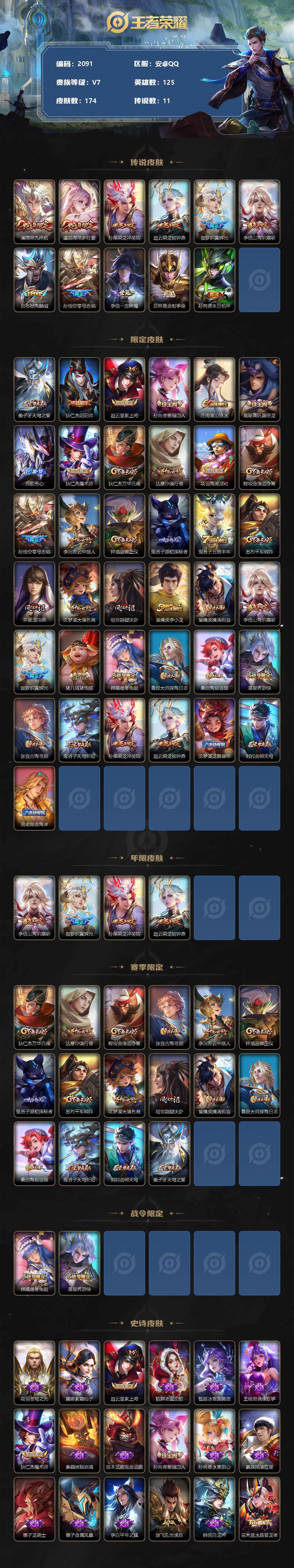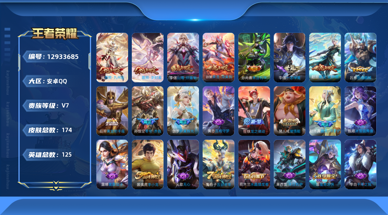 [12933685]安卓Q-V6-至尊星耀V段位-125英雄-174皮肤-0典藏-0珍品无双-0无双-0珍品传说-11传说-33史诗
