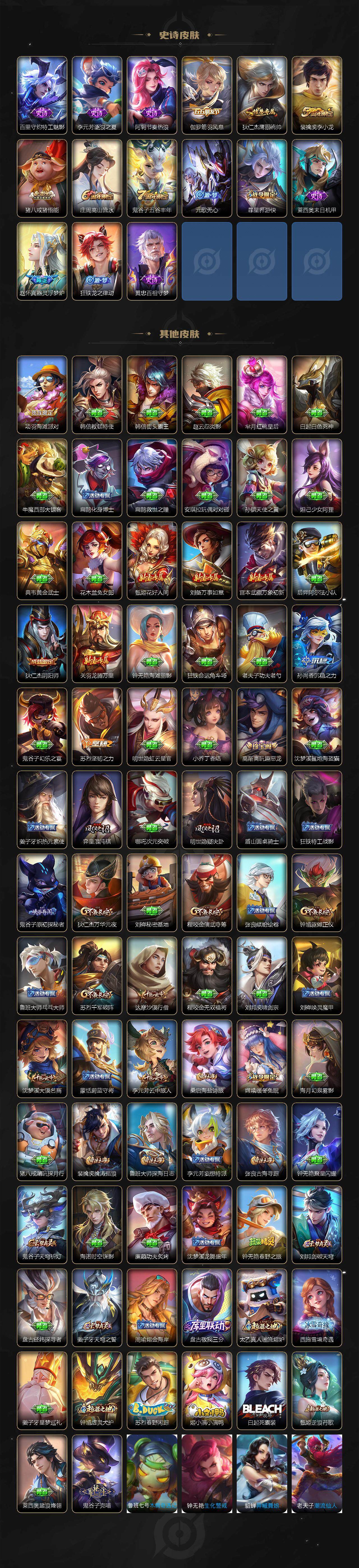 【史诗皮肤】:项羽苍穹之光,露娜紫霞仙子,赵云皇家上将,貂蝉圣诞恋歌,甄姬冰雪圆舞曲,王昭君偶像歌手,狄仁杰魔术师,廉颇地狱岩魂,宫本武藏鬼剑武藏,孙尚香蔷薇恋人,孙尚香水果甜心,嬴政摇滚巨星,墨子龙骑士,墨子金属风暴,李白千年之狐,张飞乱世虎臣,韩信白龙吟,花木兰水晶猎龙者,百里守约特工魅影,李元芳逐浪之夏,阿轲节奏热浪,伽罗箭羽风息,狄仁杰鹰眼统帅,裴擒虎李小龙,猪八戒猪悟能,庄周高山流水,鬼谷子五谷丰年,元歌无心,暃星界游侠,莱西奥末日机甲,赵怀真器灵浮梦炉,狂铁龙之律动,黄忠百相守梦