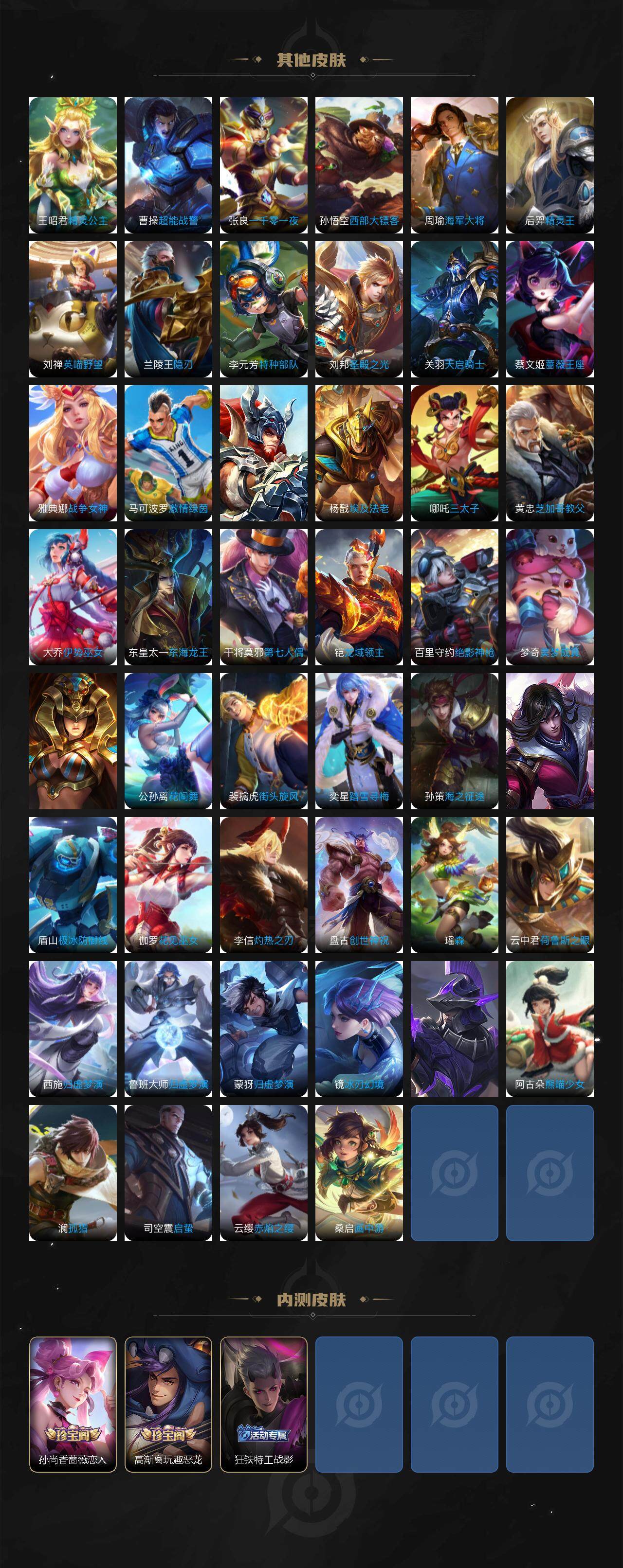 【限定皮肤】:姜子牙天穹之誓,狄仁杰阴阳师,赵云皇家上将,孙尚香蔷薇恋人,庄周高山流水,高渐离玩趣恶龙,元歌无心,狄仁杰魔术师,狄仁杰万华元夜,达摩沙漠行僧,项羽海滩派对,程咬金演武夺筹,孙悟空零号赤焰,李元芳云中旅人,钟馗驱傩正仪,鬼谷子原初探秘者,鬼谷子五谷丰年,苏烈千军破阵,弈星混沌棋,沈梦溪大漠名商,明世隐疑决卦,裴擒虎李小龙,裴擒虎擒涛扼浪,李信山海炽霜斩,伽罗炽翼辉光,猪八戒猪悟能,嫦娥暖冬兔眠,鲁班大师探海日志,桑启海盐诗旅,暃星界游侠,张良古海寻踪,鬼谷子天穹祈灯,孙策乘龙淬吴钩,赵云乘龙铭钟鼎,沈梦溪龙舞盛年,刘邦剑破天穹,周瑜熔金海岸