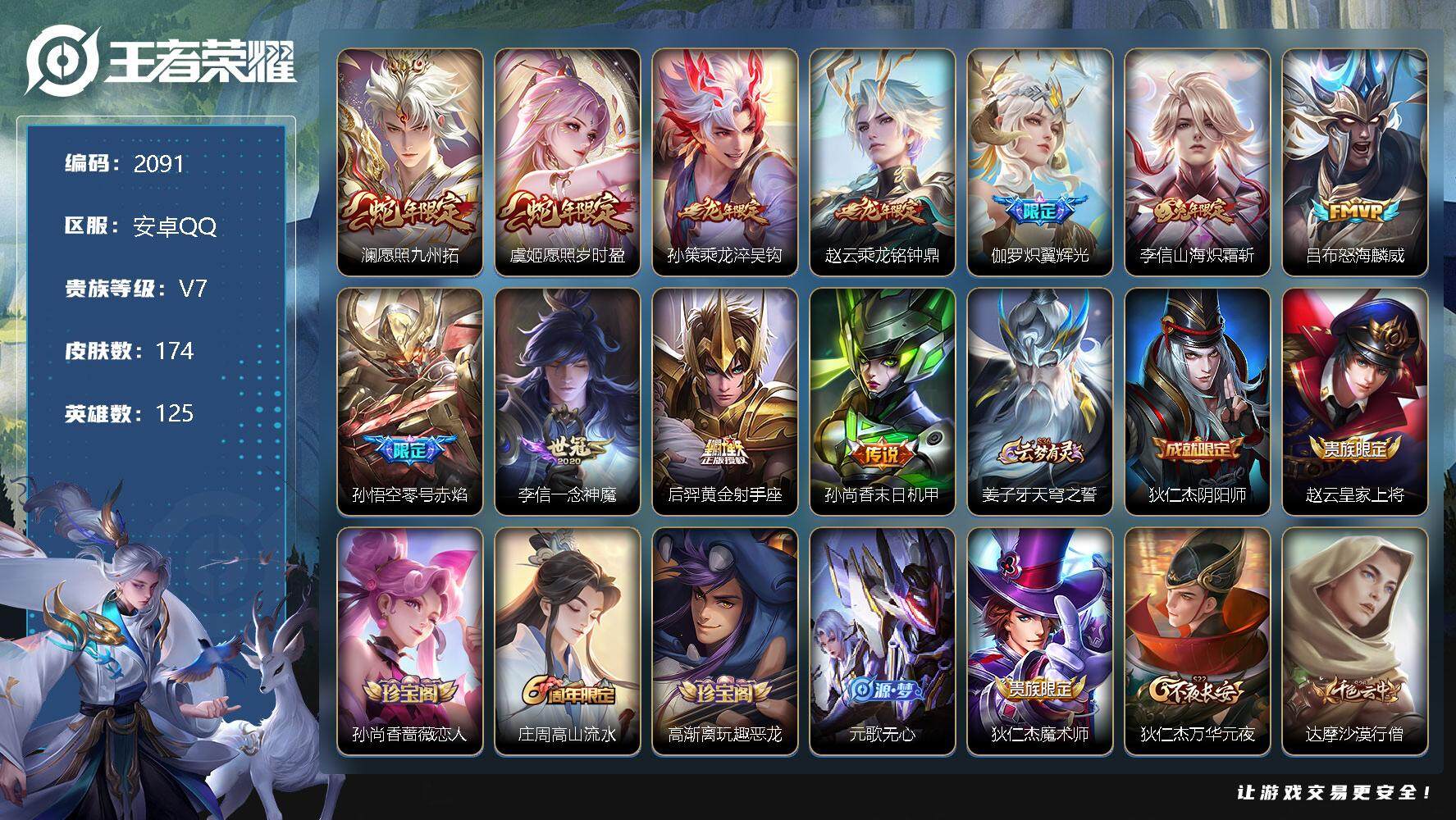 [12933685]安卓Q-V6-至尊星耀V段位-125英雄-174皮肤-0典藏-0珍品无双-0无双-0珍品传说-11传说-33史诗 【英雄全皮】:李信全皮 【传说皮肤】:澜愿照九州拓,虞姬愿照岁时盈,孙策乘龙淬吴钩,赵云乘龙铭钟鼎,伽罗炽翼辉光,李信山海炽霜斩,吕布怒海麟威,孙悟空零号赤焰,李信一念神魔,后羿黄金射手座,孙尚香末日机甲 【限定皮肤】:姜子牙天穹之誓,狄仁杰阴阳师,赵云皇家上将,孙尚香蔷薇恋人,庄周高山流水,高渐离玩趣恶龙,元歌无心,狄仁杰魔术师,狄仁杰万华元夜,达摩沙漠行僧,项羽海滩派对,程咬金演武夺筹,孙悟空零号赤焰,李元芳云中旅人,钟馗驱傩正仪,鬼谷子原初探秘者,鬼谷子五谷丰年,苏烈千军破阵,弈星混沌棋,沈梦溪大漠名商,明世隐疑决卦,裴擒虎李小龙,裴擒虎擒涛扼浪,李信山海炽霜斩,伽罗炽翼辉光,猪八戒猪悟能,嫦娥暖冬兔眠,鲁班大师探海日志,桑启海盐诗旅,暃星界游侠,张良古海寻踪,鬼谷子天穹祈灯,孙策乘龙淬吴钩,赵云乘龙铭钟鼎,沈梦溪龙舞盛年,刘邦剑破天穹,周瑜熔金海岸 【年限皮肤】:李信山海炽霜斩,伽罗炽翼辉光,孙策乘龙淬吴钩,赵云乘龙铭钟鼎 【赛季限定】:狄仁杰万华元夜,达摩沙漠行僧,程咬金演武夺筹,张良古海寻踪,李元芳云中旅人,钟馗驱傩正仪,鬼谷子原初探秘者,苏烈千军破阵,弈星混沌棋,沈梦溪大漠名商,明世隐疑决卦,裴擒虎擒涛扼浪,鲁班大师探海日志,桑启海盐诗旅,鬼谷子天穹祈灯,刘邦剑破天穹,姜子牙天穹之誓 【战令限定】:嫦娥暖冬兔眠,暃星界游侠 【史诗皮肤】:项羽苍穹之光,露娜紫霞仙子,赵云皇家上将,貂蝉圣诞恋歌,甄姬冰雪圆舞曲,王昭君偶像歌手,狄仁杰魔术师,廉颇地狱岩魂,宫本武藏鬼剑武藏,孙尚香蔷薇恋人,孙尚香水果甜心,嬴政摇滚巨星,墨子龙骑士,墨子金属风暴,李白千年之狐,张飞乱世虎臣,韩信白龙吟,花木兰水晶猎龙者,百里守约特工魅影,李元芳逐浪之夏,阿轲节奏热浪,伽罗箭羽风息,狄仁杰鹰眼统帅,裴擒虎李小龙,猪八戒猪悟能,庄周高山流水,鬼谷子五谷丰年,元歌无心,暃星界游侠,莱西奥末日机甲,赵怀真器灵浮梦炉,狂铁龙之律动,黄忠百相守梦 【其他皮肤】:项羽海滩派对,韩信教廷特使,韩信街头霸王,赵云忍炎影,芈月红桃皇后,白起白色死神,牛魔西部大镖客,扁鹊化身博士,扁鹊救世之瞳,安琪拉玩偶对对碰,孙膑天使之翼,妲己少女阿狸,典韦黄金武士,花木兰兔女郎,甄姬花好人间,刘