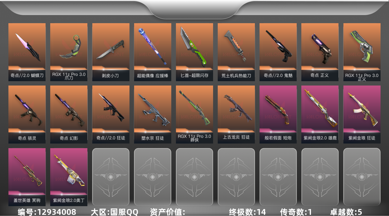 [12934008]【套装】:RGX 11z Pro//3.0套装,奇点//2.0套装,回火礼包:奇点套装 【英雄】:幻棱,炼狱,暮蝶,钛狐,壹决,铁臂,捷风,幽影,不死鸟,贤者,猎枭,蝰蛇,零,芮娜,奇乐,尚勃勒,霓虹,斯凯,夜露,星礈,K/O,盖可,钢锁 【近战 武器】:近战武器-剥皮小刀,近战武器-奇点//2.0 蝴蝶刀,近战武器-RGX 11z Pro//3.0 爪刀,近战武器-超能偶像 应援棒,近战武器-超限闪存 匕首,近战武器-荒土机兵 热能刀 【狂徒】:狂徒-上古龙炎,狂徒-奇点//2.0,狂徒-塑水宗,狂徒-紫阙金琅,狂徒-超能偶像,狂徒-荒土机兵,狂徒-泰坦兵器 【幻影】:幻影-奇点,幻影-超限闪存,幻影-聚合之力,幻影-纳米打击 【戍卫】:戍卫-超能偶像,戍卫-浮光跃金,戍卫-逆冲蛮牛 【獠犬】:獠犬-采蜜小蜂队,獠犬-模拟赫兹,獠犬-逆冲蛮牛 【冥驹】:冥驹-盖世英雄,冥驹-荒土机兵,冥驹-模拟赫兹 【飞将】:飞将-聚合之力 【莽侠】:莽侠-RGX 11z Pro//3.0,莽侠-超限闪存 【战神】:战神-采蜜小蜂队,战神-浮光跃金 【奥丁】:奥丁-紫阙金琅//2.0,奥丁-纳米打击 【判官】:判官-超能偶像,判官-采蜜小蜂队,判官-纳米打击x 【雄鹿】:雄鹿-紫阙金琅//2.0,雄鹿-模拟赫兹,雄鹿-逆冲蛮牛 【骇灵】:骇灵-奇点,骇灵-虎魄春明,骇灵-荒土机兵,骇灵-浮光跃金 【蜂刺】:蜂刺-超限闪存,蜂刺-聚合之力 【标配】:标配-超能偶像,标配-荒土机兵,标配-浮光跃金 【正义】:正义-RGX 11z Pro//3.0,正义-奇点,正义-超限闪存,正义-纳米打击 【鬼魅】:鬼魅-奇点//2.0,鬼魅-采蜜小蜂队,鬼魅-模拟赫兹,鬼魅-星云暗涌 【狂怒】:狂怒-聚合之力,狂怒-逆冲蛮牛 【短炮】:短炮-般若假面 【卡面】:终章:激斗汉堡 卡面,进入射程 卡面,分崩离析 卡面,纳米打击 卡面,抑制技术 卡面,激斗汉堡 卡面,瓦娃脸雪糕 P2 卡面,从黄昏到黎明 卡面,荒土机兵 卡面,银弹猎手 卡面,逆冲蛮牛 卡面,《双城之战》拥抱 卡面,精灵大战 卡面,欢迎来到底城 卡面,南瓜盛典 卡面,唱片的故事 卡面,钢弓与箭弦 卡面,排除故障 卡面,奇点//2.0 卡面,战术桌游 卡面,悠享食光 卡面,修车达人 卡面,模拟赫兹 卡面,浮光跃金 卡面,超限闪存 卡面,维