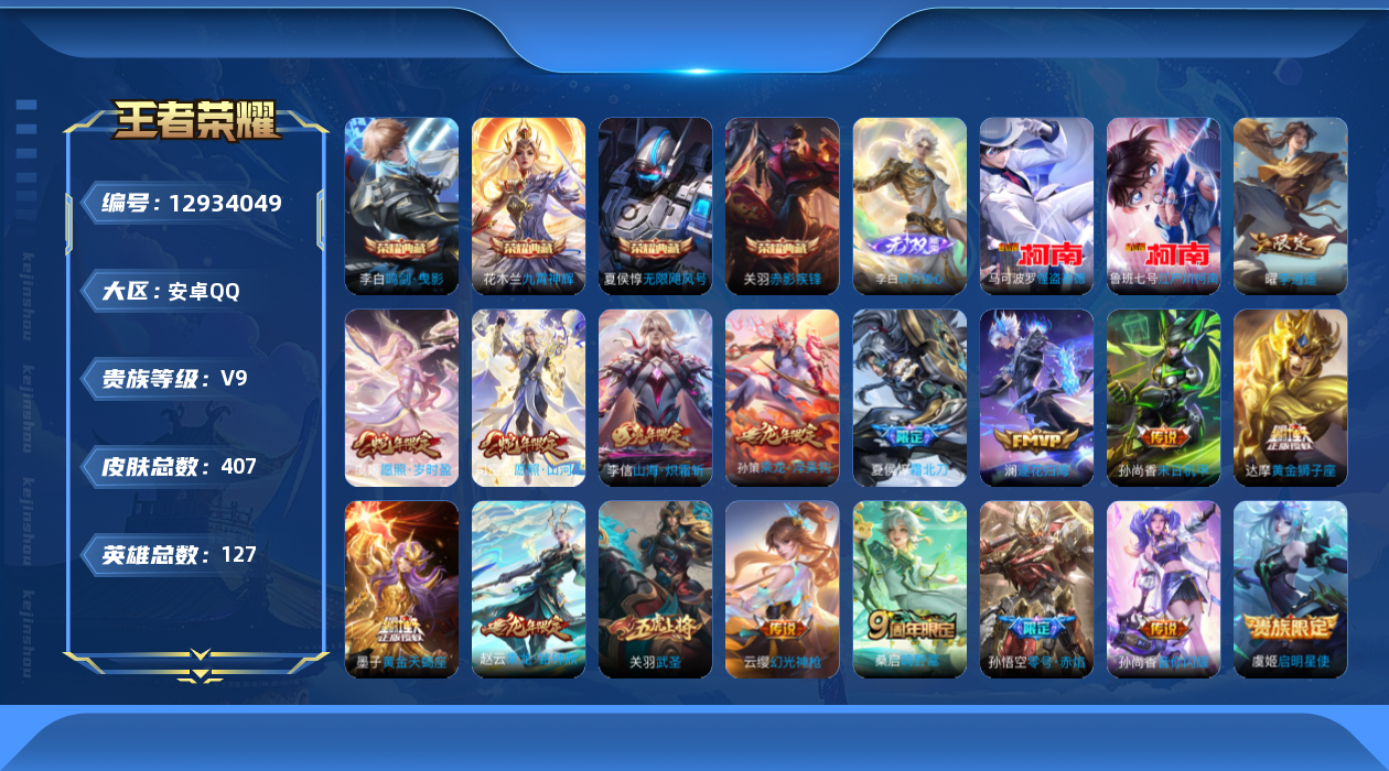 [12934049]安卓Q-V9-最强王者段位-127英雄-407皮肤-4典藏-0珍品无双-1无双-2珍品传说-18传说-134史诗