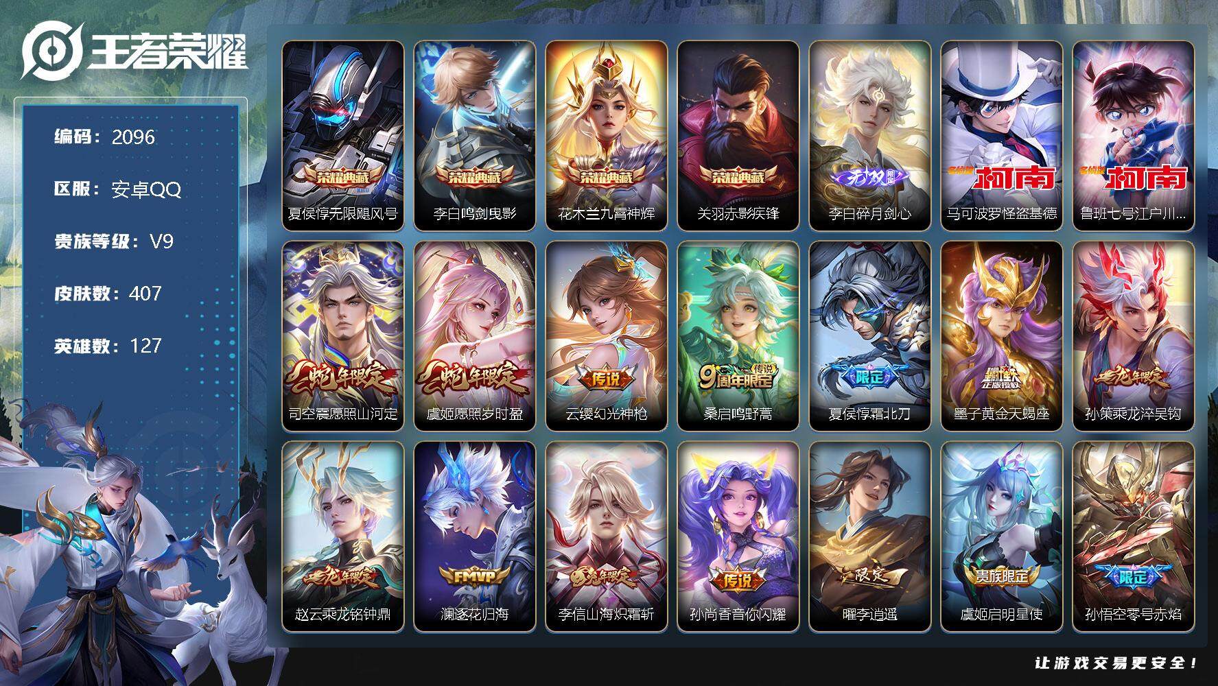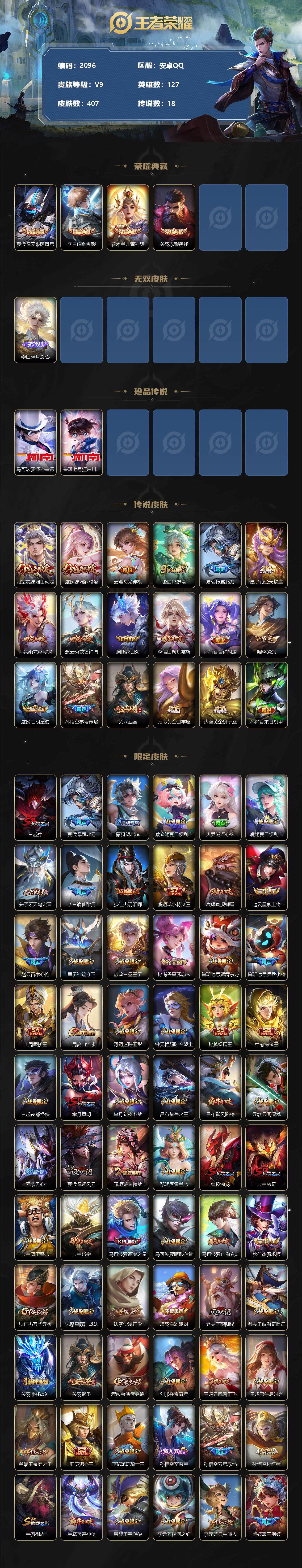 [12934049]安卓Q-V9-最强王者段位-127英雄-407皮肤-4典藏-0珍品无双-1无双-2珍品传说-18传说-134史诗 【英雄全皮】:廉颇全皮,刘禅全皮,达摩全皮,苏烈全皮,狂铁全皮,猪八戒全皮,蒙恬全皮,司空震全皮,金蝉全皮,影全皮 【荣耀典藏】:夏侯惇无限飓风号,李白鸣剑曳影,花木兰九霄神辉,关羽赤影疾锋 【无双皮肤】:李白碎月剑心 【珍品传说】:马可波罗怪盗基德,鲁班七号江户川柯南 【传说皮肤】:司空震愿照山河定,虞姬愿照岁时盈,云缨幻光神枪,桑启鸣野蒿,夏侯惇霜北刀,墨子黄金天蝎座,孙策乘龙淬吴钩,赵云乘龙铭钟鼎,澜逐花归海,李信山海炽霜斩,孙尚香音你闪耀,曜李逍遥 ,虞姬启明星使,孙悟空零号赤焰,关羽武圣,张良黄金白羊座,达摩黄金狮子座,孙尚香末日机甲 【限定皮肤】:白起狰,夏侯惇霜北刀,蒙犽顽岩魄,蔡文姬夏日便利店,大乔绒语心约,虞姬夏日便利店,姜子牙天穹之誓,李白谪仙醉月,狄仁杰阴阳师,虞姬凯尔特女王,廉颇寅虎御盾,赵云皇家上将,赵云百木心枪,墨子神迹守卫,嬴政白昼王子,孙尚香蔷薇恋人,鲁班七号狮舞东方,鲁班七号乒乒小将,庄周蜃楼王,庄周高山流水,阿轲迷踪丽影,钟无艳超时空战士,孙膑妖精王,扁鹊炼金王,白起夜都怪侠,芈月重明,芈月幻夜卜梦,吕布猎兽之王,吕布御风骁将,元歌云间偶戏,元歌无心,夏侯惇朔风刀,甄姬游园惊梦,甄姬落雪兰心,曹操烛龙,典韦穷奇,典韦蓝屏警告,典韦岱宗,马可波罗逐梦之星,马可波罗暗影游猎,马可波罗山海玄木吟,狄仁杰魔术师,狄仁杰万华元夜,达摩星际陆战队,达摩沙漠行僧,项羽海滩派对,老夫子醍醐杖,老夫子航海奇遇记,关羽冰锋战神,关羽武圣,程咬金演武夺筹,刘邦夺宝奇兵,王昭君凤凰于飞,王昭君午后时光,兰陵王金庭之子,亚瑟狮心王,亚瑟潮玩骑士王,孙悟空至尊宝,孙悟空零号赤焰,孙悟空孙行者,牛魔御旌,牛魔奔雷神使,后羿圣弓游侠,李元芳银河之约,李元芳云中旅人,虞姬霸王别姬,虞姬启明星使,钟馗神迹守卫,钟馗驱傩正仪,杨戬潮玩骑兵,女娲朔望之晖,干将莫邪真爱魔法,雅典娜单词大作战,雅典娜黎明之约,蔡文姬繁星吟游,太乙真人饕餮,鬼谷子原初探秘者,鬼谷子五谷丰年,黄忠火炮绅士,铠青龙志,苏烈玄武志,苏烈千军破阵,百里玄策原初追逐者,弈星混沌棋,梦奇顽趣,公孙离玉兔公主,沈梦溪星空之诺,沈梦溪大漠名商,明世隐疑决卦,明世隐吟游魔法,裴擒虎李小龙,裴擒虎