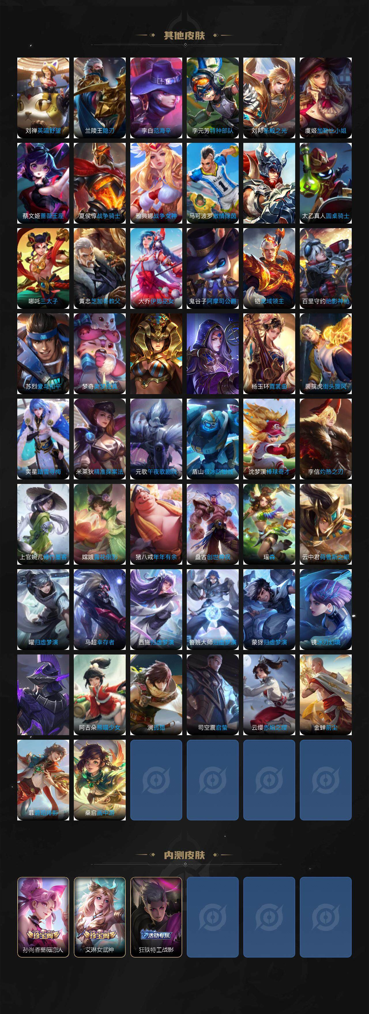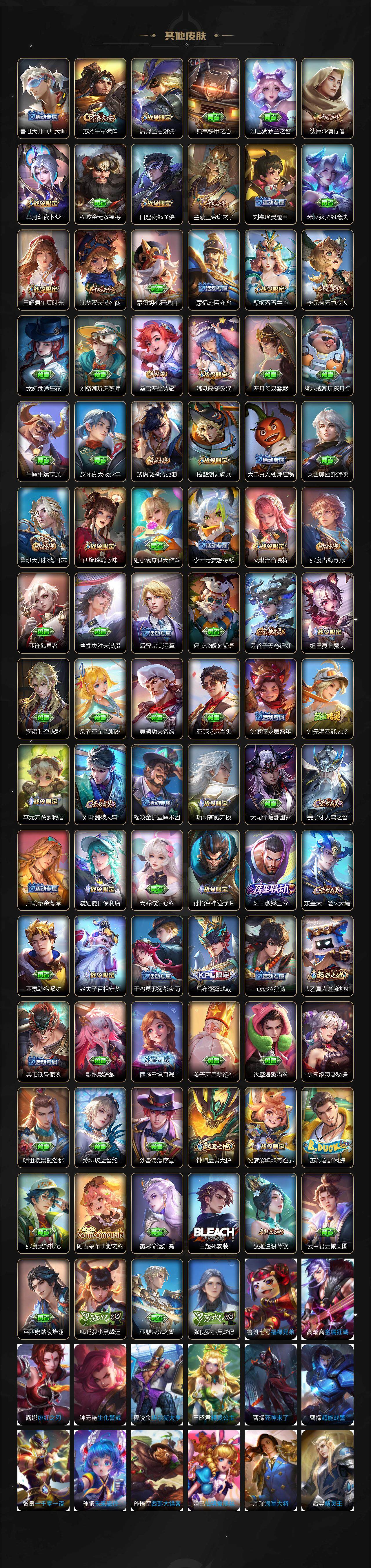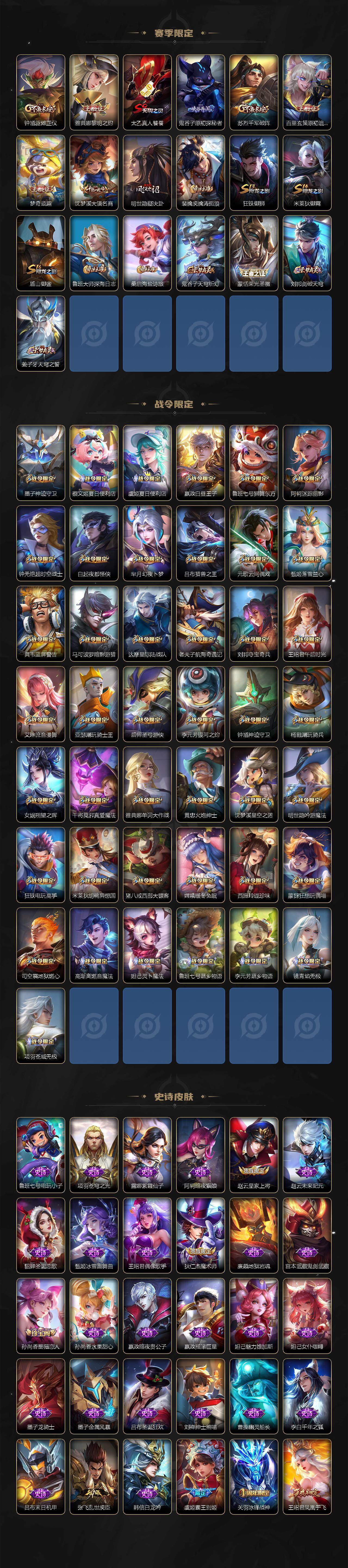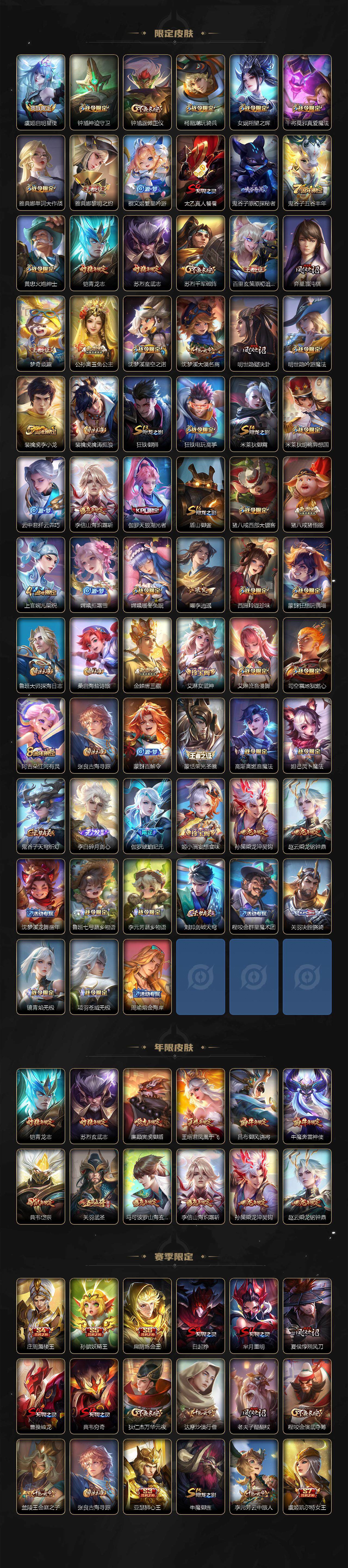 【限定皮肤】:白起狰,夏侯惇霜北刀,蒙犽顽岩魄,蔡文姬夏日便利店,大乔绒语心约,虞姬夏日便利店,姜子牙天穹之誓,李白谪仙醉月,狄仁杰阴阳师,虞姬凯尔特女王,廉颇寅虎御盾,赵云皇家上将,赵云百木心枪,墨子神迹守卫,嬴政白昼王子,孙尚香蔷薇恋人,鲁班七号狮舞东方,鲁班七号乒乒小将,庄周蜃楼王,庄周高山流水,阿轲迷踪丽影,钟无艳超时空战士,孙膑妖精王,扁鹊炼金王,白起夜都怪侠,芈月重明,芈月幻夜卜梦,吕布猎兽之王,吕布御风骁将,元歌云间偶戏,元歌无心,夏侯惇朔风刀,甄姬游园惊梦,甄姬落雪兰心,曹操烛龙,典韦穷奇,典韦蓝屏警告,典韦岱宗,马可波罗逐梦之星,马可波罗暗影游猎,马可波罗山海玄木吟,狄仁杰魔术师,狄仁杰万华元夜,达摩星际陆战队,达摩沙漠行僧,项羽海滩派对,老夫子醍醐杖,老夫子航海奇遇记,关羽冰锋战神,关羽武圣,程咬金演武夺筹,刘邦夺宝奇兵,王昭君凤凰于飞,王昭君午后时光,兰陵王金庭之子,亚瑟狮心王,亚瑟潮玩骑士王,孙悟空至尊宝,孙悟空零号赤焰,孙悟空孙行者,牛魔御旌,牛魔奔雷神使,后羿圣弓游侠,李元芳银河之约,李元芳云中旅人,虞姬霸王别姬,虞姬启明星使,钟馗神迹守卫,钟馗驱傩正仪,杨戬潮玩骑兵,女娲朔望之晖,干将莫邪真爱魔法,雅典娜单词大作战,雅典娜黎明之约,蔡文姬繁星吟游,太乙真人饕餮,鬼谷子原初探秘者,鬼谷子五谷丰年,黄忠火炮绅士,铠青龙志,苏烈玄武志,苏烈千军破阵,百里玄策原初追逐者,弈星混沌棋,梦奇顽趣,公孙离玉兔公主,沈梦溪星空之诺,沈梦溪大漠名商,明世隐疑决卦,明世隐吟游魔法,裴擒虎李小龙,裴擒虎