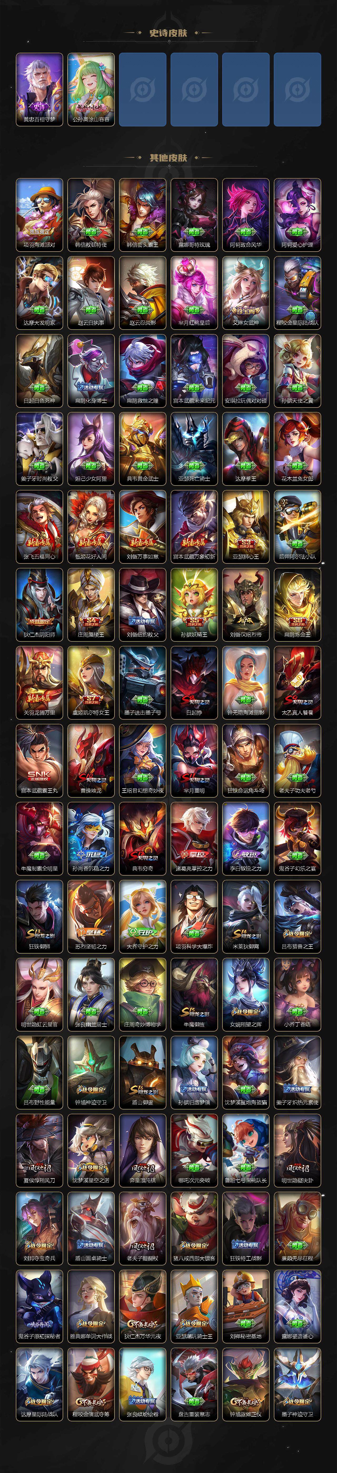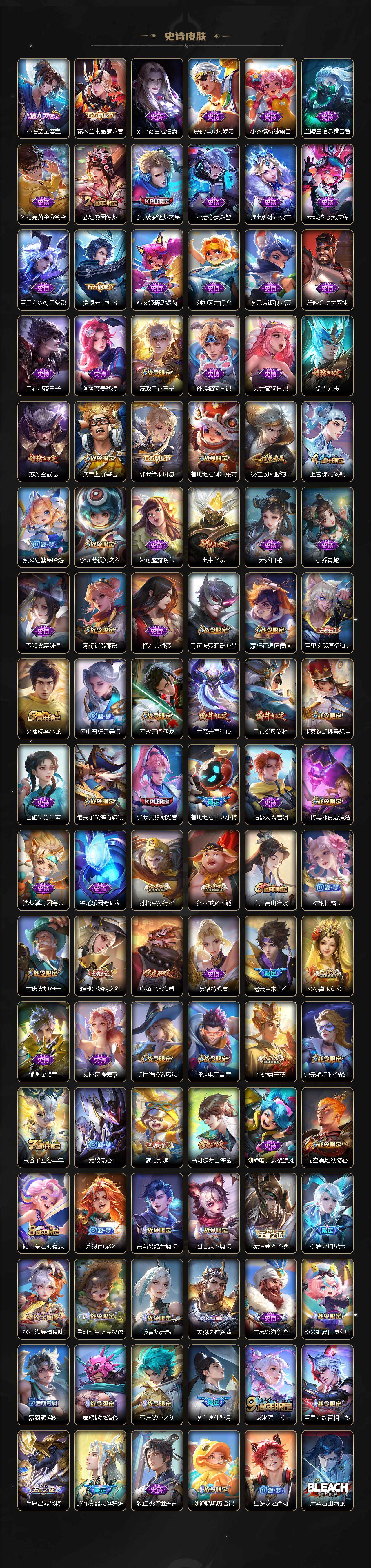 亚瑟狮心王,庄周蜃楼王,孙膑妖精王,扁鹊炼金王,虞姬凯尔特女王,白起狰,太乙真人饕餮,曹操烛龙,芈月重明,典韦穷奇,狂铁御狮,米莱狄御霄,牛魔御旌,盾山御銮,夏侯惇朔风刀,明世隐疑决卦,老夫子醍醐杖,鬼谷子原初探秘者,狄仁杰万华元夜,程咬金演武夺筹,钟馗驱傩正仪,苏烈千军破阵,吕布猎兽之王,嬴政白昼王子,女娲朔望之晖,典韦蓝屏警告,钟馗神迹守卫,鲁班七号狮舞东方,沈梦溪星空之诺,李元芳银河之约,刘邦夺宝奇兵,马可波罗暗影游猎,蒙犽狂想玩偶喵,元歌云间偶戏,弈星混沌棋,达摩沙漠行僧,兰陵王金庭之子,沈梦溪大漠名商,李元芳云中旅人,桑启海盐诗旅,裴擒虎擒涛扼浪,鲁班大师探海日志,张良古海寻踪,项羽苍威无极,镜青焰无极