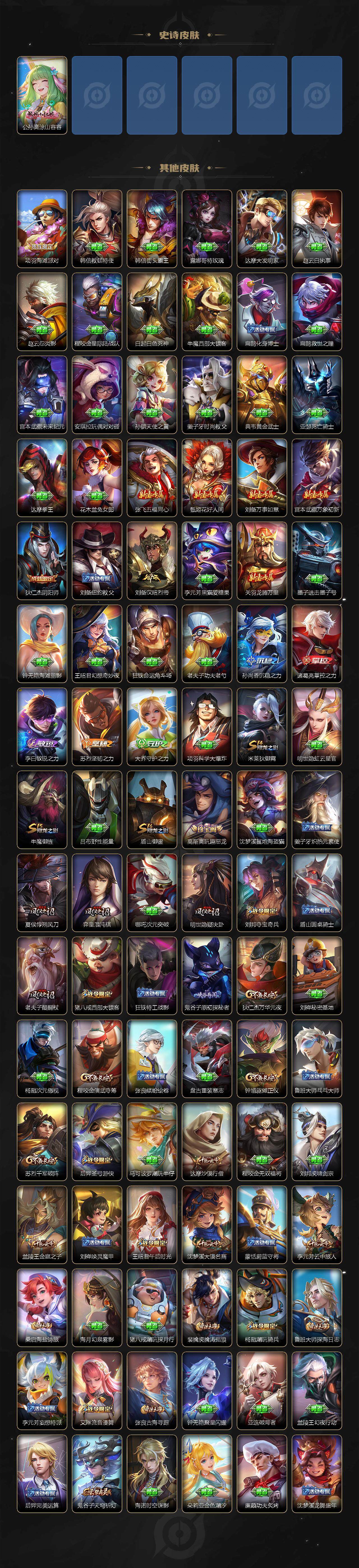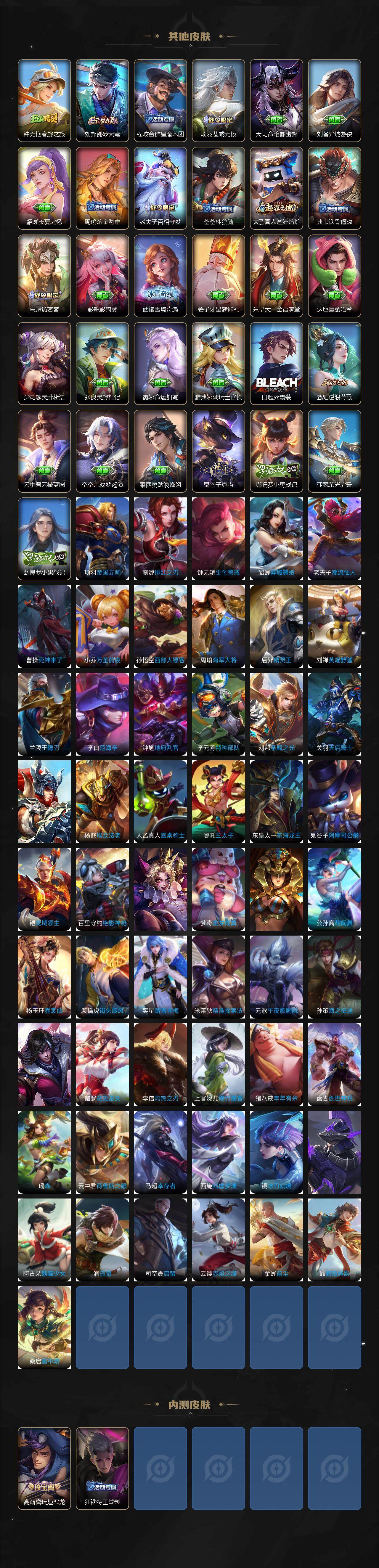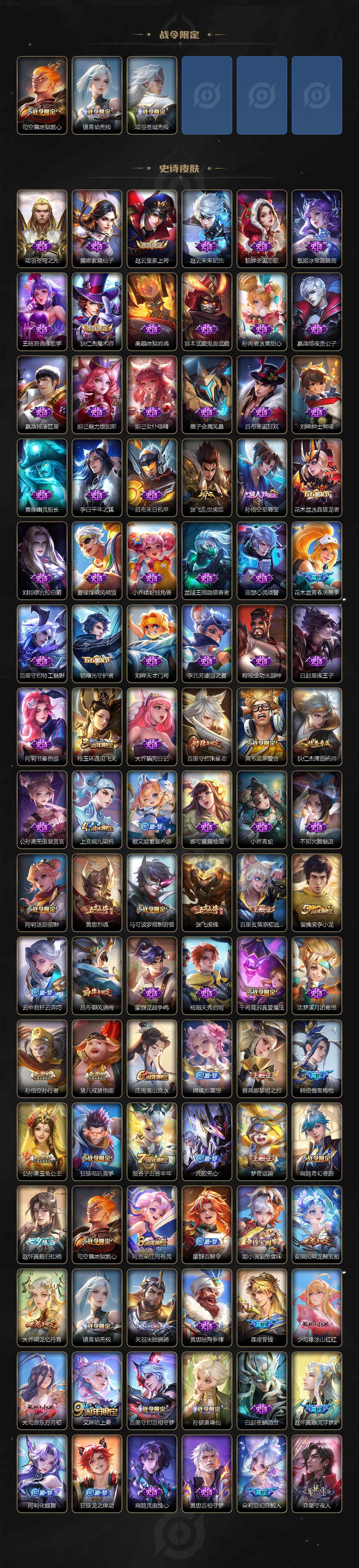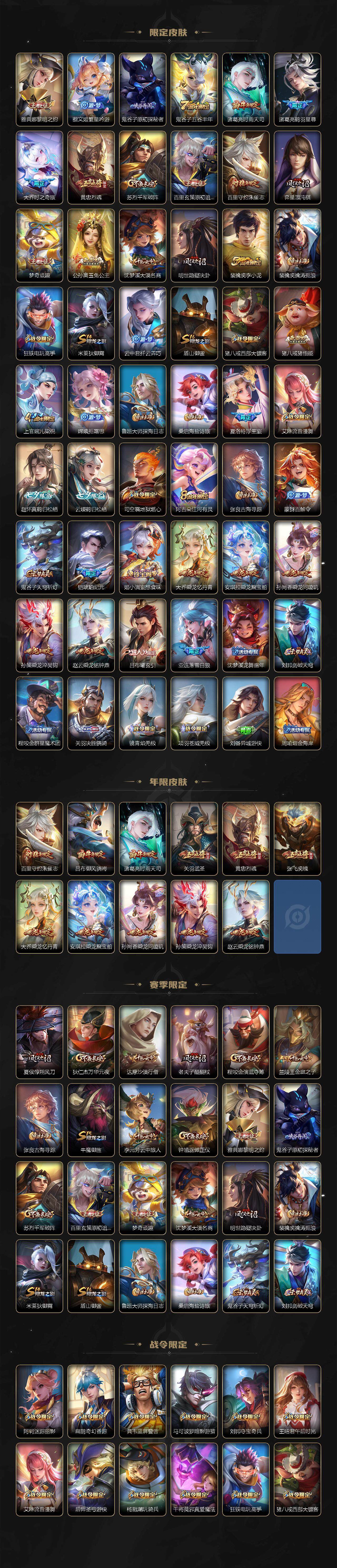 【限定皮肤】:暃埋骨钱,狄仁杰阴阳师,赵云皇家上将,孙尚香异界灵契,鲁班七号时之奇旅,庄周高山流水,高渐离玩趣恶龙,阿轲迷踪丽影,扁鹊奇幻香踪,吕布御风骁将,吕布遇见神鼓,元歌无心,夏侯惇朔风刀,典韦蓝屏警告,马可波罗暗影游猎,马可波罗深海之息,狄仁杰魔术师,狄仁杰万华元夜,达摩沙漠行僧,项羽海滩派对,老夫子醍醐杖,关羽武圣,程咬金演武夺筹,刘邦夺宝奇兵,韩信傲雪梅枪,王昭君午后时光,兰陵王影龙天霄,兰陵王金庭之子,花木兰青春决赛季,娜可露露前尘镜,孙悟空至尊宝,孙悟空孙行者,牛魔御旌,后羿圣弓游侠,张飞虎魄,张飞百相守梦,李元芳云中旅人,虞姬启明星使,钟馗驱傩正仪,杨玉环遇见飞天,杨戬潮玩骑兵,干将莫邪真爱魔法,雅典娜黎明之约,蔡文姬繁星吟游,鬼谷子原初探秘者,鬼谷子五谷丰年,诸葛亮时雨天司,诸葛亮鹤羽星尊,大乔时之奇旅,黄忠烈魂,苏烈千军破阵,百里玄策原初追逐者,百里守约朱雀志,弈星混沌棋,梦奇顽趣,公孙离玉兔公主,沈梦溪大漠名商,明世隐疑决卦,裴擒虎李小龙,裴擒虎擒涛扼浪,狂铁电玩高手,米莱狄御霄,云中君纤云弄巧,盾山御銮,猪八戒西部大镖客,猪八戒猪悟能,上官婉儿梁祝,嫦娥拒霜思,鲁班大师探海日志,桑启海盐诗旅,夏洛特浮生妄,艾琳流音漫舞,赵怀真鹤归松栖,云缨鹤归松栖,司空震地狱燃心,阿