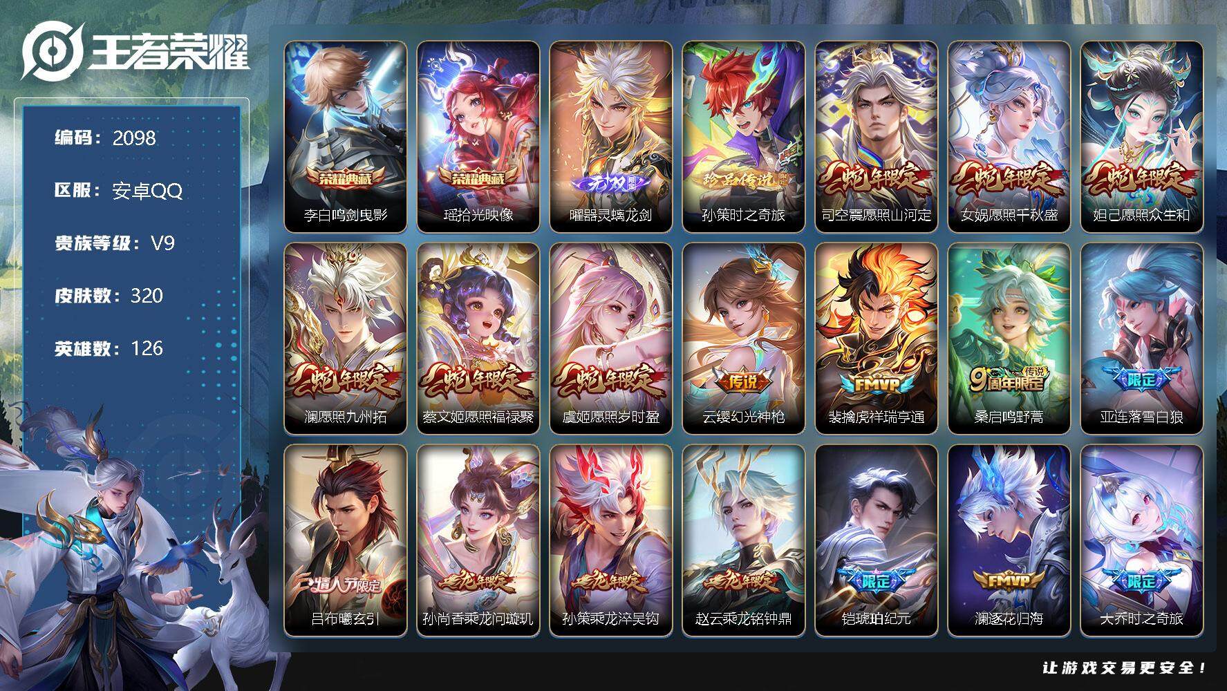 [12934096]安卓Q-V9-至尊星耀II段位-126英雄-320皮肤-2典藏-0珍品无双-1无双-1珍品传说-38传说-97史诗 【英雄全皮】:刘邦全皮,娜可露露全皮,猪八戒全皮,司空震全皮,空空儿全皮,影全皮,少司缘全皮 【荣耀典藏】:李白鸣剑曳影,瑶拾光映像 【无双皮肤】:曜器灵螭龙剑 【珍品传说】:孙策时之奇旅 【传说皮肤】:司空震愿照山河定,女娲愿照千秋盛,妲己愿照众生和,澜愿照九州拓,蔡文姬愿照福禄聚,虞姬愿照岁时盈,云缨幻光神枪,裴擒虎祥瑞亨通,桑启鸣野蒿,亚连落雪白狼,吕布曦玄引,孙尚香乘龙问璇玑,孙策乘龙淬吴钩,赵云乘龙铭钟鼎,铠琥珀纪元,澜逐花归海,大乔时之奇旅,鲁班七号时之奇旅,兰陵王影龙天霄,吕布遇见神鼓,云缨鹤归松栖,诸葛亮鹤羽星尊,张飞百相守梦,夏洛特浮生妄,娜可露露前尘镜,马可波罗深海之息,孙尚香异界灵契,赵云淬星耀世,诸葛亮时雨天司,虞姬启明星使,关羽武圣,曜云鹰飞将,刘备时之恋人,达摩黄金狮子座,梦奇胖达荣荣,后羿黄金射手座,孙悟空地狱火,狄仁杰超时空战士 【限定皮肤】:暃埋骨钱,狄仁杰阴阳师,赵云皇家上将,孙尚香异界灵契,鲁班七号时之奇旅,庄周高山流水,高渐离玩趣恶龙,阿轲迷踪丽影,扁鹊奇幻香踪,吕布御风骁将,吕布遇见神鼓,元歌无心,夏侯惇朔风刀,典韦蓝屏警告,马可波罗暗影游猎,马可波罗深海之息,狄仁杰魔术师,狄仁杰万华元夜,达摩沙漠行僧,项羽海滩派对,老夫子醍醐杖,关羽武圣,程咬金演武夺筹,刘邦夺宝奇兵,韩信傲雪梅枪,王昭君午后时光,兰陵王影龙天霄,兰陵王金庭之子,花木兰青春决赛季,娜可露露前尘镜,孙悟空至尊宝,孙悟空孙行者,牛魔御旌,后羿圣弓游侠,张飞虎魄,张飞百相守梦,李元芳云中旅人,虞姬启明星使,钟馗驱傩正仪,杨玉环遇见飞天,杨戬潮玩骑兵,干将莫邪真爱魔法,雅典娜黎明之约,蔡文姬繁星吟游,鬼谷子原初探秘者,鬼谷子五谷丰年,诸葛亮时雨天司,诸葛亮鹤羽星尊,大乔时之奇旅,黄忠烈魂,苏烈千军破阵,百里玄策原初追逐者,百里守约朱雀志,弈星混沌棋,梦奇顽趣,公孙离玉兔公主,沈梦溪大漠名商,明世隐疑决卦,裴擒虎李小龙,裴擒虎擒涛扼浪,狂铁电玩高手,米莱狄御霄,云中君纤云弄巧,盾山御銮,猪八戒西部大镖客,猪八戒猪悟能,上官婉儿梁祝,嫦娥拒霜思,鲁班大师探海日志,桑启海盐诗旅,夏洛特浮生妄,艾琳流音漫舞,赵怀真鹤归松栖,云缨鹤归松栖,司空震地狱燃心,阿
