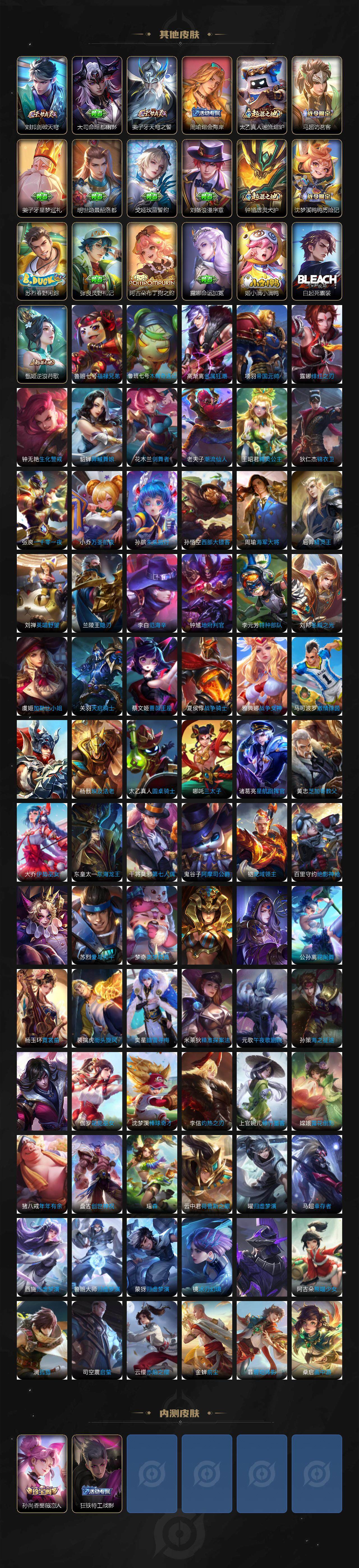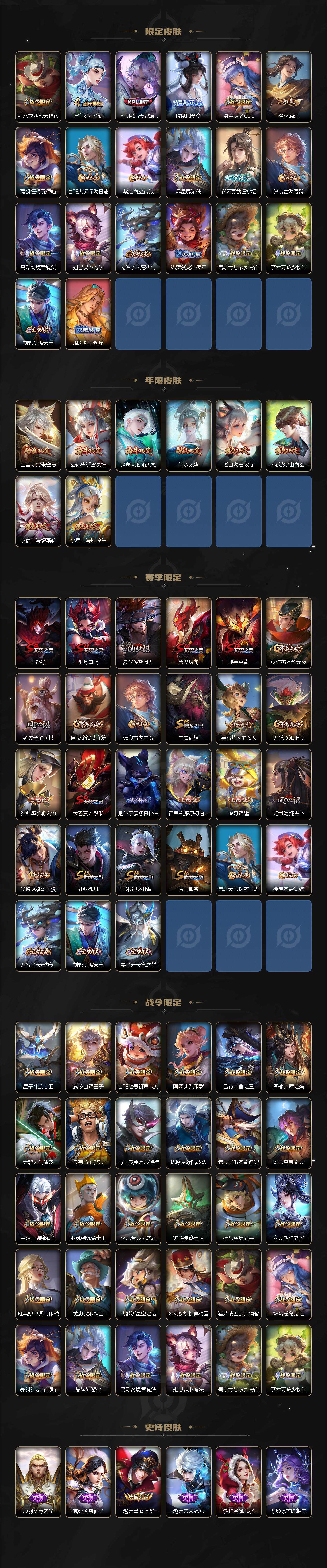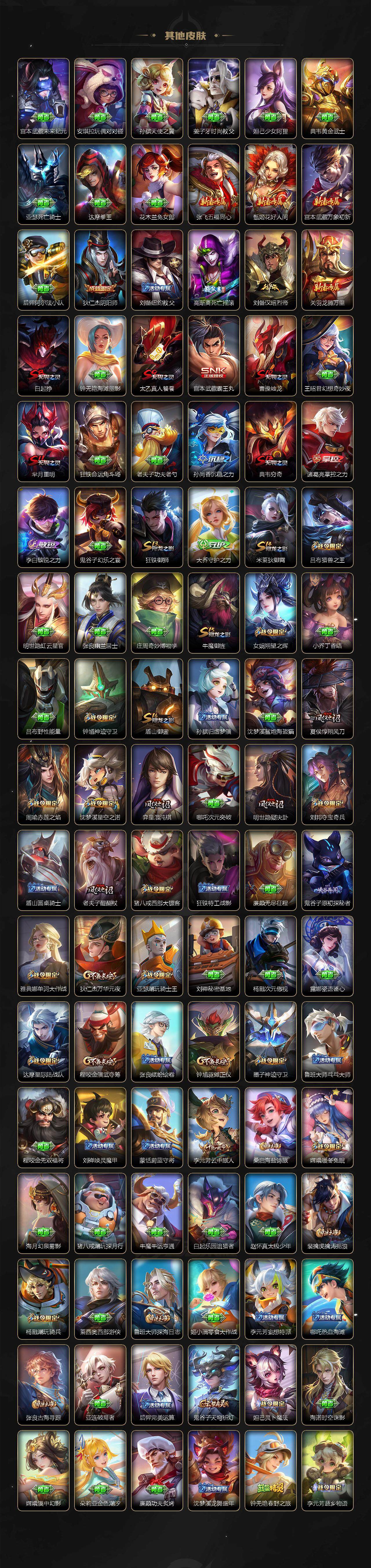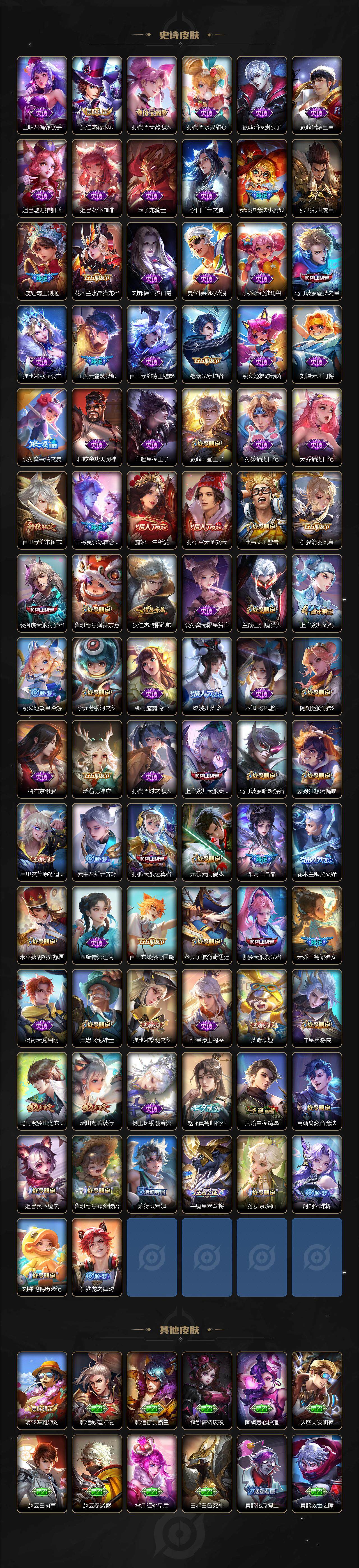 【限定皮肤】:白起狰,蒙犽顽岩魄,姜子牙天穹之誓,狄仁杰阴阳师,小乔山海琳琅生,赵云皇家上将,墨子神迹守卫,嬴政白昼王子,孙尚香蔷薇恋人,鲁班七号狮舞东方,庄周云端筑梦师,高渐离死亡摇滚,阿轲迷踪丽影,孙膑天狼运算者,芈月重明,芈月白晶晶,吕布猎兽之王,周瑜赤莲之焰,元歌云间偶戏,夏侯惇朔风刀,曹操烛龙,典韦穷奇,典韦蓝屏警告,马可波罗逐梦之星,马可波罗暗影游猎,马可波罗山海玄木吟,狄仁杰魔术师,狄仁杰万华元夜,达摩星际陆战队,项羽海滩派对,老夫子醍醐杖,老夫子航海奇遇记,安琪拉魔法小厨娘,程咬金演武夺筹,露娜一生所爱,刘邦夺宝奇兵,兰陵王驯魔猎人,花木兰默契交锋,亚瑟潮玩骑士王,孙悟空大圣娶亲,牛魔御旌,李元芳银河之约,李元芳云中旅人,虞姬霸王别姬,虞姬启明星使,虞姬无限倾心,钟馗神迹守卫,钟馗驱傩正仪,杨戬潮玩骑兵,女娲朔望之晖,干将莫邪冰霜恋舞曲,雅典娜单词大作战,雅典娜黎明之约,蔡文姬繁星吟游,太乙真人饕餮,鬼谷子原初探秘者,诸葛亮时雨天司,大乔白鹤梁神女,黄忠火炮绅士,百里玄策原初追逐者,百里守约朱雀志,弈星混沌棋,梦奇顽趣,公孙离蜜橘之夏,公孙离祈雪灵祝,沈梦溪星空之诺,明世隐疑决卦,裴擒虎天狼狩猎者,裴擒虎擒涛扼浪,狂铁御狮,米莱狄御霄,米莱狄胡桃异想国,瑶山海碧波行,云中君纤云弄巧,李信山海炽霜斩,伽罗太华,伽罗天狼溯光者,盾山御銮,猪八戒西部大镖客,上官婉儿梁祝,上官婉儿天狼绘梦者,嫦娥如梦令,嫦娥暖冬兔眠,曜李逍遥 ,蒙犽狂想玩偶喵,鲁班大师探海日志,桑启海盐诗旅,暃星界游侠,赵怀真鹤归松栖,张良古海寻踪,高渐离燃音魔法,妲己灵卜魔法,鬼谷子天穹祈灯,沈梦溪龙舞盛年,鲁班七号蔬乡物语,李元芳蔬乡物语,刘邦剑破天穹,周瑜熔金海岸
