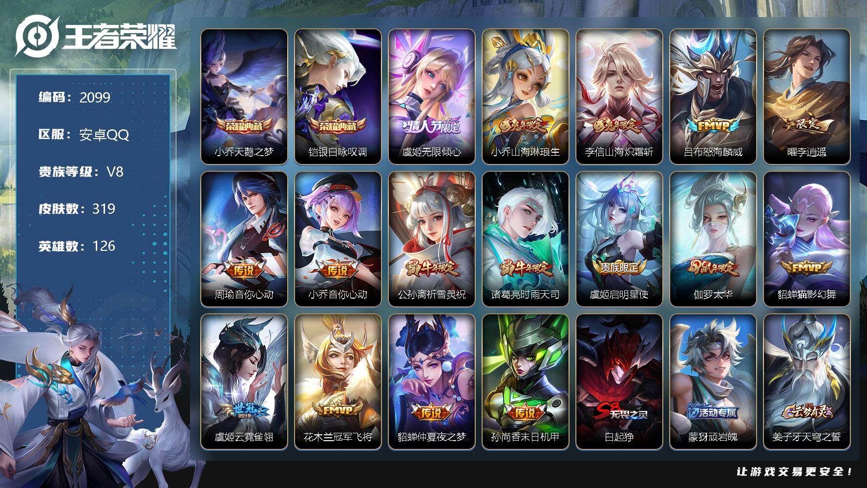 [12934125]安卓Q-V8-永恒钻石II段位-126英雄-319皮肤-2典藏-0珍品无双-0无双-0珍品传说-16传说-91史诗 【荣耀典藏】:小乔天鹅之梦,铠银白咏叹调 【传说皮肤】:虞姬无限倾心,小乔山海琳琅生,李信山海炽霜斩,吕布怒海麟威,曜李逍遥 ,周瑜音你心动,小乔音你心动,公孙离祈雪灵祝,诸葛亮时雨天司,虞姬启明星使,伽罗太华,貂蝉猫影幻舞,虞姬云霓雀翎,花木兰冠军飞将,貂蝉仲夏夜之梦,孙尚香末日机甲 【限定皮肤】:白起狰,蒙犽顽岩魄,姜子牙天穹之誓,狄仁杰阴阳师,小乔山海琳琅生,赵云皇家上将,墨子神迹守卫,嬴政白昼王子,孙尚香蔷薇恋人,鲁班七号狮舞东方,庄周云端筑梦师,高渐离死亡摇滚,阿轲迷踪丽影,孙膑天狼运算者,芈月重明,芈月白晶晶,吕布猎兽之王,周瑜赤莲之焰,元歌云间偶戏,夏侯惇朔风刀,曹操烛龙,典韦穷奇,典韦蓝屏警告,马可波罗逐梦之星,马可波罗暗影游猎,马可波罗山海玄木吟,狄仁杰魔术师,狄仁杰万华元夜,达摩星际陆战队,项羽海滩派对,老夫子醍醐杖,老夫子航海奇遇记,安琪拉魔法小厨娘,程咬金演武夺筹,露娜一生所爱,刘邦夺宝奇兵,兰陵王驯魔猎人,花木兰默契交锋,亚瑟潮玩骑士王,孙悟空大圣娶亲,牛魔御旌,李元芳银河之约,李元芳云中旅人,虞姬霸王别姬,虞姬启明星使,虞姬无限倾心,钟馗神迹守卫,钟馗驱傩正仪,杨戬潮玩骑兵,女娲朔望之晖,干将莫邪冰霜恋舞曲,雅典娜单词大作战,雅典娜黎明之约,蔡文姬繁星吟游,太乙真人饕餮,鬼谷子原初探秘者,诸葛亮时雨天司,大乔白鹤梁神女,黄忠火炮绅士,百里玄策原初追逐者,百里守约朱雀志,弈星混沌棋,梦奇顽趣,公孙离蜜橘之夏,公孙离祈雪灵祝,沈梦溪星空之诺,明世隐疑决卦,裴擒虎天狼狩猎者,裴擒虎擒涛扼浪,狂铁御狮,米莱狄御霄,米莱狄胡桃异想国,瑶山海碧波行,云中君纤云弄巧,李信山海炽霜斩,伽罗太华,伽罗天狼溯光者,盾山御銮,猪八戒西部大镖客,上官婉儿梁祝,上官婉儿天狼绘梦者,嫦娥如梦令,嫦娥暖冬兔眠,曜李逍遥 ,蒙犽狂想玩偶喵,鲁班大师探海日志,桑启海盐诗旅,暃星界游侠,赵怀真鹤归松栖,张良古海寻踪,高渐离燃音魔法,妲己灵卜魔法,鬼谷子天穹祈灯,沈梦溪龙舞盛年,鲁班七号蔬乡物语,李元芳蔬乡物语,刘邦剑破天穹,周瑜熔金海岸 【年限皮肤】:百里守约朱雀志,公孙离祈雪灵祝,诸葛亮时雨天司,伽罗太华,瑶山海碧波行,马可波罗山海玄木吟,李信山海炽霜斩,
