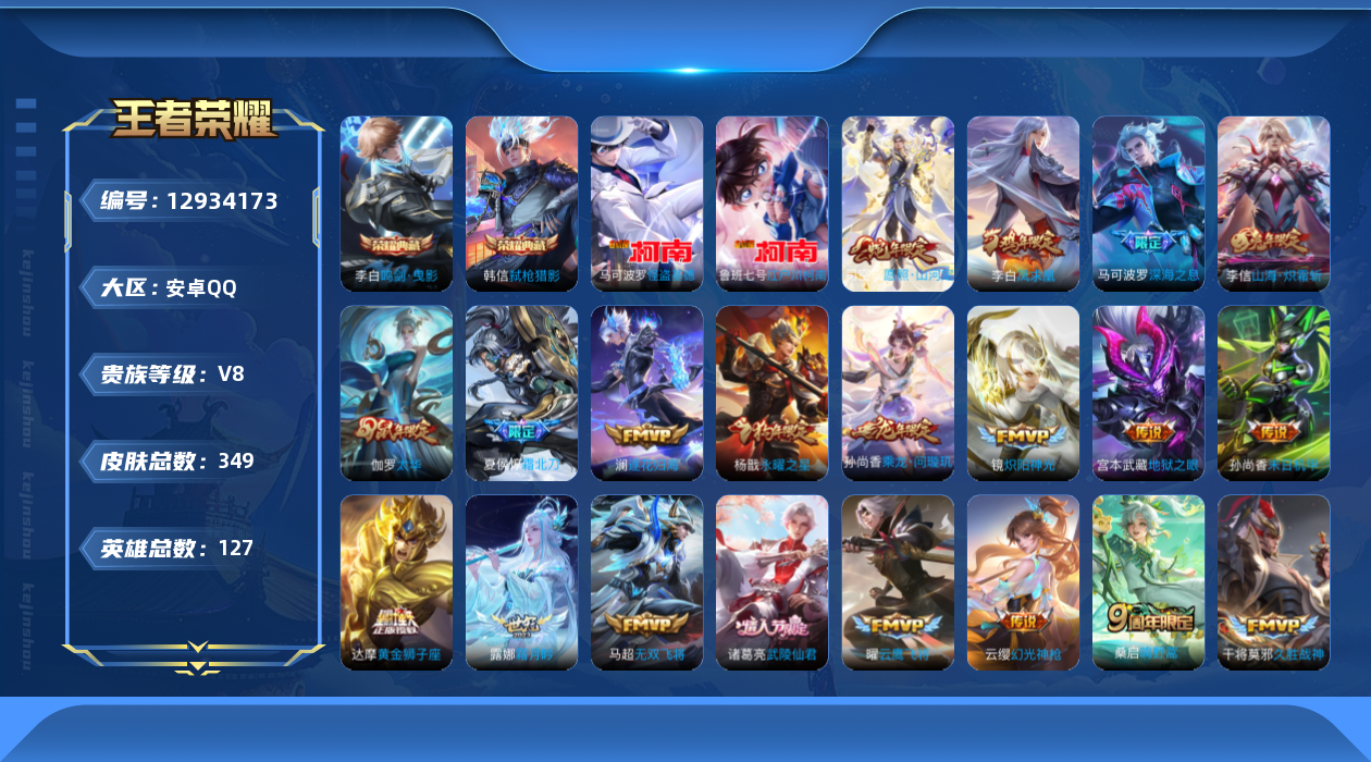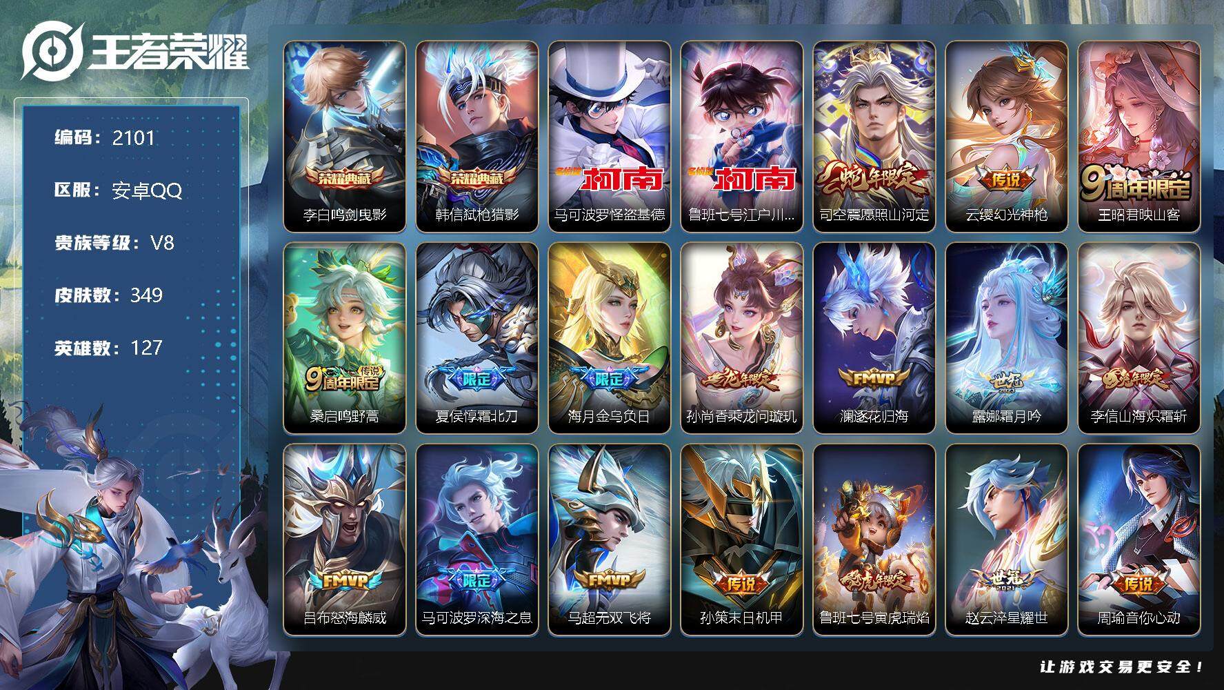 [12934173]安卓Q-V8-至尊星耀IV段位-127英雄-349皮肤-2典藏-0珍品无双-0无双-2珍品传说-32传说-101史诗 【英雄全皮】:蒙恬全皮,司空震全皮,影全皮 【荣耀典藏】:李白鸣剑曳影,韩信弑枪猎影 【珍品传说】:马可波罗怪盗基德,鲁班七号江户川柯南 【传说皮肤】:司空震愿照山河定,云缨幻光神枪,王昭君映山客,桑启鸣野蒿,夏侯惇霜北刀,海月金乌负日,孙尚香乘龙问璇玑,澜逐花归海,露娜霜月吟,李信山海炽霜斩,吕布怒海麟威,马可波罗深海之息,马超无双飞将,孙策末日机甲,鲁班七号寅虎瑞焰,赵云淬星耀世,周瑜音你心动,铠绛天战甲,镜炽阳神光,虞姬启明星使,曜云鹰飞将,刘备时之恋人,伽罗太华,干将莫邪久胜战神,达摩黄金狮子座,梦奇胖达荣荣,杨戬永曜之星,诸葛亮武陵仙君,李白凤求凰,孙尚香末日机甲,宫本武藏地狱之眼,孙悟空地狱火 【限定皮肤】:白起狰,夏侯惇霜北刀,大乔绒语心约,姜子牙天穹之誓,杨戬破阵退雄兵,狄仁杰阴阳师,虞姬凯尔特女王,赵云皇家上将,妲己时之彼端,嬴政优雅恋人,鲁班七号狮舞东方,鲁班七号寅虎瑞焰,庄周蜃楼王,庄周高山流水,高渐离玩趣恶龙,钟无艳超时空战士,孙膑妖精王,扁鹊炼金王,扁鹊奇幻香踪,白起夜都怪侠,芈月重明,芈月幻夜卜梦,周瑜赤莲之焰,元歌无心,夏侯惇朔风刀,甄姬游园惊梦,甄姬落雪兰心,曹操烛龙,典韦穷奇,马可波罗暗影游猎,马可波罗深海之息,狄仁杰魔术师,狄仁杰万华元夜,达摩沙漠行僧,项羽海滩派对,老夫子醍醐杖,关羽冰锋战神,程咬金演武夺筹,韩信飞衡,韩信傲雪梅枪,兰陵王驯魔猎人,兰陵王金庭之子,花木兰青春决赛季,亚瑟狮心王,孙悟空至尊宝,孙悟空大圣娶亲,孙悟空孙行者,牛魔御旌,后羿辉光之辰,李元芳银河之约,李元芳云中旅人,虞姬启明星使,钟馗神迹守卫,钟馗驱傩正仪,杨玉环遇见飞天,杨戬永曜之星,杨戬潮玩骑兵,干将莫邪冰霜恋舞曲,雅典娜单词大作战,雅典娜黎明之约,蔡文姬繁星吟游,太乙真人饕餮,鬼谷子原初探秘者,鬼谷子五谷丰年,诸葛亮武陵仙君,黄忠火炮绅士,苏烈千军破阵,百里玄策原初追逐者,弈星混沌棋,梦奇顽趣,沈梦溪星空之诺,沈梦溪大漠名商,明世隐疑决卦,明世隐吟游魔法,裴擒虎李小龙,裴擒虎擒涛扼浪,狂铁御狮,米莱狄御霄,云中君纤云弄巧,李信山海炽霜斩,伽罗太华,盾山御銮,猪八戒西部大镖客,猪八戒猪悟能,上官婉儿梁祝,上官婉儿天狼绘梦者,嫦娥暖冬