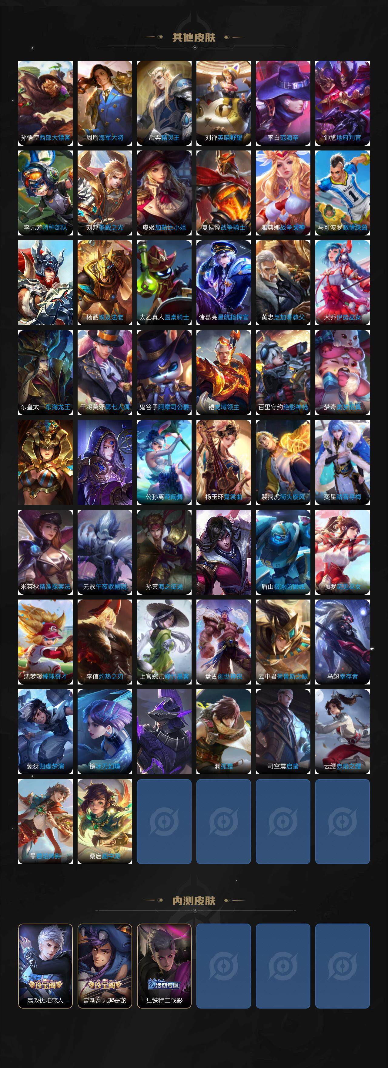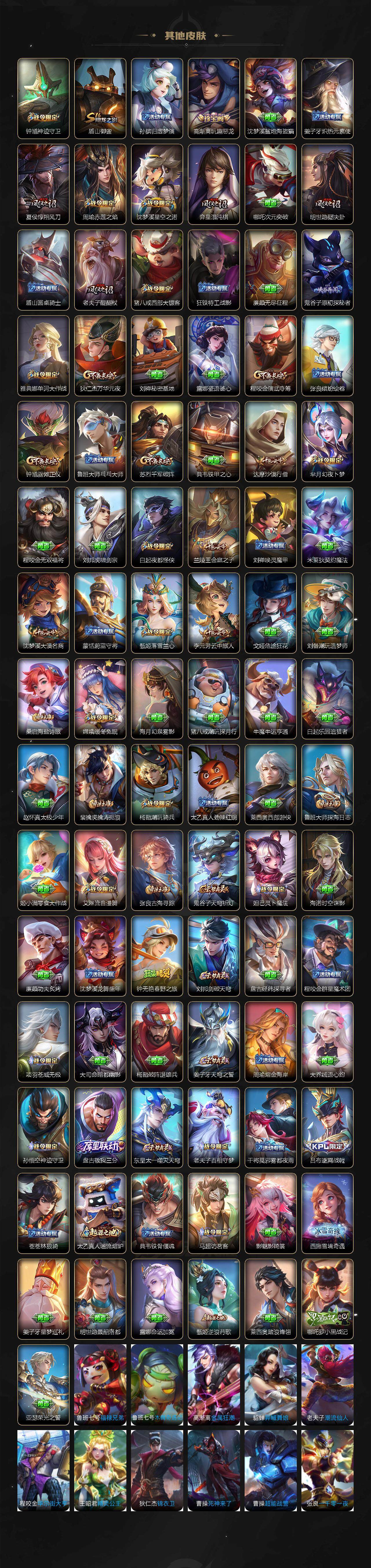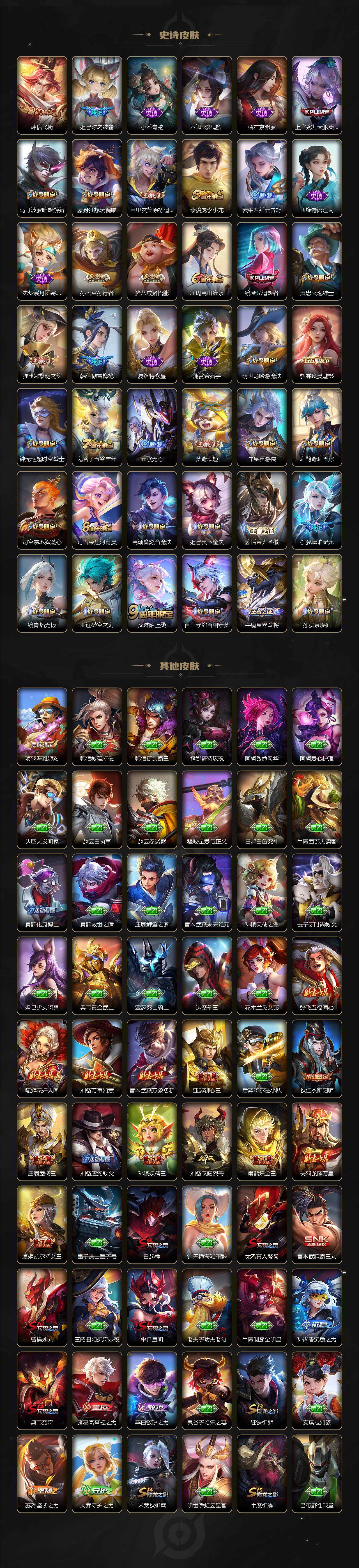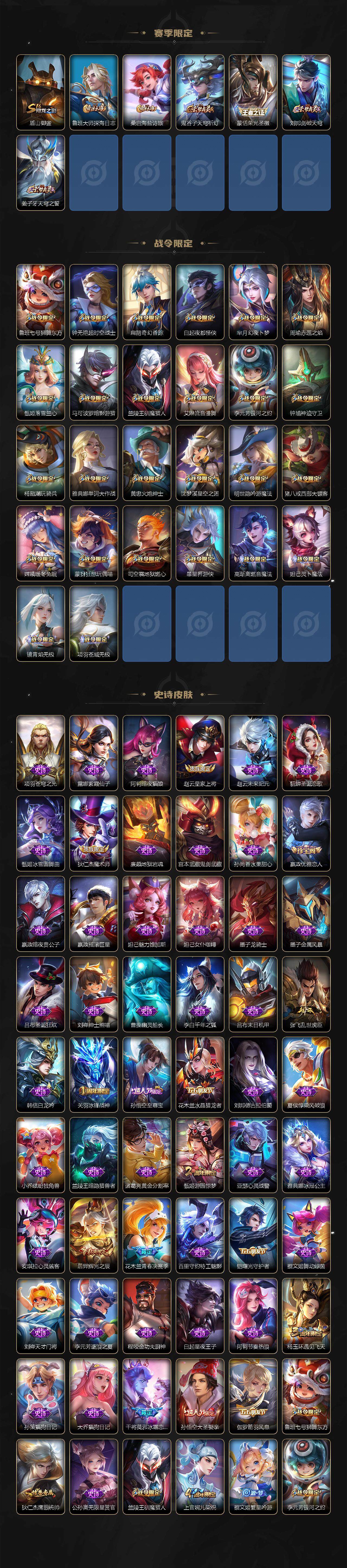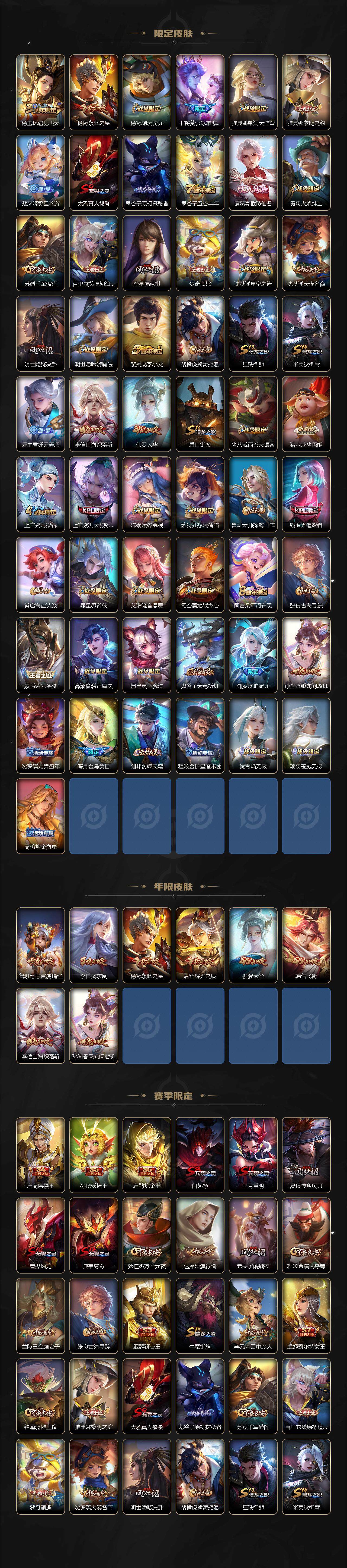 【限定皮肤】:白起狰,夏侯惇霜北刀,大乔绒语心约,姜子牙天穹之誓,杨戬破阵退雄兵,狄仁杰阴阳师,虞姬凯尔特女王,赵云皇家上将,妲己时之彼端,嬴政优雅恋人,鲁班七号狮舞东方,鲁班七号寅虎瑞焰,庄周蜃楼王,庄周高山流水,高渐离玩趣恶龙,钟无艳超时空战士,孙膑妖精王,扁鹊炼金王,扁鹊奇幻香踪,白起夜都怪侠,芈月重明,芈月幻夜卜梦,周瑜赤莲之焰,元歌无心,夏侯惇朔风刀,甄姬游园惊梦,甄姬落雪兰心,曹操烛龙,典韦穷奇,马可波罗暗影游猎,马可波罗深海之息,狄仁杰魔术师,狄仁杰万华元夜,达摩沙漠行僧,项羽海滩派对,老夫子醍醐杖,关羽冰锋战神,程咬金演武夺筹,韩信飞衡,韩信傲雪梅枪,兰陵王驯魔猎人,兰陵王金庭之子,花木兰青春决赛季,亚瑟狮心王,孙悟空至尊宝,孙悟空大圣娶亲,孙悟空孙行者,牛魔御旌,后羿辉光之辰,李元芳银河之约,李元芳云中旅人,虞姬启明星使,钟馗神迹守卫,钟馗驱傩正仪,杨玉环遇见飞天,杨戬永曜之星,杨戬潮玩骑兵,干将莫邪冰霜恋舞曲,雅典娜单词大作战,雅典娜黎明之约,蔡文姬繁星吟游,太乙真人饕餮,鬼谷子原初探秘者,鬼谷子五谷丰年,诸葛亮武陵仙君,黄忠火炮绅士,苏烈千军破阵,百里玄策原初追逐者,弈星混沌棋,梦奇顽趣,沈梦溪星空之诺,沈梦溪大漠名商,明世隐疑决卦,明世隐吟游魔法,裴擒虎李小龙,裴擒虎擒涛扼浪,狂铁御狮,米莱狄御霄,云中君纤云弄巧,李信山海炽霜斩,伽罗太华,盾山御銮,猪八戒西部大镖客,猪八戒猪悟能,上官婉儿梁祝,上官婉儿天狼绘梦者,嫦娥暖冬