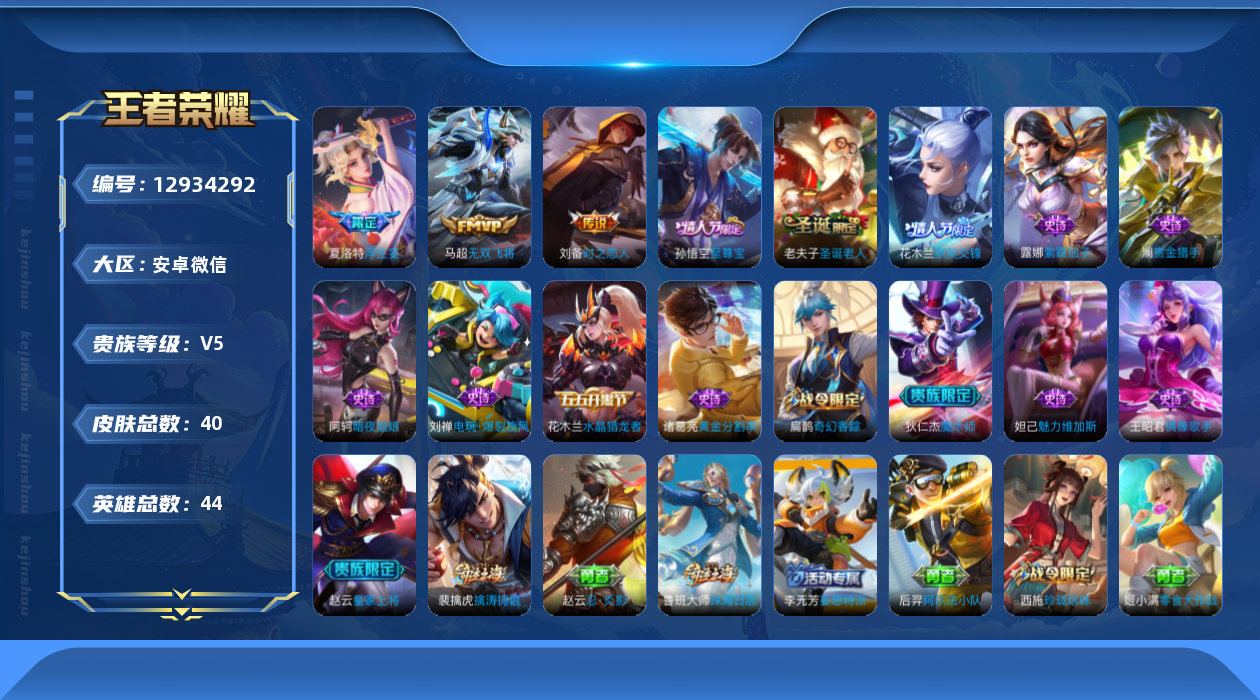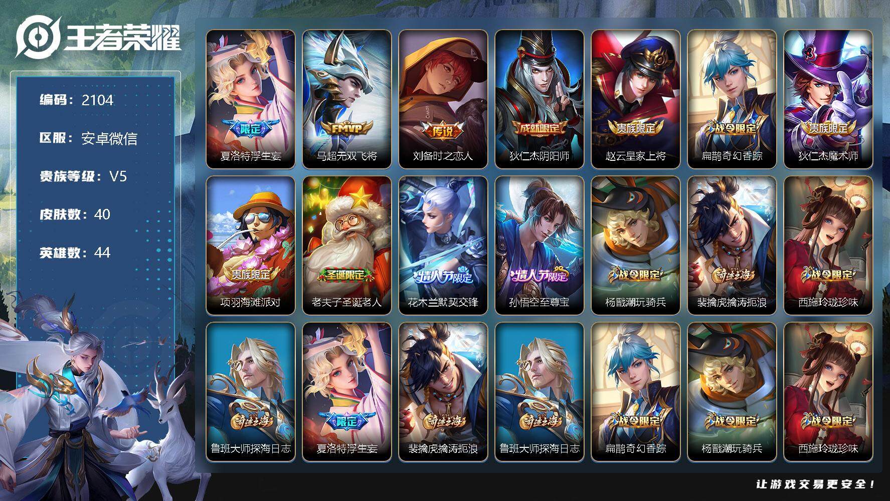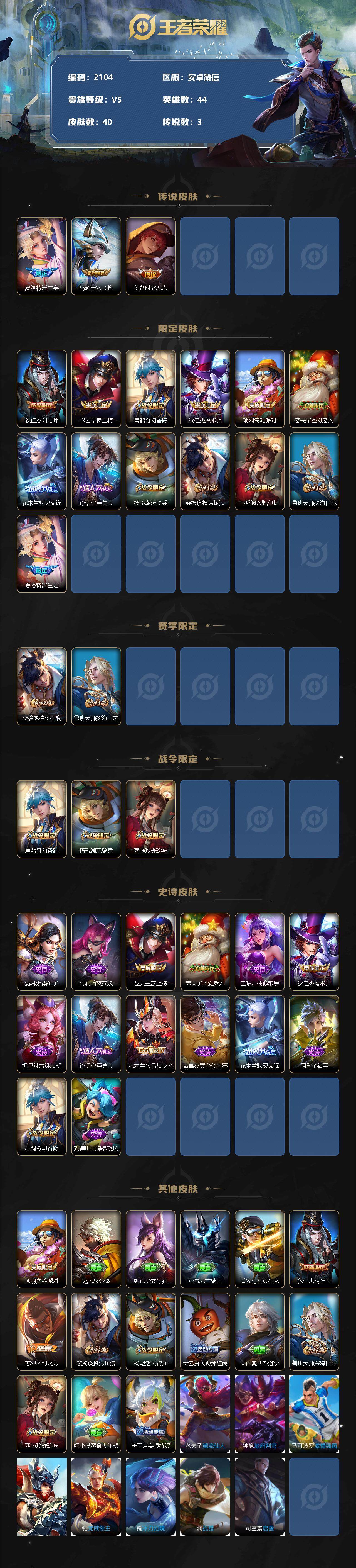 [12934292]安卓WX-V0-尊贵铂金II段位-44英雄-40皮肤-0典藏-0珍品无双-0无双-0珍品传说-3传说-14史诗
