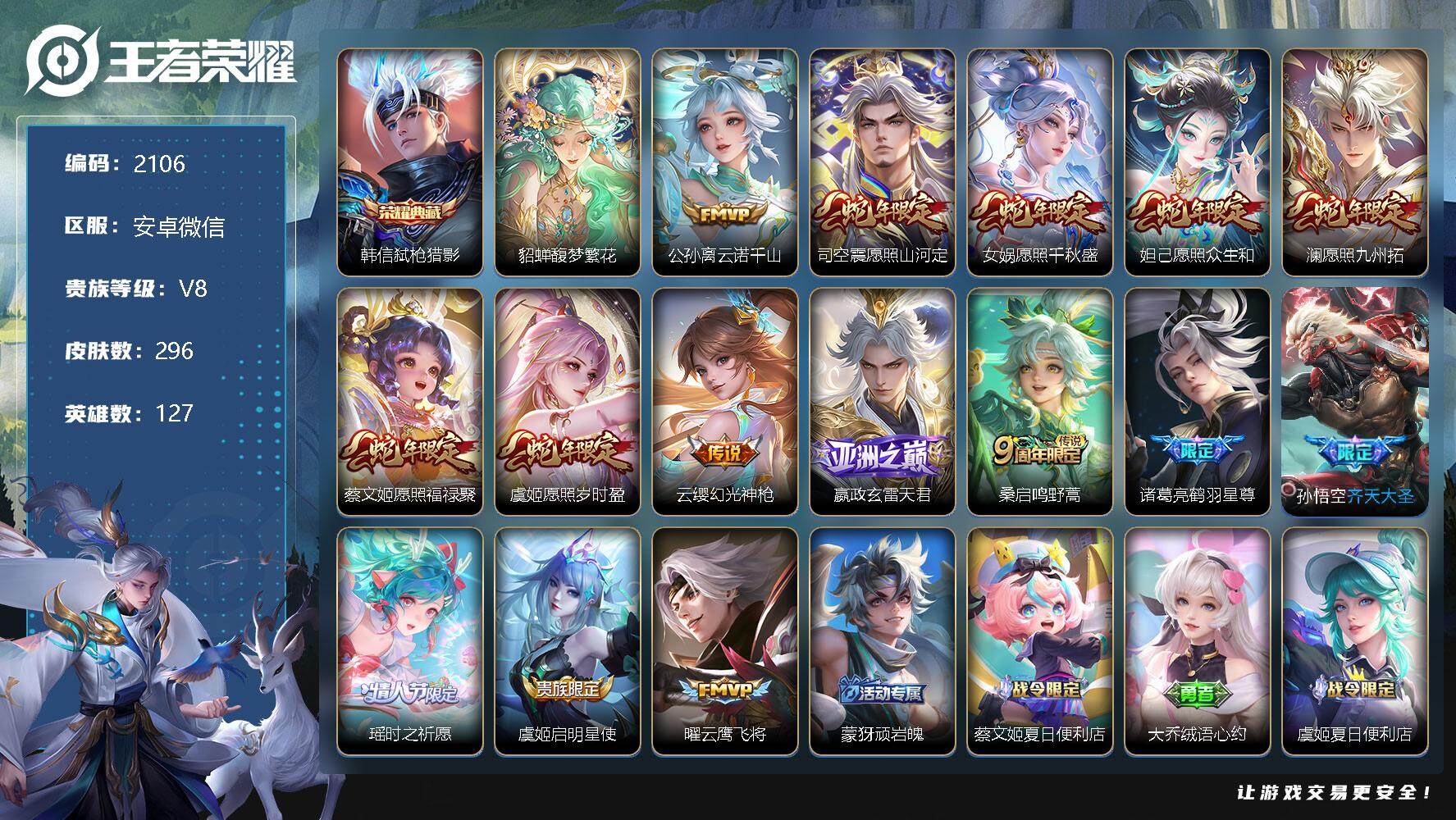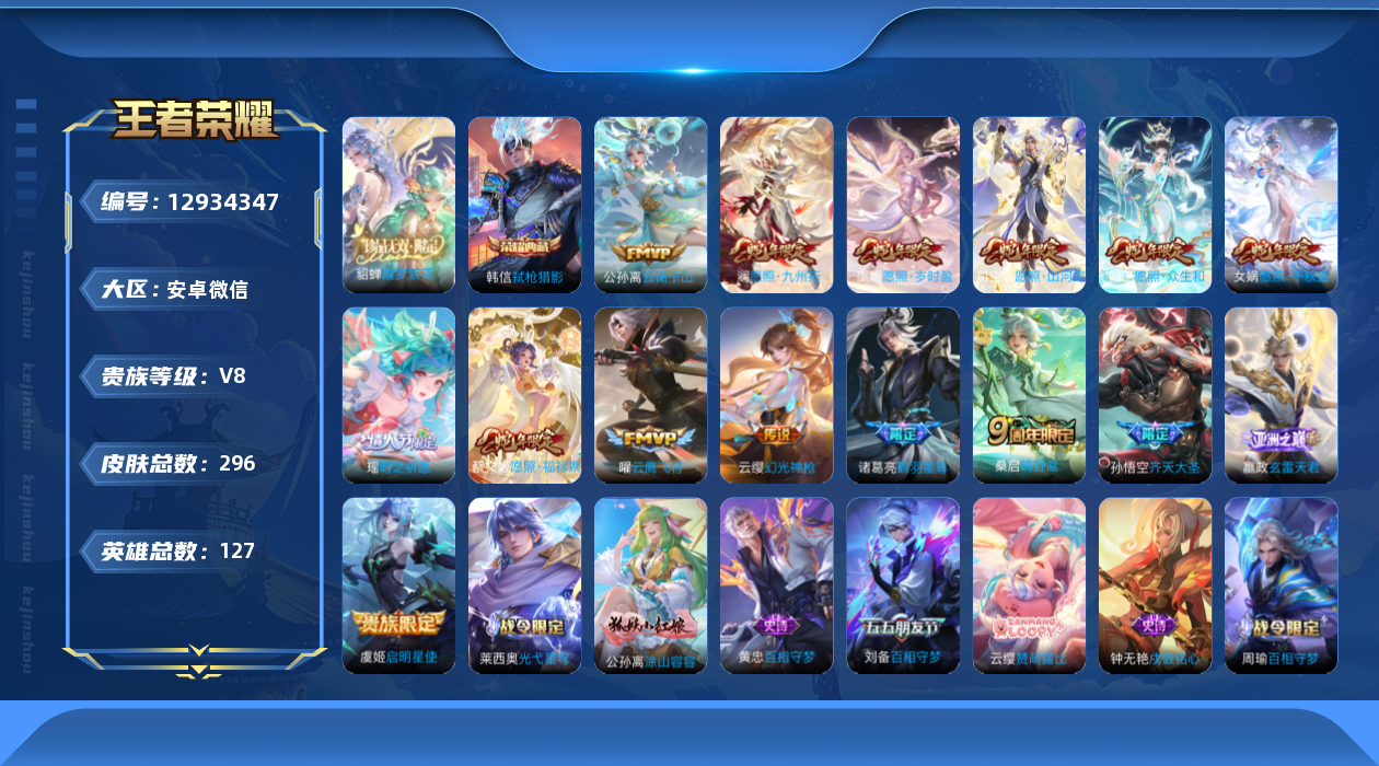 [12934347]安卓WX-V8-最强王者段位-127英雄-296皮肤-1典藏-1珍品无双-0无双-0珍品传说-15传说-84史诗 【英雄全皮】:孙权全皮,司空震全皮,空空儿全皮,影全皮 【荣耀典藏】:韩信弑枪猎影 【珍品无双】:貂蝉馥梦繁花 【传说皮肤】:公孙离云诺千山,司空震愿照山河定,女娲愿照千秋盛,妲己愿照众生和,澜愿照九州拓,蔡文姬愿照福禄聚,虞姬愿照岁时盈,云缨幻光神枪,嬴政玄雷天君,桑启鸣野蒿,诸葛亮鹤羽星尊,孙悟空齐天大圣,瑶时之祈愿,虞姬启明星使,曜云鹰飞将 【限定皮肤】:蒙犽顽岩魄,蔡文姬夏日便利店,大乔绒语心约,虞姬夏日便利店,姜子牙天穹之誓,李白谪仙醉月,狄仁杰阴阳师,赵云皇家上将,孙尚香蔷薇恋人,高渐离死亡摇滚,钟无艳超时空战士,扁鹊奇幻香踪,元歌无心,甄姬落雪兰心,狄仁杰魔术师,项羽海滩派对,老夫子醍醐杖,孙悟空孙行者,孙悟空齐天大圣,后羿辉光之辰,后羿圣弓游侠,刘备百相守梦,李元芳云中旅人,虞姬启明星使,杨戬潮玩骑兵,鬼谷子五谷丰年,诸葛亮鹤羽星尊,梦奇顽趣,沈梦溪大漠名商,裴擒虎擒涛扼浪,瑶时之祈愿,云中君纤云弄巧,云中君时之祈愿,嫦娥拒霜思,嫦娥暖冬兔眠,西施玲珑珍味,鲁班大师探海日志,桑启海盐诗旅,暃星界游侠,戈娅驭风魔法,艾琳流音漫舞,司空震地狱燃心,阿古朵江河有灵,张良古海寻踪,蒙犽百解令,蒙恬荣光圣徽,高渐离燃音魔法,妲己灵卜魔法,鬼谷子天穹祈灯,姬小满妄想食味,沈梦溪龙舞盛年,鲁班七号蔬乡物语,李元芳蔬乡物语,刘邦剑破天穹,上官婉儿群星魔术团,程咬金群星魔术团,镜青焰无极,项羽苍威无极,刘备异域游侠,周瑜熔金海岸 【年限皮肤】:后羿辉光之辰 【赛季限定】:老夫子醍醐杖,张良古海寻踪,李元芳云中旅人,梦奇顽趣,沈梦溪大漠名商,裴擒虎擒涛扼浪,鲁班大师探海日志,桑启海盐诗旅,鬼谷子天穹祈灯,蒙恬荣光圣徽,刘邦剑破天穹,姜子牙天穹之誓 【战令限定】:蔡文姬夏日便利店,虞姬夏日便利店,钟无艳超时空战士,扁鹊奇幻香踪,甄姬落雪兰心,艾琳流音漫舞,后羿圣弓游侠,杨戬潮玩骑兵,嫦娥暖冬兔眠,西施玲珑珍味,司空震地狱燃心,暃星界游侠,戈娅驭风魔法,高渐离燃音魔法,妲己灵卜魔法,鲁班七号蔬乡物语,李元芳蔬乡物语,镜青焰无极,项羽苍威无极 【史诗皮肤】:露娜紫霞仙子,赵云皇家上将,赵云未来纪元,貂蝉圣诞恋歌,甄姬冰雪圆舞曲,王昭君偶像歌手,狄仁杰魔术师,廉颇