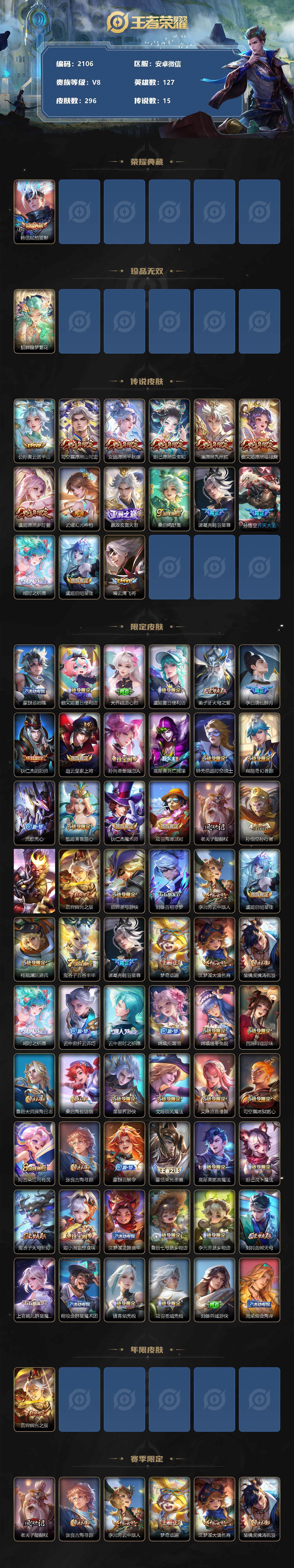 [12934347]安卓WX-V8-最强王者段位-127英雄-296皮肤-1典藏-1珍品无双-0无双-0珍品传说-15传说-84史诗