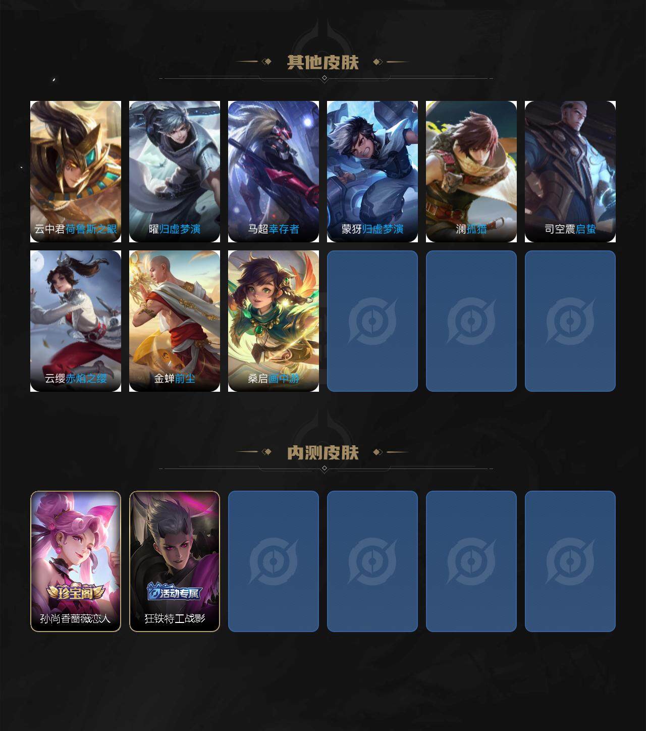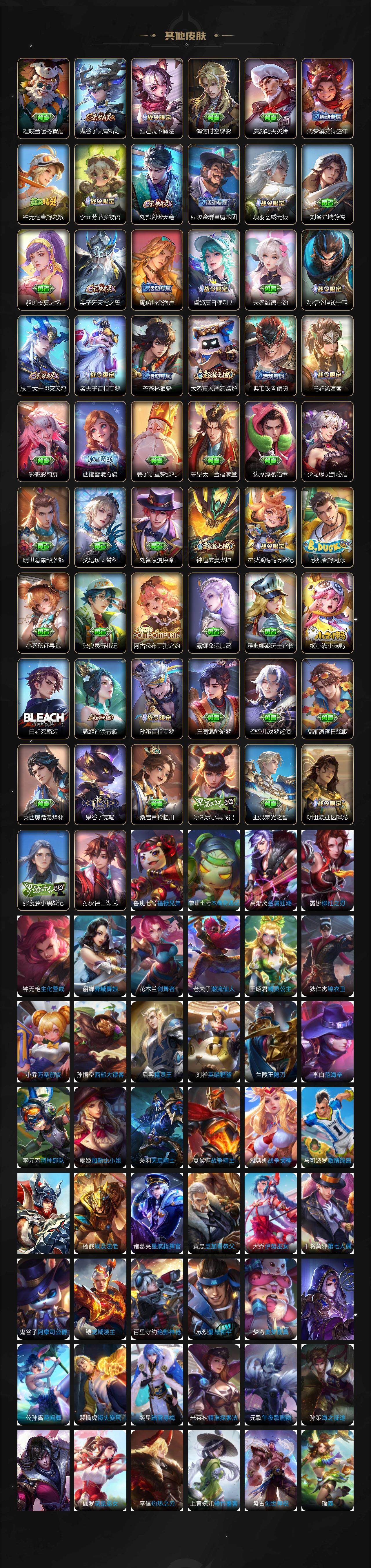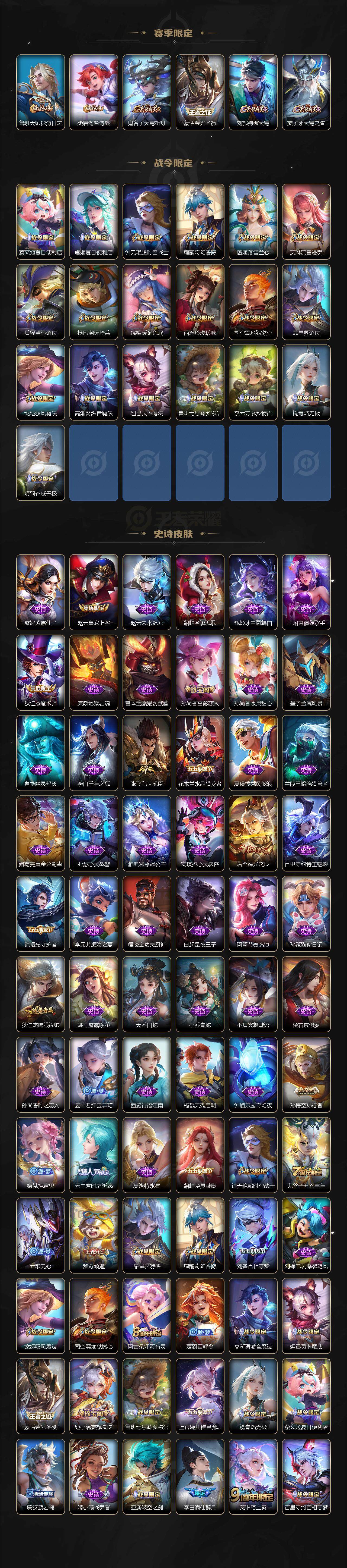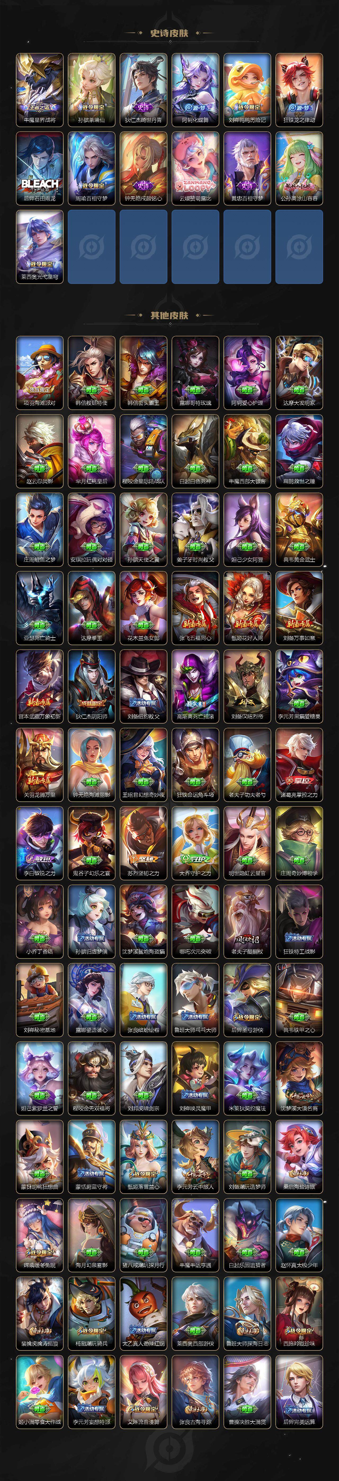 【限定皮肤】:蒙犽顽岩魄,蔡文姬夏日便利店,大乔绒语心约,虞姬夏日便利店,姜子牙天穹之誓,李白谪仙醉月,狄仁杰阴阳师,赵云皇家上将,孙尚香蔷薇恋人,高渐离死亡摇滚,钟无艳超时空战士,扁鹊奇幻香踪,元歌无心,甄姬落雪兰心,狄仁杰魔术师,项羽海滩派对,老夫子醍醐杖,孙悟空孙行者,孙悟空齐天大圣,后羿辉光之辰,后羿圣弓游侠,刘备百相守梦,李元芳云中旅人,虞姬启明星使,杨戬潮玩骑兵,鬼谷子五谷丰年,诸葛亮鹤羽星尊,梦奇顽趣,沈梦溪大漠名商,裴擒虎擒涛扼浪,瑶时之祈愿,云中君纤云弄巧,云中君时之祈愿,嫦娥拒霜思,嫦娥暖冬兔眠,西施玲珑珍味,鲁班大师探海日志,桑启海盐诗旅,暃星界游侠,戈娅驭风魔法,艾琳流音漫舞,司空震地狱燃心,阿古朵江河有灵,张良古海寻踪,蒙犽百解令,蒙恬荣光圣徽,高渐离燃音魔法,妲己灵卜魔法,鬼谷子天穹祈灯,姬小满妄想食味,沈梦溪龙舞盛年,鲁班七号蔬乡物语,李元芳蔬乡物语,刘邦剑破天穹,上官婉儿群星魔术团,程咬金群星魔术团,镜青焰无极,项羽苍威无极,刘备异域游侠,周瑜熔金海岸