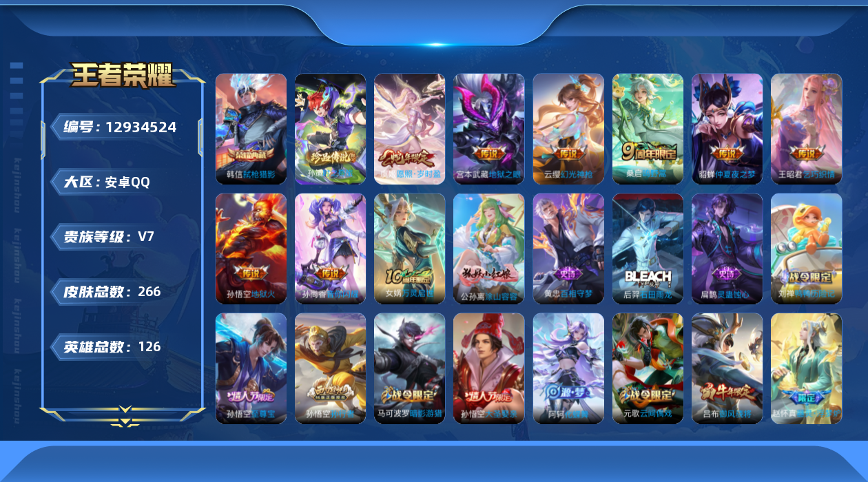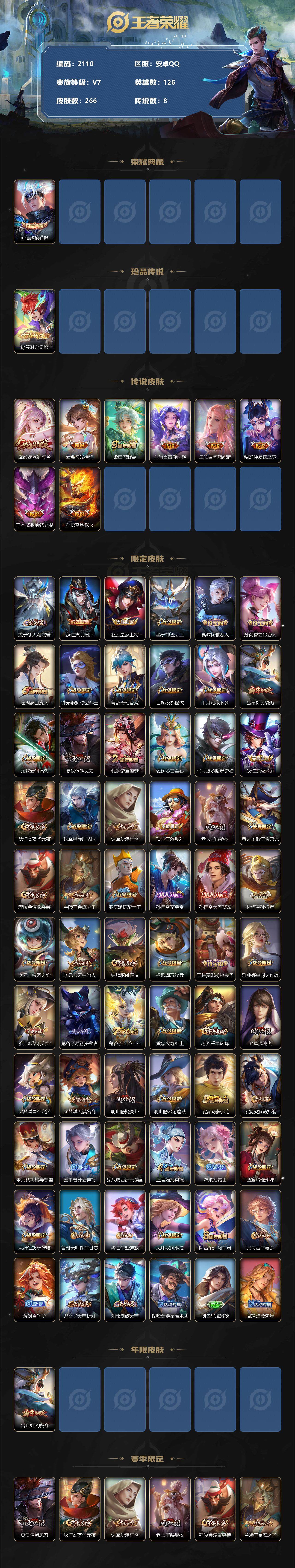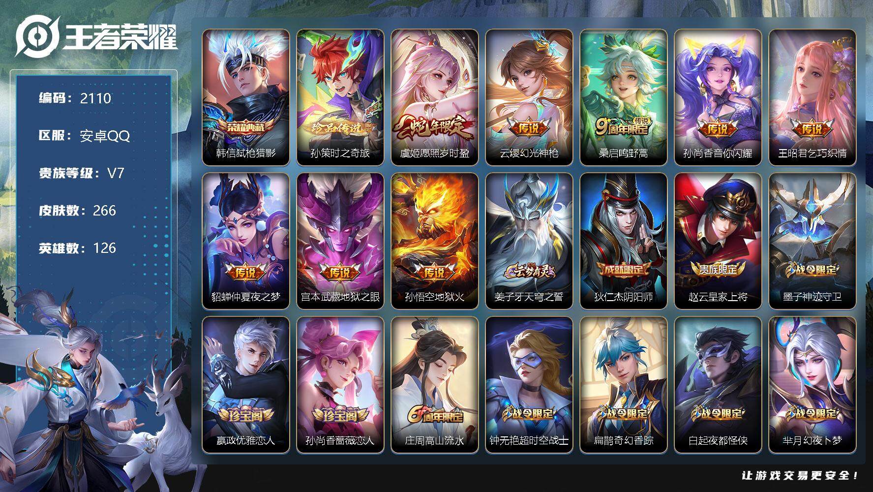 [12934524]安卓Q-V7-最强王者段位-126英雄-266皮肤-1典藏-0珍品无双-0无双-1珍品传说-8传说-80史诗