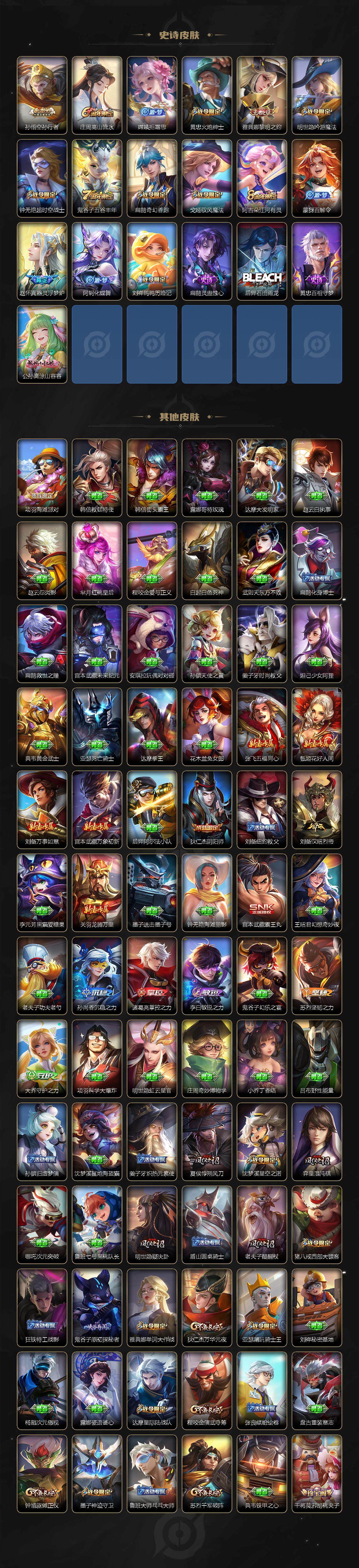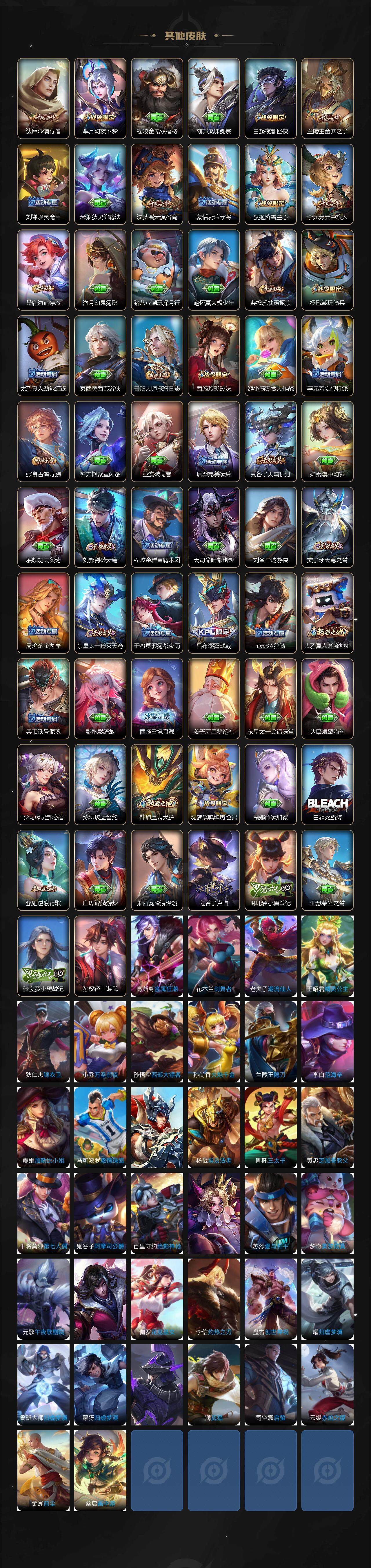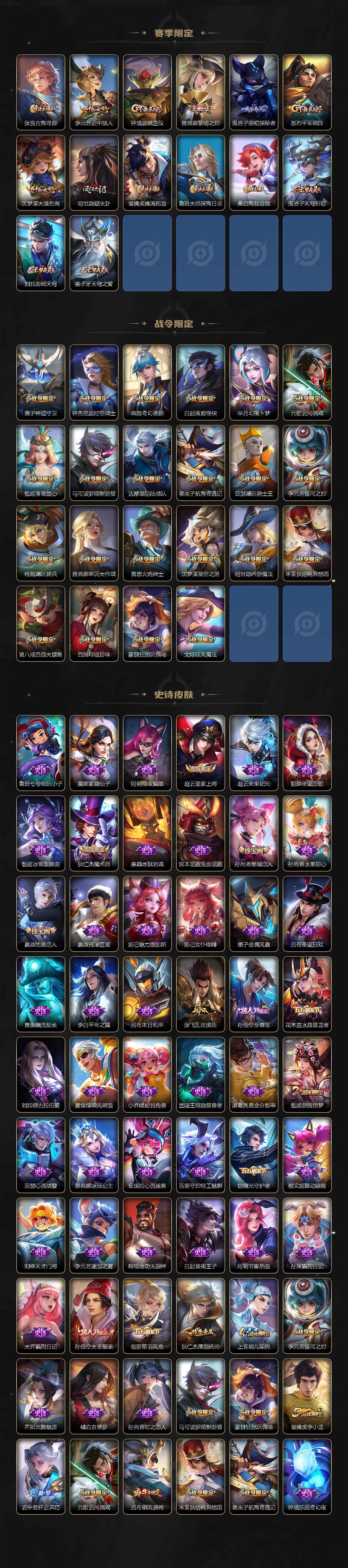 【限定皮肤】:姜子牙天穹之誓,狄仁杰阴阳师,赵云皇家上将,墨子神迹守卫,嬴政优雅恋人,孙尚香蔷薇恋人,庄周高山流水,钟无艳超时空战士,扁鹊奇幻香踪,白起夜都怪侠,芈月幻夜卜梦,吕布御风骁将,元歌云间偶戏,夏侯惇朔风刀,甄姬游园惊梦,甄姬落雪兰心,马可波罗暗影游猎,狄仁杰魔术师,狄仁杰万华元夜,达摩星际陆战队,达摩沙漠行僧,项羽海滩派对,老夫子醍醐杖,老夫子航海奇遇记,程咬金演武夺筹,兰陵王金庭之子,亚瑟潮玩骑士王,孙悟空至尊宝,孙悟空大圣娶亲,孙悟空孙行者,李元芳银河之约,李元芳云中旅人,钟馗驱傩正仪,杨戬潮玩骑兵,干将莫邪胡桃夹子,雅典娜单词大作战,雅典娜黎明之约,鬼谷子原初探秘者,鬼谷子五谷丰年,黄忠火炮绅士,苏烈千军破阵,弈星混沌棋,沈梦溪星空之诺,沈梦溪大漠名商,明世隐疑决卦,明世隐吟游魔法,裴擒虎李小龙,裴擒虎擒涛扼浪,米莱狄胡桃异想国,云中君纤云弄巧,猪八戒西部大镖客,上官婉儿梁祝,嫦娥拒霜思,西施玲珑珍味,蒙犽狂想玩偶喵,鲁班大师探海日志,桑启海盐诗旅,戈娅驭风魔法,阿古朵江河有灵,张良古海寻踪,蒙犽百解令,鬼谷子天穹祈灯,刘邦剑破天穹,程咬金群星魔术团,刘备异域游侠,周瑜熔金海岸