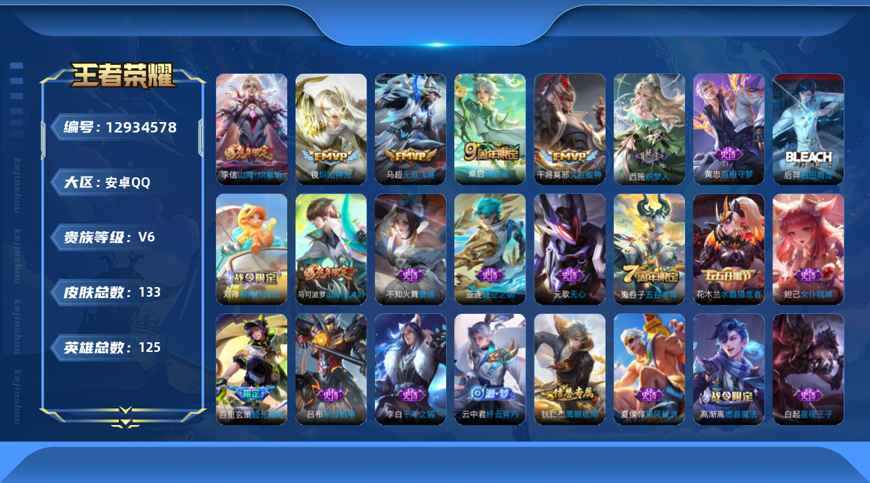 [12934578]安卓Q-V4-最强王者段位-125英雄-133皮肤-0典藏-0珍品无双-0无双-0珍品传说-5传说-41史诗