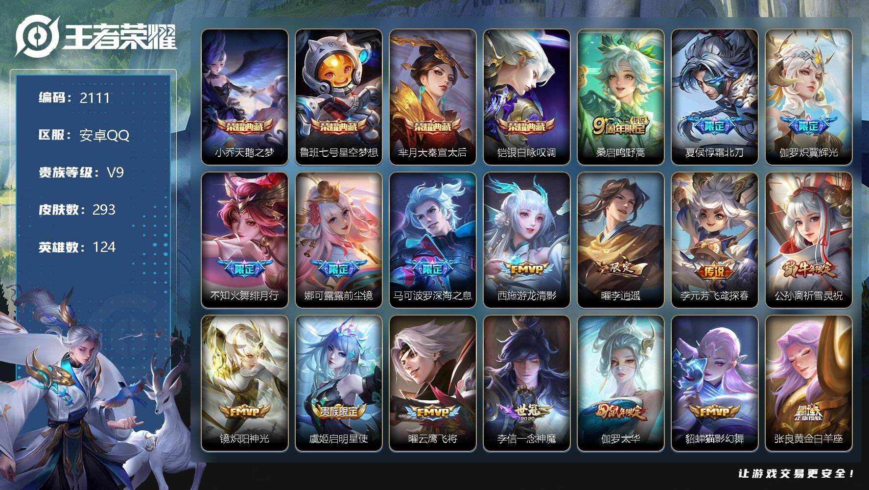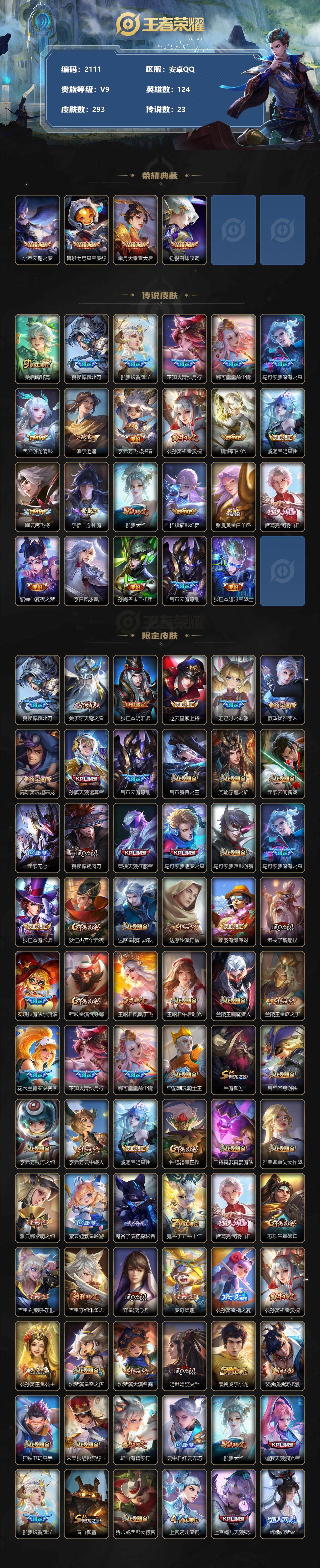[12934592]安卓Q-V4-最强王者段位-124英雄-293皮肤-4典藏-0珍品无双-0无双-0珍品传说-23传说-85史诗