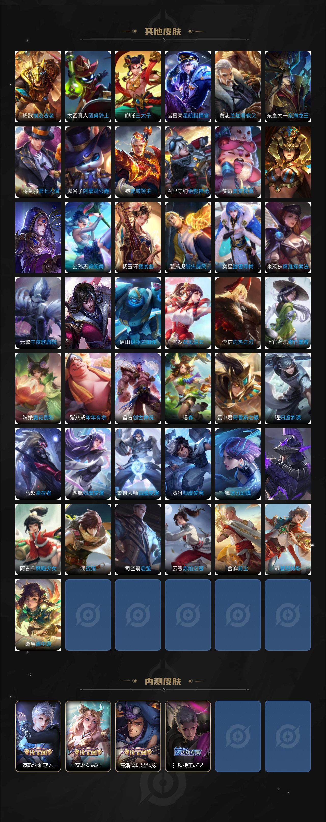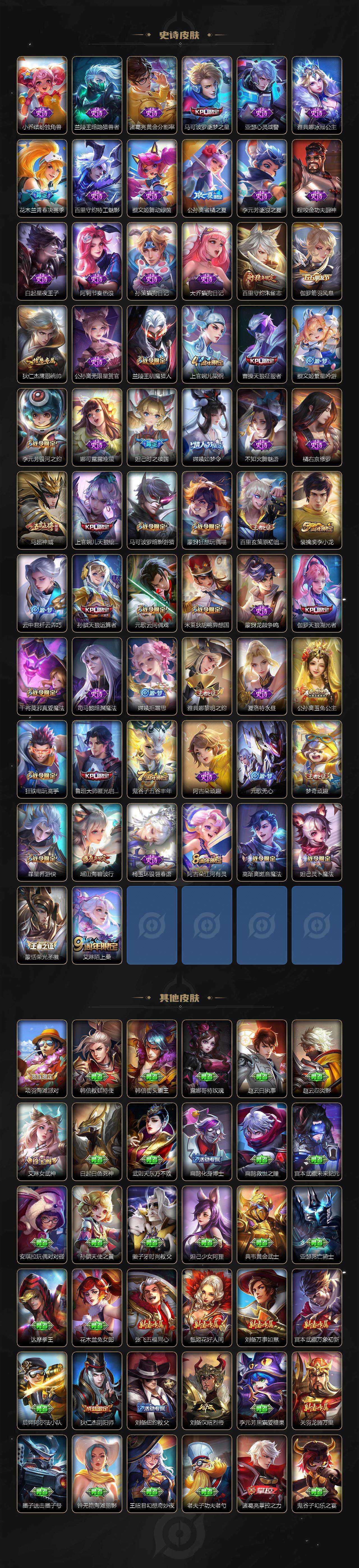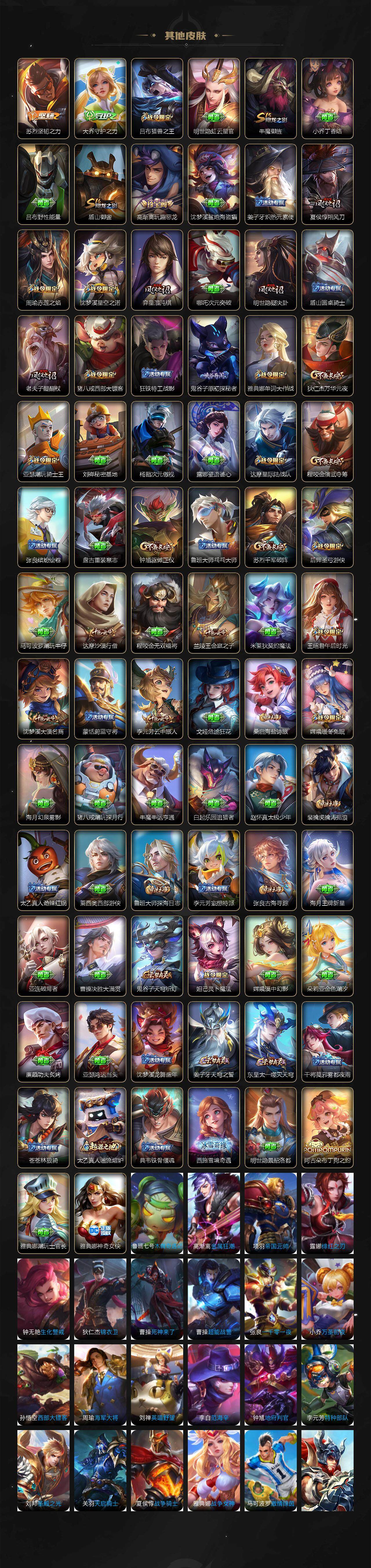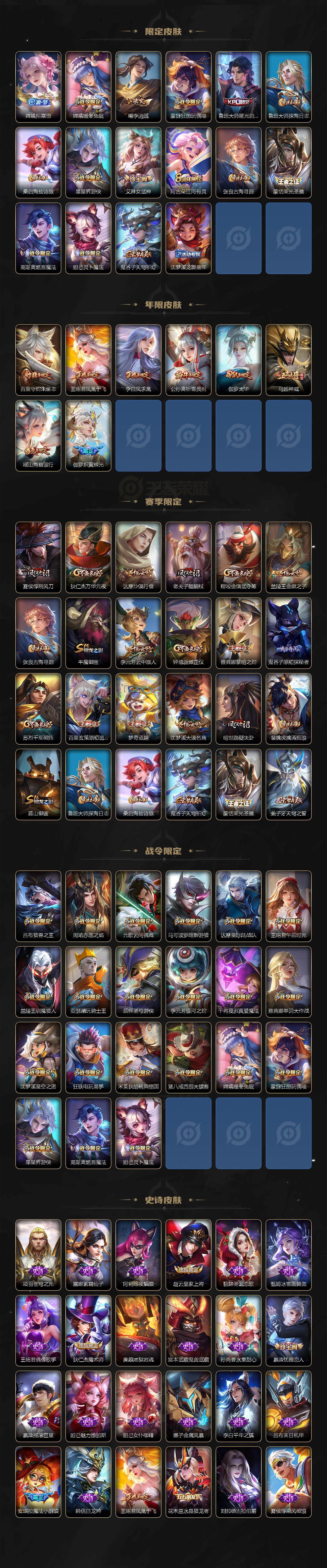 【限定皮肤】:夏侯惇霜北刀,姜子牙天穹之誓,狄仁杰阴阳师,赵云皇家上将,妲己时之彼端,嬴政优雅恋人,高渐离玩趣恶龙,孙膑天狼运算者,吕布天魔缭乱,吕布猎兽之王,周瑜赤莲之焰,元歌云间偶戏,元歌无心,夏侯惇朔风刀,曹操天狼征服者,马可波罗逐梦之星,马可波罗暗影游猎,马可波罗深海之息,狄仁杰魔术师,狄仁杰万华元夜,达摩星际陆战队,达摩沙漠行僧,项羽海滩派对,老夫子醍醐杖,安琪拉魔法小厨娘,程咬金演武夺筹,王昭君凤凰于飞,王昭君午后时光,兰陵王驯魔猎人,兰陵王金庭之子,花木兰青春决赛季,不知火舞绯月行,娜可露露前尘镜,亚瑟潮玩骑士王,牛魔御旌,后羿圣弓游侠,李元芳银河之约,李元芳云中旅人,虞姬启明星使,钟馗驱傩正仪,干将莫邪真爱魔法,雅典娜单词大作战,雅典娜黎明之约,蔡文姬繁星吟游,鬼谷子原初探秘者,鬼谷子五谷丰年,诸葛亮武陵仙君,苏烈千军破阵,百里玄策原初追逐者,百里守约朱雀志,弈星混沌棋,梦奇顽趣,公孙离蜜橘之夏,公孙离祈雪灵祝,公孙离玉兔公主,沈梦溪星空之诺,沈梦溪大漠名商,明世隐疑决卦,裴擒虎李小龙,裴擒虎擒涛扼浪,狂铁电玩高手,米莱狄胡桃异想国,瑶山海碧波行,云中君纤云弄巧,伽罗太华,伽罗天狼溯光者,伽罗炽翼辉光,盾山御銮,猪八戒西部大镖客,上官婉儿梁祝,上官婉儿天狼绘梦者,嫦娥如梦令,嫦娥拒霜思,嫦娥暖冬兔眠,曜李逍遥 ,蒙犽狂想玩偶喵,鲁班大师匿光启智者,鲁班大师探海日志,桑启海盐诗旅,暃星界游侠,艾琳女武神,阿古朵江河有灵,张良古海寻踪,蒙恬荣光圣徽,高渐离燃音魔法,妲己灵卜魔法,鬼谷子天穹祈灯,沈梦溪龙舞盛年
