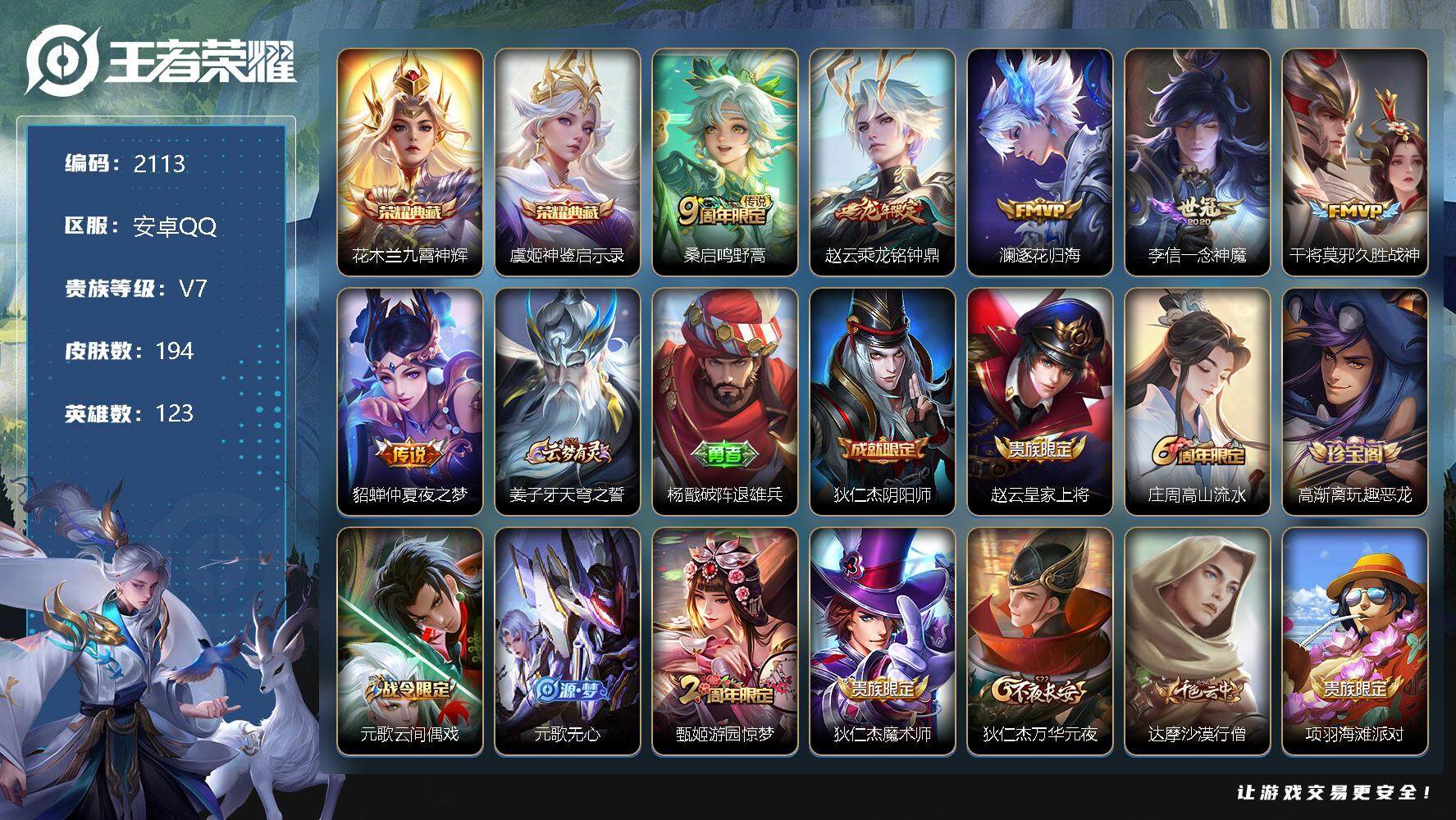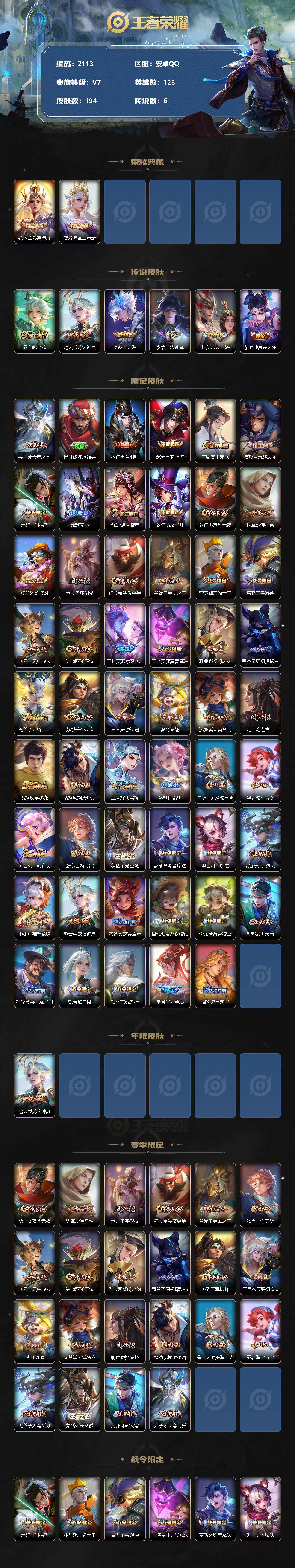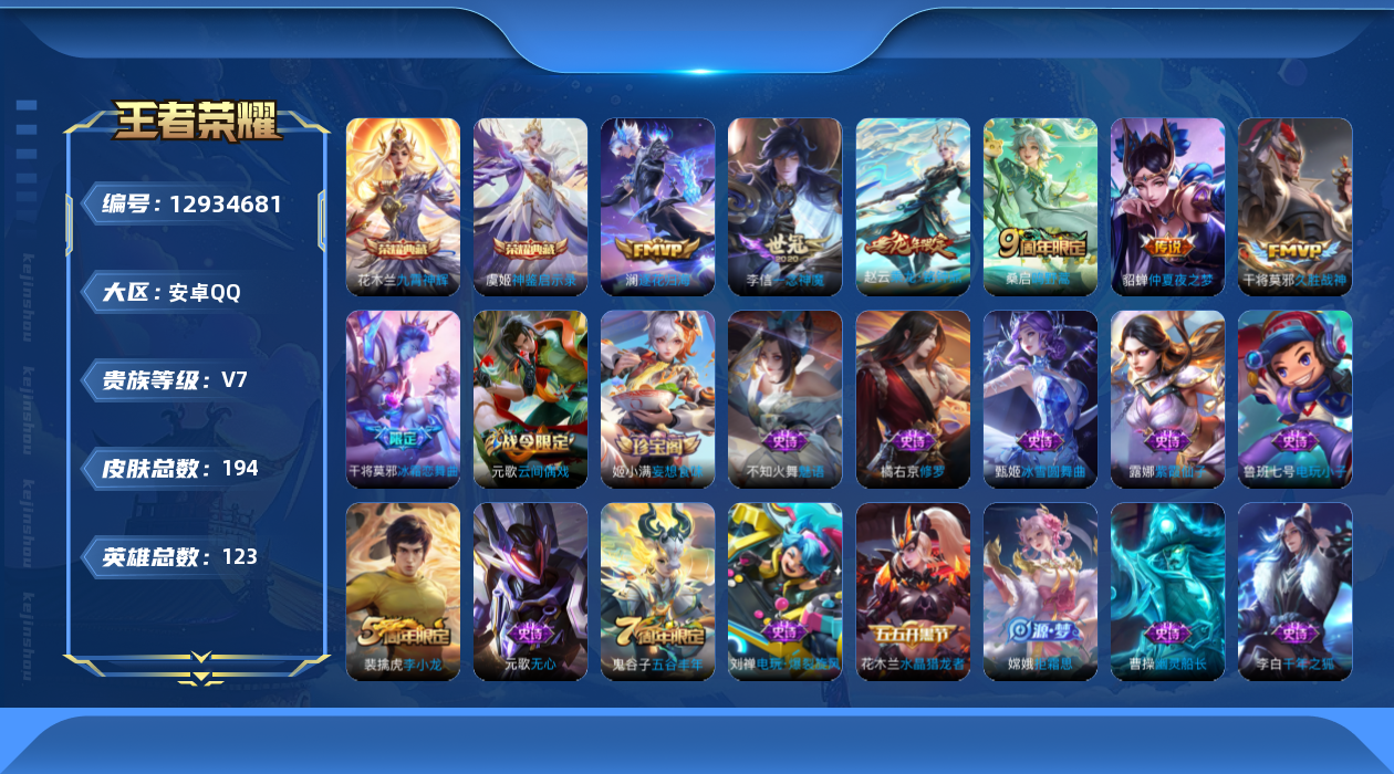 [12934681]安卓Q-V4-最强王者段位-123英雄-194皮肤-2典藏-0珍品无双-0无双-0珍品传说-6传说-54史诗