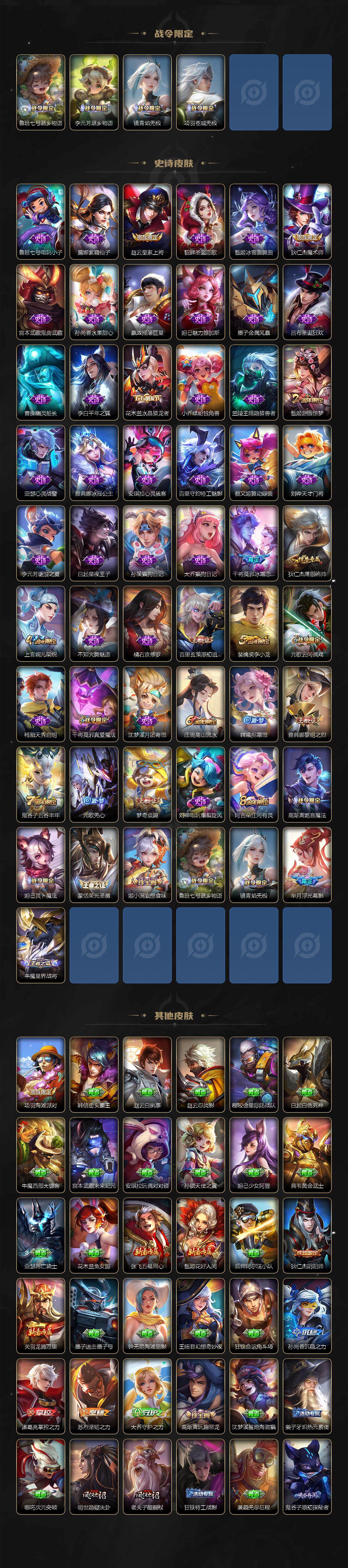 【限定皮肤】:姜子牙天穹之誓,杨戬破阵退雄兵,狄仁杰阴阳师,赵云皇家上将,庄周高山流水,高渐离玩趣恶龙,元歌云间偶戏,元歌无心,甄姬游园惊梦,狄仁杰魔术师,狄仁杰万华元夜,达摩沙漠行僧,项羽海滩派对,老夫子醍醐杖,程咬金演武夺筹,兰陵王金庭之子,亚瑟潮玩骑士王,后羿圣弓游侠,李元芳云中旅人,钟馗驱傩正仪,干将莫邪冰霜恋舞曲,干将莫邪真爱魔法,雅典娜黎明之约,鬼谷子原初探秘者,鬼谷子五谷丰年,苏烈千军破阵,百里玄策原初追逐者,梦奇顽趣,沈梦溪大漠名商,明世隐疑决卦,裴擒虎李小龙,裴擒虎擒涛扼浪,上官婉儿梁祝,嫦娥拒霜思,鲁班大师探海日志,桑启海盐诗旅,阿古朵江河有灵,张良古海寻踪,蒙恬荣光圣徽,高渐离燃音魔法,妲己灵卜魔法,鬼谷子天穹祈灯,姬小满妄想食味,赵云乘龙铭钟鼎,沈梦溪龙舞盛年,鲁班七号蔬乡物语,李元芳蔬乡物语,刘邦剑破天穹,程咬金群星魔术团,镜青焰无极,项羽苍威无极,芈月浮光幕影,周瑜熔金海岸