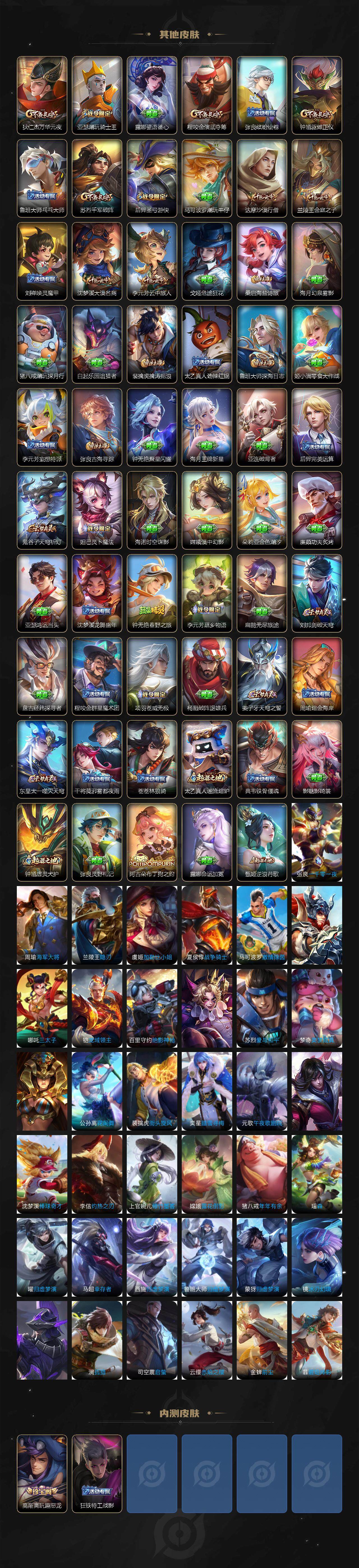 【赛季限定】:狄仁杰万华元夜,达摩沙漠行僧,老夫子醍醐杖,程咬金演武夺筹,兰陵王金庭之子,张良古海寻踪,李元芳云中旅人,钟馗驱傩正仪,雅典娜黎明之约,鬼谷子原初探秘者,苏烈千军破阵,百里玄策原初追逐者,梦奇顽趣,沈梦溪大漠名商,明世隐疑决卦,裴擒虎擒涛扼浪,鲁班大师探海日志,桑启海盐诗旅,鬼谷子天穹祈灯,蒙恬荣光圣徽,刘邦剑破天穹,姜子牙天穹之誓